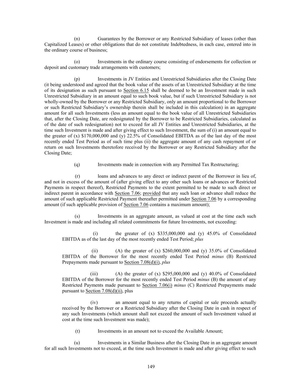 (n) Guarantees by the Borrower or any Restricted Subsidiary of leases (other than Capitalized Leases) or other obligations that do not constitute Indebtedness, in each case, entered into in the ordinary course of business; (o) Investments in the ordinary course consisting of endorsements for collection or deposit and customary trade arrangements with customers; (p) Investments in JV Entities and Unrestricted Subsidiaries after the Closing Date (it being understood and agreed that the book value of the assets of an Unrestricted Subsidiary at the time of its designation as such pursuant to Section 6.15 shall be deemed to be an Investment made in such Unrestricted Subsidiary in an amount equal to such book value, but if such Unrestricted Subsidiary is not wholly-owned by the Borrower or any Restricted Subsidiary, only an amount proportional to the Borrower or such Restricted Subsidiary’s ownership therein shall be included in this calculation) in an aggregate amount for all such Investments (less an amount equal to the book value of all Unrestricted Subsidiaries that, after the Closing Date, are redesignated by the Borrower to be Restricted Subsidiaries, calculated as of the date of such redesignation) not to exceed for all JV Entities and Unrestricted Subsidiaries, at the time such Investment is made and after giving effect to such Investment, the sum of (i) an amount equal to the greater of (x) $170,000,000 and (y) 22.5% of Consolidated EBITDA as of the last day of the most recently ended Test Period as of such time plus (ii) the aggregate amount of any cash repayment of or return on such Investments theretofore received by the Borrower or any Restricted Subsidiary after the Closing Date; (q) Investments made in connection with any Permitted Tax Restructuring; (r) loans and advances to any direct or indirect parent of the Borrower in lieu of, and not in excess of the amount of (after giving effect to any other such loans or advances or Restricted Payments in respect thereof), Restricted Payments to the extent permitted to be made to such direct or indirect parent in accordance with Section 7.06; provided that any such loan or advance shall reduce the amount of such applicable Restricted Payment thereafter permitted under Section 7.06 by a corresponding amount (if such applicable provision of Section 7.06 contains a maximum amount); (s) Investments in an aggregate amount, as valued at cost at the time each such Investment is made and including all related commitments for future Investments, not exceeding: (i) the greater of (x) $335,000,000 and (y) 45.0% of Consolidated EBITDA as of the last day of the most recently ended Test Period; plus (ii) (A) the greater of (x) $260,000,000 and (y) 35.0% of Consolidated EBITDA of the Borrower for the most recently ended Test Period minus (B) Restricted Prepayments made pursuant to Section 7.08(d)(i), plus (iii) (A) the greater of (x) $295,000,000 and (y) 40.0% of Consolidated EBITDA of the Borrower for the most recently ended Test Period minus (B) the amount of any Restricted Payments made pursuant to Section 7.06(i) minus (C) Restricted Prepayments made pursuant to Section 7.08(d)(ii), plus (iv) an amount equal to any returns of capital or sale proceeds actually received by the Borrower or a Restricted Subsidiary after the Closing Date in cash in respect of any such Investments (which amount shall not exceed the amount of such Investment valued at cost at the time such Investment was made); (t) Investments in an amount not to exceed the Available Amount; (u) Investments in a Similar Business after the Closing Date in an aggregate amount for all such Investments not to exceed, at the time such Investment is made and after giving effect to such 149