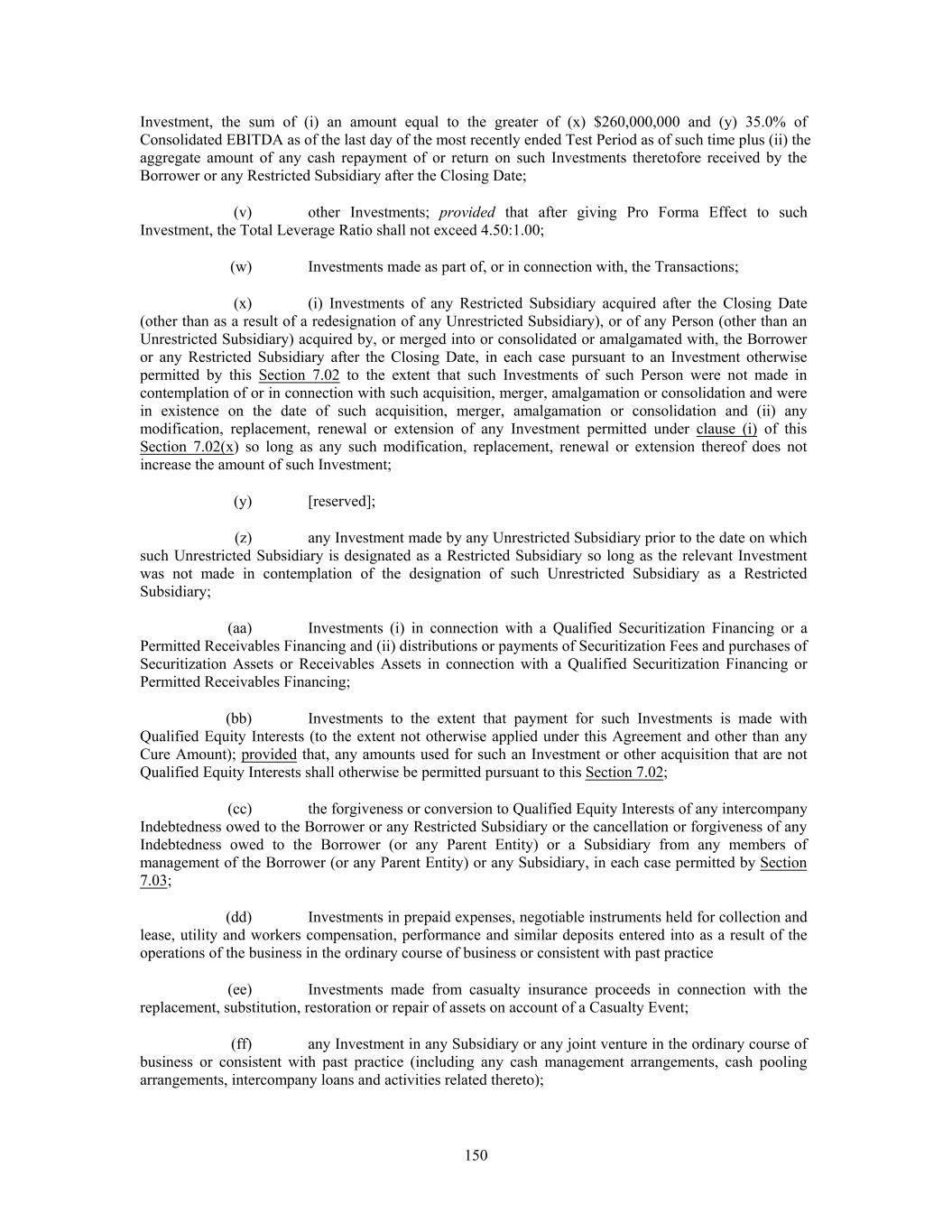 Investment, the sum of (i) an amount equal to the greater of (x) $260,000,000 and (y) 35.0% of Consolidated EBITDA as of the last day of the most recently ended Test Period as of such time plus (ii) the aggregate amount of any cash repayment of or return on such Investments theretofore received by the Borrower or any Restricted Subsidiary after the Closing Date; (v) other Investments; provided that after giving Pro Forma Effect to such Investment, the Total Leverage Ratio shall not exceed 4.50:1.00; (w) Investments made as part of, or in connection with, the Transactions; (x) (i) Investments of any Restricted Subsidiary acquired after the Closing Date (other than as a result of a redesignation of any Unrestricted Subsidiary), or of any Person (other than an Unrestricted Subsidiary) acquired by, or merged into or consolidated or amalgamated with, the Borrower or any Restricted Subsidiary after the Closing Date, in each case pursuant to an Investment otherwise permitted by this Section 7.02 to the extent that such Investments of such Person were not made in contemplation of or in connection with such acquisition, merger, amalgamation or consolidation and were in existence on the date of such acquisition, merger, amalgamation or consolidation and (ii) any modification, replacement, renewal or extension of any Investment permitted under clause (i) of this Section 7.02(x) so long as any such modification, replacement, renewal or extension thereof does not increase the amount of such Investment; (y) [reserved]; (z) any Investment made by any Unrestricted Subsidiary prior to the date on which such Unrestricted Subsidiary is designated as a Restricted Subsidiary so long as the relevant Investment was not made in contemplation of the designation of such Unrestricted Subsidiary as a Restricted Subsidiary; (aa) Investments (i) in connection with a Qualified Securitization Financing or a Permitted Receivables Financing and (ii) distributions or payments of Securitization Fees and purchases of Securitization Assets or Receivables Assets in connection with a Qualified Securitization Financing or Permitted Receivables Financing; (bb) Investments to the extent that payment for such Investments is made with Qualified Equity Interests (to the extent not otherwise applied under this Agreement and other than any Cure Amount); provided that, any amounts used for such an Investment or other acquisition that are not Qualified Equity Interests shall otherwise be permitted pursuant to this Section 7.02; (cc) the forgiveness or conversion to Qualified Equity Interests of any intercompany Indebtedness owed to the Borrower or any Restricted Subsidiary or the cancellation or forgiveness of any Indebtedness owed to the Borrower (or any Parent Entity) or a Subsidiary from any members of management of the Borrower (or any Parent Entity) or any Subsidiary, in each case permitted by Section 7.03; (dd) Investments in prepaid expenses, negotiable instruments held for collection and lease, utility and workers compensation, performance and similar deposits entered into as a result of the operations of the business in the ordinary course of business or consistent with past practice (ee) Investments made from casualty insurance proceeds in connection with the replacement, substitution, restoration or repair of assets on account of a Casualty Event; (ff) any Investment in any Subsidiary or any joint venture in the ordinary course of business or consistent with past practice (including any cash management arrangements, cash pooling arrangements, intercompany loans and activities related thereto); 150