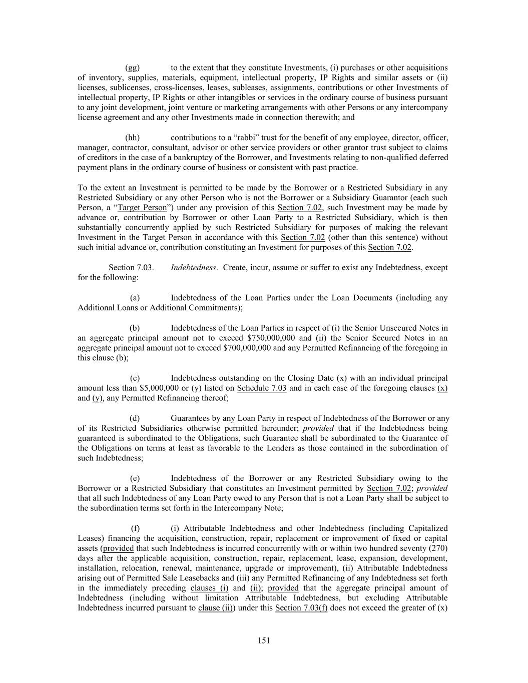 (gg) to the extent that they constitute Investments, (i) purchases or other acquisitions of inventory, supplies, materials, equipment, intellectual property, IP Rights and similar assets or (ii) licenses, sublicenses, cross-licenses, leases, subleases, assignments, contributions or other Investments of intellectual property, IP Rights or other intangibles or services in the ordinary course of business pursuant to any joint development, joint venture or marketing arrangements with other Persons or any intercompany license agreement and any other Investments made in connection therewith; and (hh) contributions to a “rabbi” trust for the benefit of any employee, director, officer, manager, contractor, consultant, advisor or other service providers or other grantor trust subject to claims of creditors in the case of a bankruptcy of the Borrower, and Investments relating to non-qualified deferred payment plans in the ordinary course of business or consistent with past practice. To the extent an Investment is permitted to be made by the Borrower or a Restricted Subsidiary in any Restricted Subsidiary or any other Person who is not the Borrower or a Subsidiary Guarantor (each such Person, a “Target Person”) under any provision of this Section 7.02, such Investment may be made by advance or, contribution by Borrower or other Loan Party to a Restricted Subsidiary, which is then substantially concurrently applied by such Restricted Subsidiary for purposes of making the relevant Investment in the Target Person in accordance with this Section 7.02 (other than this sentence) without such initial advance or, contribution constituting an Investment for purposes of this Section 7.02. Section 7.03. Indebtedness. Create, incur, assume or suffer to exist any Indebtedness, except for the following: (a) Indebtedness of the Loan Parties under the Loan Documents (including any Additional Loans or Additional Commitments); (b) Indebtedness of the Loan Parties in respect of (i) the Senior Unsecured Notes in an aggregate principal amount not to exceed $750,000,000 and (ii) the Senior Secured Notes in an aggregate principal amount not to exceed $700,000,000 and any Permitted Refinancing of the foregoing in this clause (b); (c) Indebtedness outstanding on the Closing Date (x) with an individual principal amount less than $5,000,000 or (y) listed on Schedule 7.03 and in each case of the foregoing clauses (x) and (y), any Permitted Refinancing thereof; (d) Guarantees by any Loan Party in respect of Indebtedness of the Borrower or any of its Restricted Subsidiaries otherwise permitted hereunder; provided that if the Indebtedness being guaranteed is subordinated to the Obligations, such Guarantee shall be subordinated to the Guarantee of the Obligations on terms at least as favorable to the Lenders as those contained in the subordination of such Indebtedness; (e) Indebtedness of the Borrower or any Restricted Subsidiary owing to the Borrower or a Restricted Subsidiary that constitutes an Investment permitted by Section 7.02; provided that all such Indebtedness of any Loan Party owed to any Person that is not a Loan Party shall be subject to the subordination terms set forth in the Intercompany Note; (f) (i) Attributable Indebtedness and other Indebtedness (including Capitalized Leases) financing the acquisition, construction, repair, replacement or improvement of fixed or capital assets (provided that such Indebtedness is incurred concurrently with or within two hundred seventy (270) days after the applicable acquisition, construction, repair, replacement, lease, expansion, development, installation, relocation, renewal, maintenance, upgrade or improvement), (ii) Attributable Indebtedness arising out of Permitted Sale Leasebacks and (iii) any Permitted Refinancing of any Indebtedness set forth in the immediately preceding clauses (i) and (ii); provided that the aggregate principal amount of Indebtedness (including without limitation Attributable Indebtedness, but excluding Attributable Indebtedness incurred pursuant to clause (ii)) under this Section 7.03(f) does not exceed the greater of (x) 151