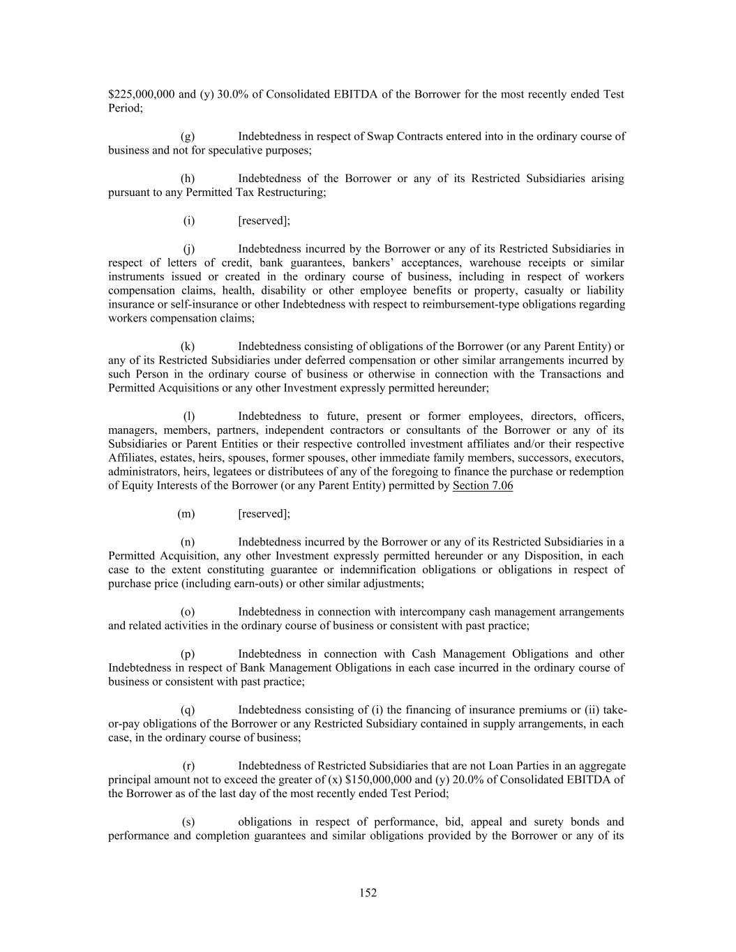 $225,000,000 and (y) 30.0% of Consolidated EBITDA of the Borrower for the most recently ended Test Period; (g) Indebtedness in respect of Swap Contracts entered into in the ordinary course of business and not for speculative purposes; (h) Indebtedness of the Borrower or any of its Restricted Subsidiaries arising pursuant to any Permitted Tax Restructuring; (i) [reserved]; (j) Indebtedness incurred by the Borrower or any of its Restricted Subsidiaries in respect of letters of credit, bank guarantees, bankers’ acceptances, warehouse receipts or similar instruments issued or created in the ordinary course of business, including in respect of workers compensation claims, health, disability or other employee benefits or property, casualty or liability insurance or self-insurance or other Indebtedness with respect to reimbursement-type obligations regarding workers compensation claims; (k) Indebtedness consisting of obligations of the Borrower (or any Parent Entity) or any of its Restricted Subsidiaries under deferred compensation or other similar arrangements incurred by such Person in the ordinary course of business or otherwise in connection with the Transactions and Permitted Acquisitions or any other Investment expressly permitted hereunder; (l) Indebtedness to future, present or former employees, directors, officers, managers, members, partners, independent contractors or consultants of the Borrower or any of its Subsidiaries or Parent Entities or their respective controlled investment affiliates and/or their respective Affiliates, estates, heirs, spouses, former spouses, other immediate family members, successors, executors, administrators, heirs, legatees or distributees of any of the foregoing to finance the purchase or redemption of Equity Interests of the Borrower (or any Parent Entity) permitted by Section 7.06 (m) [reserved]; (n) Indebtedness incurred by the Borrower or any of its Restricted Subsidiaries in a Permitted Acquisition, any other Investment expressly permitted hereunder or any Disposition, in each case to the extent constituting guarantee or indemnification obligations or obligations in respect of purchase price (including earn-outs) or other similar adjustments; (o) Indebtedness in connection with intercompany cash management arrangements and related activities in the ordinary course of business or consistent with past practice; (p) Indebtedness in connection with Cash Management Obligations and other Indebtedness in respect of Bank Management Obligations in each case incurred in the ordinary course of business or consistent with past practice; (q) Indebtedness consisting of (i) the financing of insurance premiums or (ii) take- or-pay obligations of the Borrower or any Restricted Subsidiary contained in supply arrangements, in each case, in the ordinary course of business; (r) Indebtedness of Restricted Subsidiaries that are not Loan Parties in an aggregate principal amount not to exceed the greater of (x) $150,000,000 and (y) 20.0% of Consolidated EBITDA of the Borrower as of the last day of the most recently ended Test Period; (s) obligations in respect of performance, bid, appeal and surety bonds and performance and completion guarantees and similar obligations provided by the Borrower or any of its 152