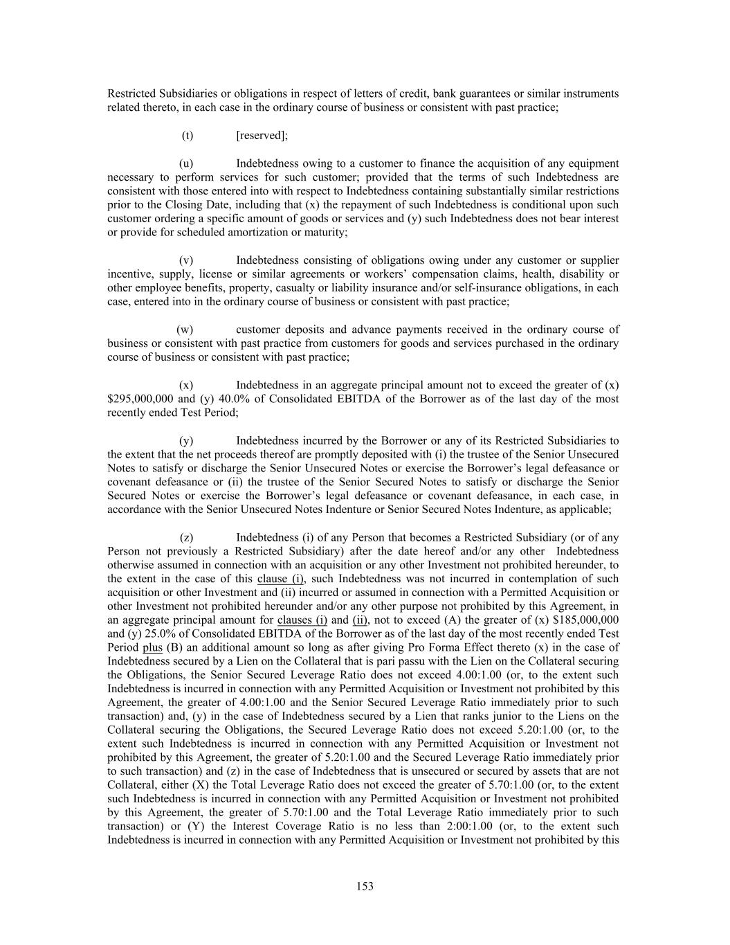 Restricted Subsidiaries or obligations in respect of letters of credit, bank guarantees or similar instruments related thereto, in each case in the ordinary course of business or consistent with past practice; (t) [reserved]; (u) Indebtedness owing to a customer to finance the acquisition of any equipment necessary to perform services for such customer; provided that the terms of such Indebtedness are consistent with those entered into with respect to Indebtedness containing substantially similar restrictions prior to the Closing Date, including that (x) the repayment of such Indebtedness is conditional upon such customer ordering a specific amount of goods or services and (y) such Indebtedness does not bear interest or provide for scheduled amortization or maturity; (v) Indebtedness consisting of obligations owing under any customer or supplier incentive, supply, license or similar agreements or workers’ compensation claims, health, disability or other employee benefits, property, casualty or liability insurance and/or self-insurance obligations, in each case, entered into in the ordinary course of business or consistent with past practice; (w) customer deposits and advance payments received in the ordinary course of business or consistent with past practice from customers for goods and services purchased in the ordinary course of business or consistent with past practice; (x) Indebtedness in an aggregate principal amount not to exceed the greater of (x) $295,000,000 and (y) 40.0% of Consolidated EBITDA of the Borrower as of the last day of the most recently ended Test Period; (y) Indebtedness incurred by the Borrower or any of its Restricted Subsidiaries to the extent that the net proceeds thereof are promptly deposited with (i) the trustee of the Senior Unsecured Notes to satisfy or discharge the Senior Unsecured Notes or exercise the Borrower’s legal defeasance or covenant defeasance or (ii) the trustee of the Senior Secured Notes to satisfy or discharge the Senior Secured Notes or exercise the Borrower’s legal defeasance or covenant defeasance, in each case, in accordance with the Senior Unsecured Notes Indenture or Senior Secured Notes Indenture, as applicable; (z) Indebtedness (i) of any Person that becomes a Restricted Subsidiary (or of any Person not previously a Restricted Subsidiary) after the date hereof and/or any other Indebtedness otherwise assumed in connection with an acquisition or any other Investment not prohibited hereunder, to the extent in the case of this clause (i), such Indebtedness was not incurred in contemplation of such acquisition or other Investment and (ii) incurred or assumed in connection with a Permitted Acquisition or other Investment not prohibited hereunder and/or any other purpose not prohibited by this Agreement, in an aggregate principal amount for clauses (i) and (ii), not to exceed (A) the greater of (x) $185,000,000 and (y) 25.0% of Consolidated EBITDA of the Borrower as of the last day of the most recently ended Test Period plus (B) an additional amount so long as after giving Pro Forma Effect thereto (x) in the case of Indebtedness secured by a Lien on the Collateral that is pari passu with the Lien on the Collateral securing the Obligations, the Senior Secured Leverage Ratio does not exceed 4.00:1.00 (or, to the extent such Indebtedness is incurred in connection with any Permitted Acquisition or Investment not prohibited by this Agreement, the greater of 4.00:1.00 and the Senior Secured Leverage Ratio immediately prior to such transaction) and, (y) in the case of Indebtedness secured by a Lien that ranks junior to the Liens on the Collateral securing the Obligations, the Secured Leverage Ratio does not exceed 5.20:1.00 (or, to the extent such Indebtedness is incurred in connection with any Permitted Acquisition or Investment not prohibited by this Agreement, the greater of 5.20:1.00 and the Secured Leverage Ratio immediately prior to such transaction) and (z) in the case of Indebtedness that is unsecured or secured by assets that are not Collateral, either (X) the Total Leverage Ratio does not exceed the greater of 5.70:1.00 (or, to the extent such Indebtedness is incurred in connection with any Permitted Acquisition or Investment not prohibited by this Agreement, the greater of 5.70:1.00 and the Total Leverage Ratio immediately prior to such transaction) or (Y) the Interest Coverage Ratio is no less than 2:00:1.00 (or, to the extent such Indebtedness is incurred in connection with any Permitted Acquisition or Investment not prohibited by this 153