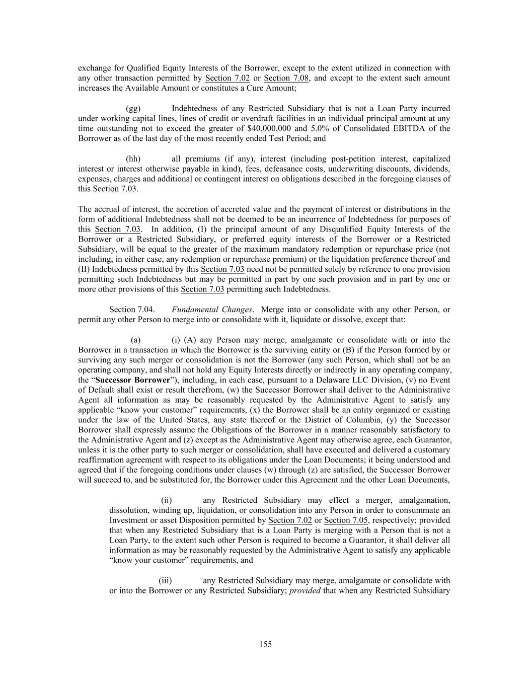 exchange for Qualified Equity Interests of the Borrower, except to the extent utilized in connection with any other transaction permitted by Section 7.02 or Section 7.08, and except to the extent such amount increases the Available Amount or constitutes a Cure Amount; (gg) Indebtedness of any Restricted Subsidiary that is not a Loan Party incurred under working capital lines, lines of credit or overdraft facilities in an individual principal amount at any time outstanding not to exceed the greater of $40,000,000 and 5.0% of Consolidated EBITDA of the Borrower as of the last day of the most recently ended Test Period; and (hh) all premiums (if any), interest (including post-petition interest, capitalized interest or interest otherwise payable in kind), fees, defeasance costs, underwriting discounts, dividends, expenses, charges and additional or contingent interest on obligations described in the foregoing clauses of this Section 7.03. The accrual of interest, the accretion of accreted value and the payment of interest or distributions in the form of additional Indebtedness shall not be deemed to be an incurrence of Indebtedness for purposes of this Section 7.03. In addition, (I) the principal amount of any Disqualified Equity Interests of the Borrower or a Restricted Subsidiary, or preferred equity interests of the Borrower or a Restricted Subsidiary, will be equal to the greater of the maximum mandatory redemption or repurchase price (not including, in either case, any redemption or repurchase premium) or the liquidation preference thereof and (II) Indebtedness permitted by this Section 7.03 need not be permitted solely by reference to one provision permitting such Indebtedness but may be permitted in part by one such provision and in part by one or more other provisions of this Section 7.03 permitting such Indebtedness. Section 7.04. Fundamental Changes. Merge into or consolidate with any other Person, or permit any other Person to merge into or consolidate with it, liquidate or dissolve, except that: (a) (i) (A) any Person may merge, amalgamate or consolidate with or into the Borrower in a transaction in which the Borrower is the surviving entity or (B) if the Person formed by or surviving any such merger or consolidation is not the Borrower (any such Person, which shall not be an operating company, and shall not hold any Equity Interests directly or indirectly in any operating company, the “Successor Borrower”), including, in each case, pursuant to a Delaware LLC Division, (v) no Event of Default shall exist or result therefrom, (w) the Successor Borrower shall deliver to the Administrative Agent all information as may be reasonably requested by the Administrative Agent to satisfy any applicable “know your customer” requirements, (x) the Borrower shall be an entity organized or existing under the law of the United States, any state thereof or the District of Columbia, (y) the Successor Borrower shall expressly assume the Obligations of the Borrower in a manner reasonably satisfactory to the Administrative Agent and (z) except as the Administrative Agent may otherwise agree, each Guarantor, unless it is the other party to such merger or consolidation, shall have executed and delivered a customary reaffirmation agreement with respect to its obligations under the Loan Documents; it being understood and agreed that if the foregoing conditions under clauses (w) through (z) are satisfied, the Successor Borrower will succeed to, and be substituted for, the Borrower under this Agreement and the other Loan Documents, (ii) any Restricted Subsidiary may effect a merger, amalgamation, dissolution, winding up, liquidation, or consolidation into any Person in order to consummate an Investment or asset Disposition permitted by Section 7.02 or Section 7.05, respectively; provided that when any Restricted Subsidiary that is a Loan Party is merging with a Person that is not a Loan Party, to the extent such other Person is required to become a Guarantor, it shall deliver all information as may be reasonably requested by the Administrative Agent to satisfy any applicable “know your customer” requirements, and (iii) any Restricted Subsidiary may merge, amalgamate or consolidate with or into the Borrower or any Restricted Subsidiary; provided that when any Restricted Subsidiary 155