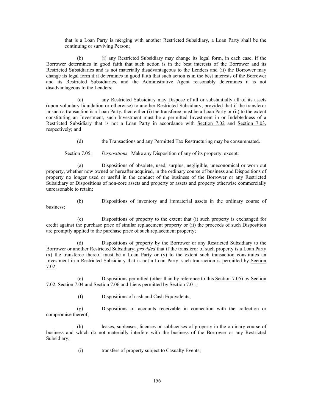 that is a Loan Party is merging with another Restricted Subsidiary, a Loan Party shall be the continuing or surviving Person; (b) (i) any Restricted Subsidiary may change its legal form, in each case, if the Borrower determines in good faith that such action is in the best interests of the Borrower and its Restricted Subsidiaries and is not materially disadvantageous to the Lenders and (ii) the Borrower may change its legal form if it determines in good faith that such action is in the best interests of the Borrower and its Restricted Subsidiaries, and the Administrative Agent reasonably determines it is not disadvantageous to the Lenders; (c) any Restricted Subsidiary may Dispose of all or substantially all of its assets (upon voluntary liquidation or otherwise) to another Restricted Subsidiary; provided that if the transferor in such a transaction is a Loan Party, then either (i) the transferee must be a Loan Party or (ii) to the extent constituting an Investment, such Investment must be a permitted Investment in or Indebtedness of a Restricted Subsidiary that is not a Loan Party in accordance with Section 7.02 and Section 7.03, respectively; and (d) the Transactions and any Permitted Tax Restructuring may be consummated. Section 7.05. Dispositions. Make any Disposition of any of its property, except: (a) Dispositions of obsolete, used, surplus, negligible, uneconomical or worn out property, whether now owned or hereafter acquired, in the ordinary course of business and Dispositions of property no longer used or useful in the conduct of the business of the Borrower or any Restricted Subsidiary or Dispositions of non-core assets and property or assets and property otherwise commercially unreasonable to retain; (b) Dispositions of inventory and immaterial assets in the ordinary course of business; (c) Dispositions of property to the extent that (i) such property is exchanged for credit against the purchase price of similar replacement property or (ii) the proceeds of such Disposition are promptly applied to the purchase price of such replacement property; (d) Dispositions of property by the Borrower or any Restricted Subsidiary to the Borrower or another Restricted Subsidiary; provided that if the transferor of such property is a Loan Party (x) the transferee thereof must be a Loan Party or (y) to the extent such transaction constitutes an Investment in a Restricted Subsidiary that is not a Loan Party, such transaction is permitted by Section 7.02; (e) Dispositions permitted (other than by reference to this Section 7.05) by Section 7.02, Section 7.04 and Section 7.06 and Liens permitted by Section 7.01; (f) Dispositions of cash and Cash Equivalents; (g) Dispositions of accounts receivable in connection with the collection or compromise thereof; (h) leases, subleases, licenses or sublicenses of property in the ordinary course of business and which do not materially interfere with the business of the Borrower or any Restricted Subsidiary; (i) transfers of property subject to Casualty Events; 156