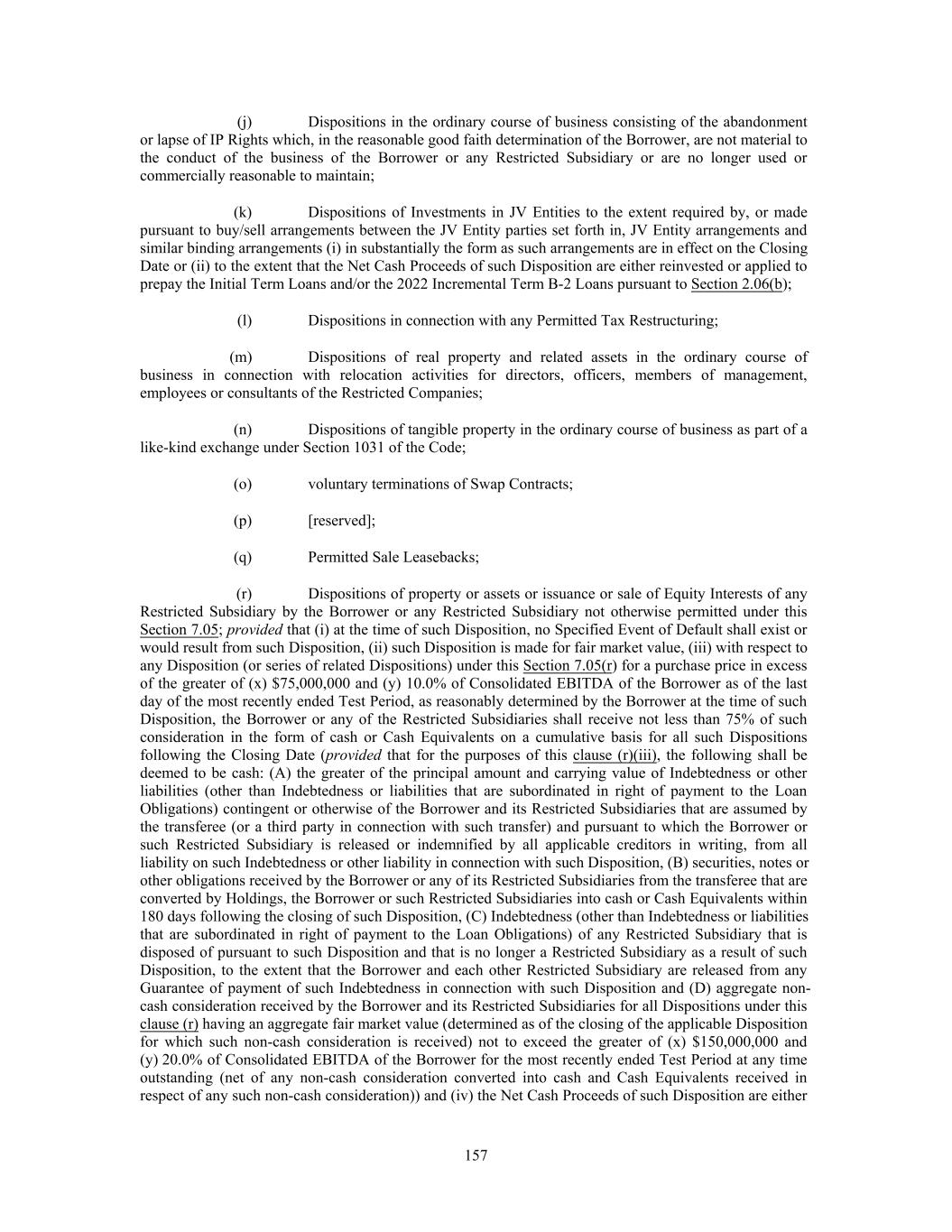 (j) Dispositions in the ordinary course of business consisting of the abandonment or lapse of IP Rights which, in the reasonable good faith determination of the Borrower, are not material to the conduct of the business of the Borrower or any Restricted Subsidiary or are no longer used or commercially reasonable to maintain; (k) Dispositions of Investments in JV Entities to the extent required by, or made pursuant to buy/sell arrangements between the JV Entity parties set forth in, JV Entity arrangements and similar binding arrangements (i) in substantially the form as such arrangements are in effect on the Closing Date or (ii) to the extent that the Net Cash Proceeds of such Disposition are either reinvested or applied to prepay the Initial Term Loans and/or the 2022 Incremental Term B-2 Loans pursuant to Section 2.06(b); (l) Dispositions in connection with any Permitted Tax Restructuring; (m) Dispositions of real property and related assets in the ordinary course of business in connection with relocation activities for directors, officers, members of management, employees or consultants of the Restricted Companies; (n) Dispositions of tangible property in the ordinary course of business as part of a like-kind exchange under Section 1031 of the Code; (o) voluntary terminations of Swap Contracts; (p) [reserved]; (q) Permitted Sale Leasebacks; (r) Dispositions of property or assets or issuance or sale of Equity Interests of any Restricted Subsidiary by the Borrower or any Restricted Subsidiary not otherwise permitted under this Section 7.05; provided that (i) at the time of such Disposition, no Specified Event of Default shall exist or would result from such Disposition, (ii) such Disposition is made for fair market value, (iii) with respect to any Disposition (or series of related Dispositions) under this Section 7.05(r) for a purchase price in excess of the greater of (x) $75,000,000 and (y) 10.0% of Consolidated EBITDA of the Borrower as of the last day of the most recently ended Test Period, as reasonably determined by the Borrower at the time of such Disposition, the Borrower or any of the Restricted Subsidiaries shall receive not less than 75% of such consideration in the form of cash or Cash Equivalents on a cumulative basis for all such Dispositions following the Closing Date (provided that for the purposes of this clause (r) (iii), the following shall be deemed to be cash: (A) the greater of the principal amount and carrying value of Indebtedness or other liabilities (other than Indebtedness or liabilities that are subordinated in right of payment to the Loan Obligations) contingent or otherwise of the Borrower and its Restricted Subsidiaries that are assumed by the transferee (or a third party in connection with such transfer) and pursuant to which the Borrower or such Restricted Subsidiary is released or indemnified by all applicable creditors in writing, from all liability on such Indebtedness or other liability in connection with such Disposition, (B) securities, notes or other obligations received by the Borrower or any of its Restricted Subsidiaries from the transferee that are converted by Holdings, the Borrower or such Restricted Subsidiaries into cash or Cash Equivalents within 180 days following the closing of such Disposition, (C) Indebtedness (other than Indebtedness or liabilities that are subordinated in right of payment to the Loan Obligations) of any Restricted Subsidiary that is disposed of pursuant to such Disposition and that is no longer a Restricted Subsidiary as a result of such Disposition, to the extent that the Borrower and each other Restricted Subsidiary are released from any Guarantee of payment of such Indebtedness in connection with such Disposition and (D) aggregate non- cash consideration received by the Borrower and its Restricted Subsidiaries for all Dispositions under this clause (r) having an aggregate fair market value (determined as of the closing of the applicable Disposition for which such non-cash consideration is received) not to exceed the greater of (x) $150,000,000 and (y) 20.0% of Consolidated EBITDA of the Borrower for the most recently ended Test Period at any time outstanding (net of any non-cash consideration converted into cash and Cash Equivalents received in respect of any such non-cash consideration)) and (iv) the Net Cash Proceeds of such Disposition are either 157