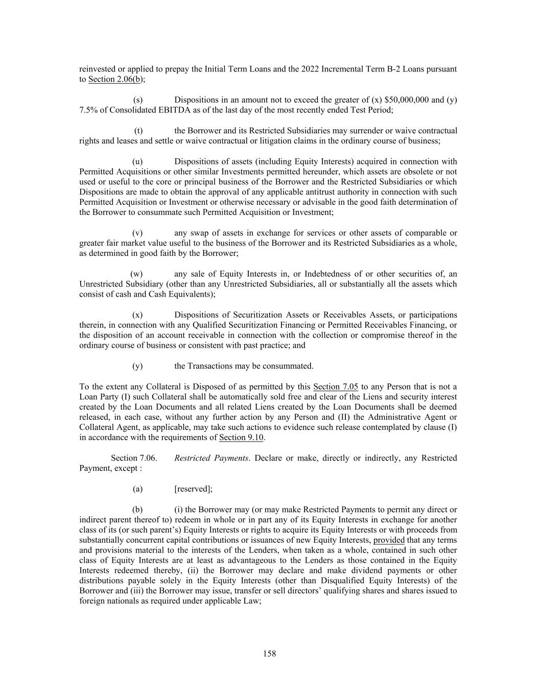 reinvested or applied to prepay the Initial Term Loans and the 2022 Incremental Term B-2 Loans pursuant to Section 2.06(b); (s) Dispositions in an amount not to exceed the greater of (x) $50,000,000 and (y) 7.5% of Consolidated EBITDA as of the last day of the most recently ended Test Period; (t) the Borrower and its Restricted Subsidiaries may surrender or waive contractual rights and leases and settle or waive contractual or litigation claims in the ordinary course of business; (u) Dispositions of assets (including Equity Interests) acquired in connection with Permitted Acquisitions or other similar Investments permitted hereunder, which assets are obsolete or not used or useful to the core or principal business of the Borrower and the Restricted Subsidiaries or which Dispositions are made to obtain the approval of any applicable antitrust authority in connection with such Permitted Acquisition or Investment or otherwise necessary or advisable in the good faith determination of the Borrower to consummate such Permitted Acquisition or Investment; (v) any swap of assets in exchange for services or other assets of comparable or greater fair market value useful to the business of the Borrower and its Restricted Subsidiaries as a whole, as determined in good faith by the Borrower; (w) any sale of Equity Interests in, or Indebtedness of or other securities of, an Unrestricted Subsidiary (other than any Unrestricted Subsidiaries, all or substantially all the assets which consist of cash and Cash Equivalents); (x) Dispositions of Securitization Assets or Receivables Assets, or participations therein, in connection with any Qualified Securitization Financing or Permitted Receivables Financing, or the disposition of an account receivable in connection with the collection or compromise thereof in the ordinary course of business or consistent with past practice; and (y) the Transactions may be consummated. To the extent any Collateral is Disposed of as permitted by this Section 7.05 to any Person that is not a Loan Party (I) such Collateral shall be automatically sold free and clear of the Liens and security interest created by the Loan Documents and all related Liens created by the Loan Documents shall be deemed released, in each case, without any further action by any Person and (II) the Administrative Agent or Collateral Agent, as applicable, may take such actions to evidence such release contemplated by clause (I) in accordance with the requirements of Section 9.10. Section 7.06. Restricted Payments. Declare or make, directly or indirectly, any Restricted Payment, except : (a) [reserved]; (b) (i) the Borrower may (or may make Restricted Payments to permit any direct or indirect parent thereof to) redeem in whole or in part any of its Equity Interests in exchange for another class of its (or such parent’s) Equity Interests or rights to acquire its Equity Interests or with proceeds from substantially concurrent capital contributions or issuances of new Equity Interests, provided that any terms and provisions material to the interests of the Lenders, when taken as a whole, contained in such other class of Equity Interests are at least as advantageous to the Lenders as those contained in the Equity Interests redeemed thereby, (ii) the Borrower may declare and make dividend payments or other distributions payable solely in the Equity Interests (other than Disqualified Equity Interests) of the Borrower and (iii) the Borrower may issue, transfer or sell directors’ qualifying shares and shares issued to foreign nationals as required under applicable Law; 158