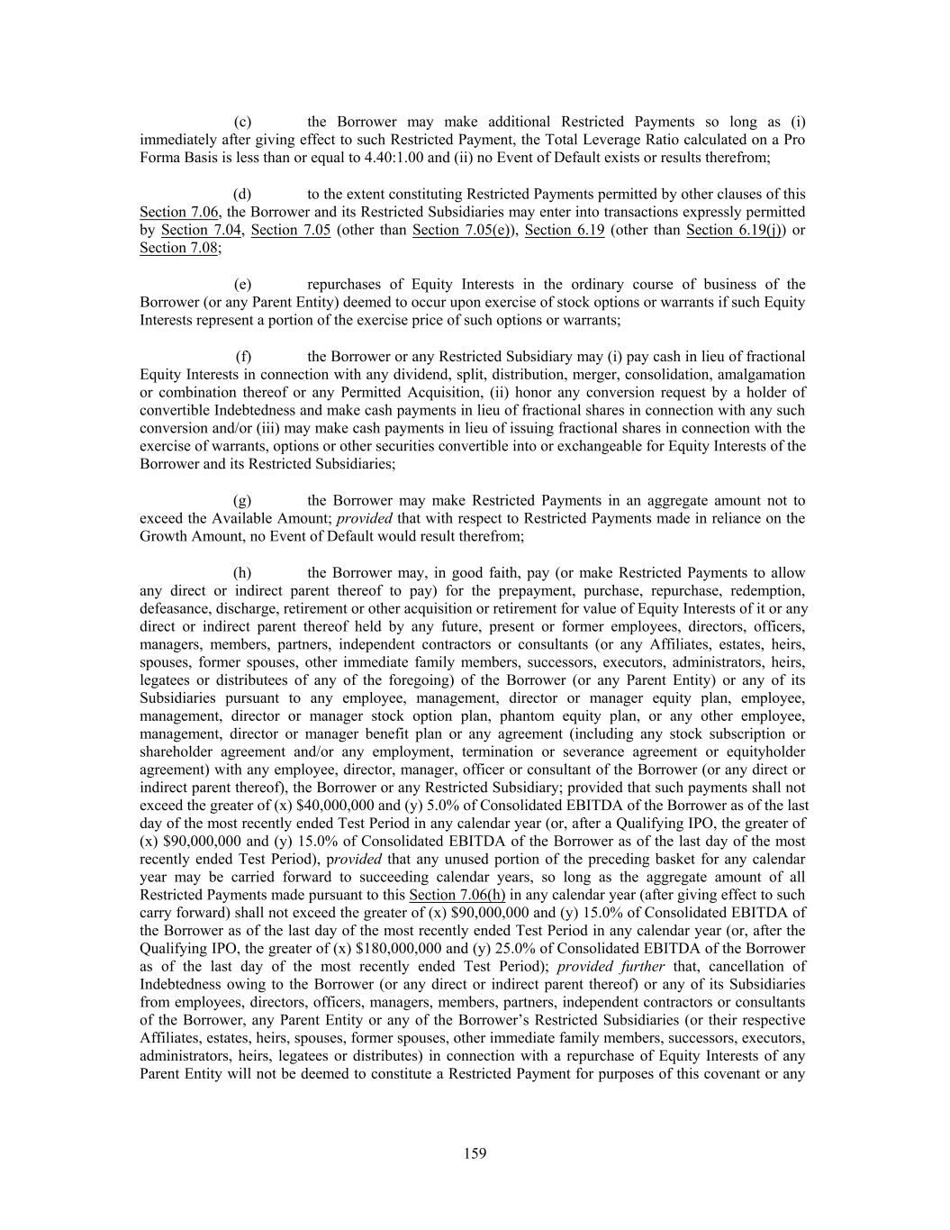 (c) the Borrower may make additional Restricted Payments so long as (i) immediately after giving effect to such Restricted Payment, the Total Leverage Ratio calculated on a Pro Forma Basis is less than or equal to 4.40:1.00 and (ii) no Event of Default exists or results therefrom; (d) to the extent constituting Restricted Payments permitted by other clauses of this Section 7.06, the Borrower and its Restricted Subsidiaries may enter into transactions expressly permitted by Section 7.04, Section 7.05 (other than Section 7.05(e)), Section 6.19 (other than Section 6.19(j)) or Section 7.08; (e) repurchases of Equity Interests in the ordinary course of business of the Borrower (or any Parent Entity) deemed to occur upon exercise of stock options or warrants if such Equity Interests represent a portion of the exercise price of such options or warrants; (f) the Borrower or any Restricted Subsidiary may (i) pay cash in lieu of fractional Equity Interests in connection with any dividend, split, distribution, merger, consolidation, amalgamation or combination thereof or any Permitted Acquisition, (ii) honor any conversion request by a holder of convertible Indebtedness and make cash payments in lieu of fractional shares in connection with any such conversion and/or (iii) may make cash payments in lieu of issuing fractional shares in connection with the exercise of warrants, options or other securities convertible into or exchangeable for Equity Interests of the Borrower and its Restricted Subsidiaries; (g) the Borrower may make Restricted Payments in an aggregate amount not to exceed the Available Amount; provided that with respect to Restricted Payments made in reliance on the Growth Amount, no Event of Default would result therefrom; (h) the Borrower may, in good faith, pay (or make Restricted Payments to allow any direct or indirect parent thereof to pay) for the prepayment, purchase, repurchase, redemption, defeasance, discharge, retirement or other acquisition or retirement for value of Equity Interests of it or any direct or indirect parent thereof held by any future, present or former employees, directors, officers, managers, members, partners, independent contractors or consultants (or any Affiliates, estates, heirs, spouses, former spouses, other immediate family members, successors, executors, administrators, heirs, legatees or distributees of any of the foregoing) of the Borrower (or any Parent Entity) or any of its Subsidiaries pursuant to any employee, management, director or manager equity plan, employee, management, director or manager stock option plan, phantom equity plan, or any other employee, management, director or manager benefit plan or any agreement (including any stock subscription or shareholder agreement and/or any employment, termination or severance agreement or equityholder agreement) with any employee, director, manager, officer or consultant of the Borrower (or any direct or indirect parent thereof), the Borrower or any Restricted Subsidiary; provided that such payments shall not exceed the greater of (x) $40,000,000 and (y) 5.0% of Consolidated EBITDA of the Borrower as of the last day of the most recently ended Test Period in any calendar year (or, after a Qualifying IPO, the greater of (x) $90,000,000 and (y) 15.0% of Consolidated EBITDA of the Borrower as of the last day of the most recently ended Test Period), provided that any unused portion of the preceding basket for any calendar year may be carried forward to succeeding calendar years, so long as the aggregate amount of all Restricted Payments made pursuant to this Section 7.06(h) in any calendar year (after giving effect to such carry forward) shall not exceed the greater of (x) $90,000,000 and (y) 15.0% of Consolidated EBITDA of the Borrower as of the last day of the most recently ended Test Period in any calendar year (or, after the Qualifying IPO, the greater of (x) $180,000,000 and (y) 25.0% of Consolidated EBITDA of the Borrower as of the last day of the most recently ended Test Period); provided further that, cancellation of Indebtedness owing to the Borrower (or any direct or indirect parent thereof) or any of its Subsidiaries from employees, directors, officers, managers, members, partners, independent contractors or consultants of the Borrower, any Parent Entity or any of the Borrower’s Restricted Subsidiaries (or their respective Affiliates, estates, heirs, spouses, former spouses, other immediate family members, successors, executors, administrators, heirs, legatees or distributes) in connection with a repurchase of Equity Interests of any Parent Entity will not be deemed to constitute a Restricted Payment for purposes of this covenant or any 159