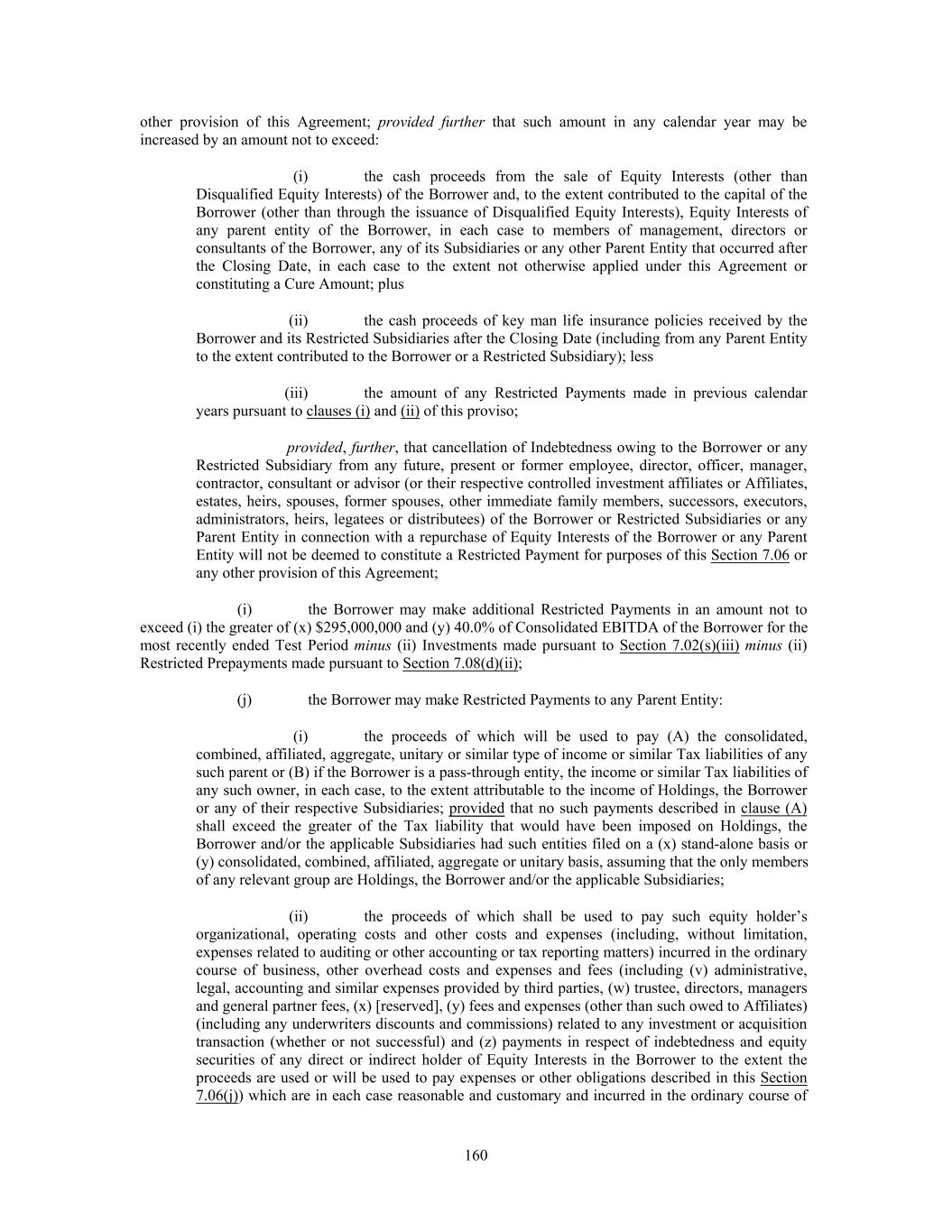 other provision of this Agreement; provided further that such amount in any calendar year may be increased by an amount not to exceed: (i) the cash proceeds from the sale of Equity Interests (other than Disqualified Equity Interests) of the Borrower and, to the extent contributed to the capital of the Borrower (other than through the issuance of Disqualified Equity Interests), Equity Interests of any parent entity of the Borrower, in each case to members of management, directors or consultants of the Borrower, any of its Subsidiaries or any other Parent Entity that occurred after the Closing Date, in each case to the extent not otherwise applied under this Agreement or constituting a Cure Amount; plus (ii) the cash proceeds of key man life insurance policies received by the Borrower and its Restricted Subsidiaries after the Closing Date (including from any Parent Entity to the extent contributed to the Borrower or a Restricted Subsidiary); less (iii) the amount of any Restricted Payments made in previous calendar years pursuant to clauses (i) and (ii) of this proviso; provided, further, that cancellation of Indebtedness owing to the Borrower or any Restricted Subsidiary from any future, present or former employee, director, officer, manager, contractor, consultant or advisor (or their respective controlled investment affiliates or Affiliates, estates, heirs, spouses, former spouses, other immediate family members, successors, executors, administrators, heirs, legatees or distributees) of the Borrower or Restricted Subsidiaries or any Parent Entity in connection with a repurchase of Equity Interests of the Borrower or any Parent Entity will not be deemed to constitute a Restricted Payment for purposes of this Section 7.06 or any other provision of this Agreement; (i) the Borrower may make additional Restricted Payments in an amount not to exceed (i) the greater of (x) $295,000,000 and (y) 40.0% of Consolidated EBITDA of the Borrower for the most recently ended Test Period minus (ii) Investments made pursuant to Section 7.02(s)(iii) minus (ii) Restricted Prepayments made pursuant to Section 7.08(d)(ii); (j) the Borrower may make Restricted Payments to any Parent Entity: (i) the proceeds of which will be used to pay (A) the consolidated, combined, affiliated, aggregate, unitary or similar type of income or similar Tax liabilities of any such parent or (B) if the Borrower is a pass-through entity, the income or similar Tax liabilities of any such owner, in each case, to the extent attributable to the income of Holdings, the Borrower or any of their respective Subsidiaries; provided that no such payments described in clause (A) shall exceed the greater of the Tax liability that would have been imposed on Holdings, the Borrower and/or the applicable Subsidiaries had such entities filed on a (x) stand-alone basis or (y) consolidated, combined, affiliated, aggregate or unitary basis, assuming that the only members of any relevant group are Holdings, the Borrower and/or the applicable Subsidiaries; (ii) the proceeds of which shall be used to pay such equity holder’s organizational, operating costs and other costs and expenses (including, without limitation, expenses related to auditing or other accounting or tax reporting matters) incurred in the ordinary course of business, other overhead costs and expenses and fees (including (v) administrative, legal, accounting and similar expenses provided by third parties, (w) trustee, directors, managers and general partner fees, (x) [reserved], (y) fees and expenses (other than such owed to Affiliates) (including any underwriters discounts and commissions) related to any investment or acquisition transaction (whether or not successful) and (z) payments in respect of indebtedness and equity securities of any direct or indirect holder of Equity Interests in the Borrower to the extent the proceeds are used or will be used to pay expenses or other obligations described in this Section 7.06(j)) which are in each case reasonable and customary and incurred in the ordinary course of 160