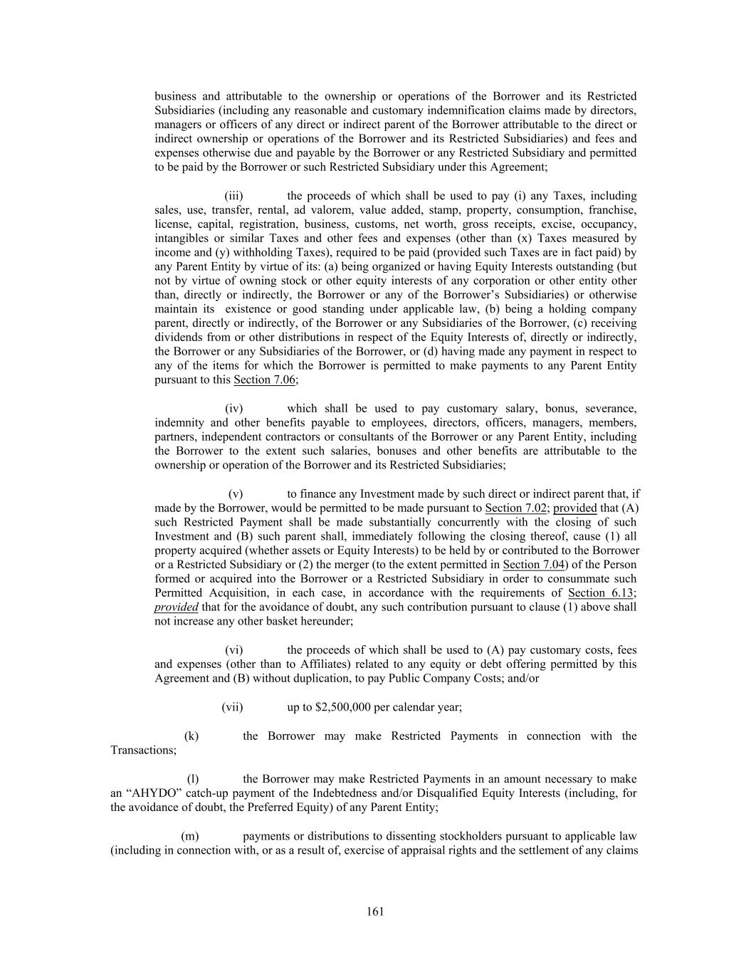 business and attributable to the ownership or operations of the Borrower and its Restricted Subsidiaries (including any reasonable and customary indemnification claims made by directors, managers or officers of any direct or indirect parent of the Borrower attributable to the direct or indirect ownership or operations of the Borrower and its Restricted Subsidiaries) and fees and expenses otherwise due and payable by the Borrower or any Restricted Subsidiary and permitted to be paid by the Borrower or such Restricted Subsidiary under this Agreement; (iii) the proceeds of which shall be used to pay (i) any Taxes, including sales, use, transfer, rental, ad valorem, value added, stamp, property, consumption, franchise, license, capital, registration, business, customs, net worth, gross receipts, excise, occupancy, intangibles or similar Taxes and other fees and expenses (other than (x) Taxes measured by income and (y) withholding Taxes), required to be paid (provided such Taxes are in fact paid) by any Parent Entity by virtue of its: (a) being organized or having Equity Interests outstanding (but not by virtue of owning stock or other equity interests of any corporation or other entity other than, directly or indirectly, the Borrower or any of the Borrower’s Subsidiaries) or otherwise maintain its existence or good standing under applicable law, (b) being a holding company parent, directly or indirectly, of the Borrower or any Subsidiaries of the Borrower, (c) receiving dividends from or other distributions in respect of the Equity Interests of, directly or indirectly, the Borrower or any Subsidiaries of the Borrower, or (d) having made any payment in respect to any of the items for which the Borrower is permitted to make payments to any Parent Entity pursuant to this Section 7.06; (iv) which shall be used to pay customary salary, bonus, severance, indemnity and other benefits payable to employees, directors, officers, managers, members, partners, independent contractors or consultants of the Borrower or any Parent Entity, including the Borrower to the extent such salaries, bonuses and other benefits are attributable to the ownership or operation of the Borrower and its Restricted Subsidiaries; (v) to finance any Investment made by such direct or indirect parent that, if made by the Borrower, would be permitted to be made pursuant to Section 7.02; provided that (A) such Restricted Payment shall be made substantially concurrently with the closing of such Investment and (B) such parent shall, immediately following the closing thereof, cause (1) all property acquired (whether assets or Equity Interests) to be held by or contributed to the Borrower or a Restricted Subsidiary or (2) the merger (to the extent permitted in Section 7.04) of the Person formed or acquired into the Borrower or a Restricted Subsidiary in order to consummate such Permitted Acquisition, in each case, in accordance with the requirements of Section 6.13; provided that for the avoidance of doubt, any such contribution pursuant to clause (1) above shall not increase any other basket hereunder; (vi) the proceeds of which shall be used to (A) pay customary costs, fees and expenses (other than to Affiliates) related to any equity or debt offering permitted by this Agreement and (B) without duplication, to pay Public Company Costs; and/or (vii) up to $2,500,000 per calendar year; (k) the Borrower may make Restricted Payments in connection with the Transactions; (l) the Borrower may make Restricted Payments in an amount necessary to make an “AHYDO” catch-up payment of the Indebtedness and/or Disqualified Equity Interests (including, for the avoidance of doubt, the Preferred Equity) of any Parent Entity; (m) payments or distributions to dissenting stockholders pursuant to applicable law (including in connection with, or as a result of, exercise of appraisal rights and the settlement of any claims 161