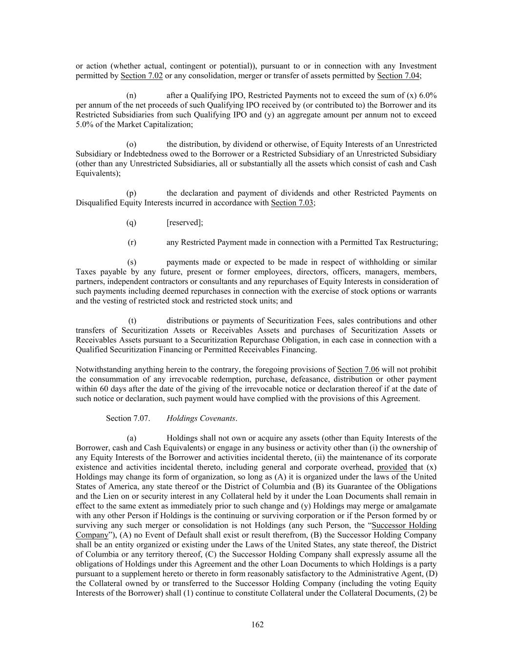or action (whether actual, contingent or potential)), pursuant to or in connection with any Investment permitted by Section 7.02 or any consolidation, merger or transfer of assets permitted by Section 7.04; (n) after a Qualifying IPO, Restricted Payments not to exceed the sum of (x) 6.0% per annum of the net proceeds of such Qualifying IPO received by (or contributed to) the Borrower and its Restricted Subsidiaries from such Qualifying IPO and (y) an aggregate amount per annum not to exceed 5.0% of the Market Capitalization; (o) the distribution, by dividend or otherwise, of Equity Interests of an Unrestricted Subsidiary or Indebtedness owed to the Borrower or a Restricted Subsidiary of an Unrestricted Subsidiary (other than any Unrestricted Subsidiaries, all or substantially all the assets which consist of cash and Cash Equivalents); (p) the declaration and payment of dividends and other Restricted Payments on Disqualified Equity Interests incurred in accordance with Section 7.03; (q) [reserved]; (r) any Restricted Payment made in connection with a Permitted Tax Restructuring; (s) payments made or expected to be made in respect of withholding or similar Taxes payable by any future, present or former employees, directors, officers, managers, members, partners, independent contractors or consultants and any repurchases of Equity Interests in consideration of such payments including deemed repurchases in connection with the exercise of stock options or warrants and the vesting of restricted stock and restricted stock units; and (t) distributions or payments of Securitization Fees, sales contributions and other transfers of Securitization Assets or Receivables Assets and purchases of Securitization Assets or Receivables Assets pursuant to a Securitization Repurchase Obligation, in each case in connection with a Qualified Securitization Financing or Permitted Receivables Financing. Notwithstanding anything herein to the contrary, the foregoing provisions of Section 7.06 will not prohibit the consummation of any irrevocable redemption, purchase, defeasance, distribution or other payment within 60 days after the date of the giving of the irrevocable notice or declaration thereof if at the date of such notice or declaration, such payment would have complied with the provisions of this Agreement. Section 7.07. Holdings Covenants. (a) Holdings shall not own or acquire any assets (other than Equity Interests of the Borrower, cash and Cash Equivalents) or engage in any business or activity other than (i) the ownership of any Equity Interests of the Borrower and activities incidental thereto, (ii) the maintenance of its corporate existence and activities incidental thereto, including general and corporate overhead, provided that (x) Holdings may change its form of organization, so long as (A) it is organized under the laws of the United States of America, any state thereof or the District of Columbia and (B) its Guarantee of the Obligations and the Lien on or security interest in any Collateral held by it under the Loan Documents shall remain in effect to the same extent as immediately prior to such change and (y) Holdings may merge or amalgamate with any other Person if Holdings is the continuing or surviving corporation or if the Person formed by or surviving any such merger or consolidation is not Holdings (any such Person, the “Successor Holding Company”), (A) no Event of Default shall exist or result therefrom, (B) the Successor Holding Company shall be an entity organized or existing under the Laws of the United States, any state thereof, the District of Columbia or any territory thereof, (C) the Successor Holding Company shall expressly assume all the obligations of Holdings under this Agreement and the other Loan Documents to which Holdings is a party pursuant to a supplement hereto or thereto in form reasonably satisfactory to the Administrative Agent, (D) the Collateral owned by or transferred to the Successor Holding Company (including the voting Equity Interests of the Borrower) shall (1) continue to constitute Collateral under the Collateral Documents, (2) be 162