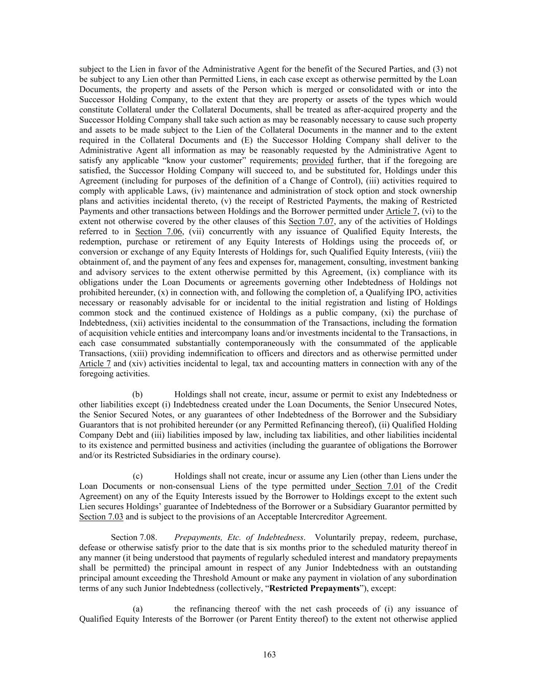 subject to the Lien in favor of the Administrative Agent for the benefit of the Secured Parties, and (3) not be subject to any Lien other than Permitted Liens, in each case except as otherwise permitted by the Loan Documents, the property and assets of the Person which is merged or consolidated with or into the Successor Holding Company, to the extent that they are property or assets of the types which would constitute Collateral under the Collateral Documents, shall be treated as after-acquired property and the Successor Holding Company shall take such action as may be reasonably necessary to cause such property and assets to be made subject to the Lien of the Collateral Documents in the manner and to the extent required in the Collateral Documents and (E) the Successor Holding Company shall deliver to the Administrative Agent all information as may be reasonably requested by the Administrative Agent to satisfy any applicable “know your customer” requirements; provided further, that if the foregoing are satisfied, the Successor Holding Company will succeed to, and be substituted for, Holdings under this Agreement (including for purposes of the definition of a Change of Control), (iii) activities required to comply with applicable Laws, (iv) maintenance and administration of stock option and stock ownership plans and activities incidental thereto, (v) the receipt of Restricted Payments, the making of Restricted Payments and other transactions between Holdings and the Borrower permitted under Article 7, (vi) to the extent not otherwise covered by the other clauses of this Section 7.07, any of the activities of Holdings referred to in Section 7.06, (vii) concurrently with any issuance of Qualified Equity Interests, the redemption, purchase or retirement of any Equity Interests of Holdings using the proceeds of, or conversion or exchange of any Equity Interests of Holdings for, such Qualified Equity Interests, (viii) the obtainment of, and the payment of any fees and expenses for, management, consulting, investment banking and advisory services to the extent otherwise permitted by this Agreement, (ix) compliance with its obligations under the Loan Documents or agreements governing other Indebtedness of Holdings not prohibited hereunder, (x) in connection with, and following the completion of, a Qualifying IPO, activities necessary or reasonably advisable for or incidental to the initial registration and listing of Holdings common stock and the continued existence of Holdings as a public company, (xi) the purchase of Indebtedness, (xii) activities incidental to the consummation of the Transactions, including the formation of acquisition vehicle entities and intercompany loans and/or investments incidental to the Transactions, in each case consummated substantially contemporaneously with the consummated of the applicable Transactions, (xiii) providing indemnification to officers and directors and as otherwise permitted under Article 7 and (xiv) activities incidental to legal, tax and accounting matters in connection with any of the foregoing activities. (b) Holdings shall not create, incur, assume or permit to exist any Indebtedness or other liabilities except (i) Indebtedness created under the Loan Documents, the Senior Unsecured Notes, the Senior Secured Notes, or any guarantees of other Indebtedness of the Borrower and the Subsidiary Guarantors that is not prohibited hereunder (or any Permitted Refinancing thereof), (ii) Qualified Holding Company Debt and (iii) liabilities imposed by law, including tax liabilities, and other liabilities incidental to its existence and permitted business and activities (including the guarantee of obligations the Borrower and/or its Restricted Subsidiaries in the ordinary course). (c) Holdings shall not create, incur or assume any Lien (other than Liens under the Loan Documents or non-consensual Liens of the type permitted under Section 7.01 of the Credit Agreement) on any of the Equity Interests issued by the Borrower to Holdings except to the extent such Lien secures Holdings’ guarantee of Indebtedness of the Borrower or a Subsidiary Guarantor permitted by Section 7.03 and is subject to the provisions of an Acceptable Intercreditor Agreement. Section 7.08. Prepayments, Etc. of Indebtedness. Voluntarily prepay, redeem, purchase, defease or otherwise satisfy prior to the date that is six months prior to the scheduled maturity thereof in any manner (it being understood that payments of regularly scheduled interest and mandatory prepayments shall be permitted) the principal amount in respect of any Junior Indebtedness with an outstanding principal amount exceeding the Threshold Amount or make any payment in violation of any subordination terms of any such Junior Indebtedness (collectively, “Restricted Prepayments”), except: (a) the refinancing thereof with the net cash proceeds of (i) any issuance of Qualified Equity Interests of the Borrower (or Parent Entity thereof) to the extent not otherwise applied 163