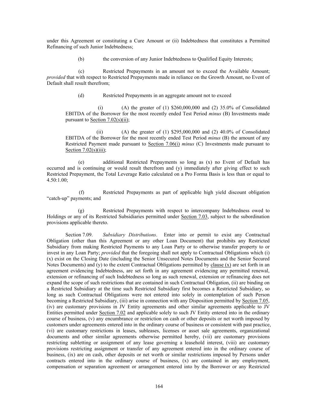 under this Agreement or constituting a Cure Amount or (ii) Indebtedness that constitutes a Permitted Refinancing of such Junior Indebtedness; (b) the conversion of any Junior Indebtedness to Qualified Equity Interests; (c) Restricted Prepayments in an amount not to exceed the Available Amount; provided that with respect to Restricted Prepayments made in reliance on the Growth Amount, no Event of Default shall result therefrom; (d) Restricted Prepayments in an aggregate amount not to exceed (i) (A) the greater of (1) $260,000,000 and (2) 35.0% of Consolidated EBITDA of the Borrower for the most recently ended Test Period minus (B) Investments made pursuant to Section 7.02(s)(ii); (ii) (A) the greater of (1) $295,000,000 and (2) 40.0% of Consolidated EBITDA of the Borrower for the most recently ended Test Period minus (B) the amount of any Restricted Payment made pursuant to Section 7.06(i) minus (C) Investments made pursuant to Section 7.02(s)(iii); (e) additional Restricted Prepayments so long as (x) no Event of Default has occurred and is continuing or would result therefrom and (y) immediately after giving effect to such Restricted Prepayment, the Total Leverage Ratio calculated on a Pro Forma Basis is less than or equal to 4.50:1.00; (f) Restricted Prepayments as part of applicable high yield discount obligation “catch-up” payments; and (g) Restricted Prepayments with respect to intercompany Indebtedness owed to Holdings or any of its Restricted Subsidiaries permitted under Section 7.03, subject to the subordination provisions applicable thereto. Section 7.09. Subsidiary Distributions. Enter into or permit to exist any Contractual Obligation (other than this Agreement or any other Loan Document) that prohibits any Restricted Subsidiary from making Restricted Payments to any Loan Party or to otherwise transfer property to or invest in any Loan Party; provided that the foregoing shall not apply to Contractual Obligations which (i) (x) exist on the Closing Date (including the Senior Unsecured Notes Documents and the Senior Secured Notes Documents) and (y) to the extent Contractual Obligations permitted by clause (x) are set forth in an agreement evidencing Indebtedness, are set forth in any agreement evidencing any permitted renewal, extension or refinancing of such Indebtedness so long as such renewal, extension or refinancing does not expand the scope of such restrictions that are contained in such Contractual Obligation, (ii) are binding on a Restricted Subsidiary at the time such Restricted Subsidiary first becomes a Restricted Subsidiary, so long as such Contractual Obligations were not entered into solely in contemplation of such Person becoming a Restricted Subsidiary, (iii) arise in connection with any Disposition permitted by Section 7.05, (iv) are customary provisions in JV Entity agreements and other similar agreements applicable to JV Entities permitted under Section 7.02 and applicable solely to such JV Entity entered into in the ordinary course of business, (v) any encumbrance or restriction on cash or other deposits or net worth imposed by customers under agreements entered into in the ordinary course of business or consistent with past practice, (vi) are customary restrictions in leases, subleases, licenses or asset sale agreements, organizational documents and other similar agreements otherwise permitted hereby, (vii) are customary provisions restricting subletting or assignment of any lease governing a leasehold interest, (viii) are customary provisions restricting assignment or transfer of any agreement entered into in the ordinary course of business, (ix) are on cash, other deposits or net worth or similar restrictions imposed by Persons under contracts entered into in the ordinary course of business, (x) are contained in any employment, compensation or separation agreement or arrangement entered into by the Borrower or any Restricted 164