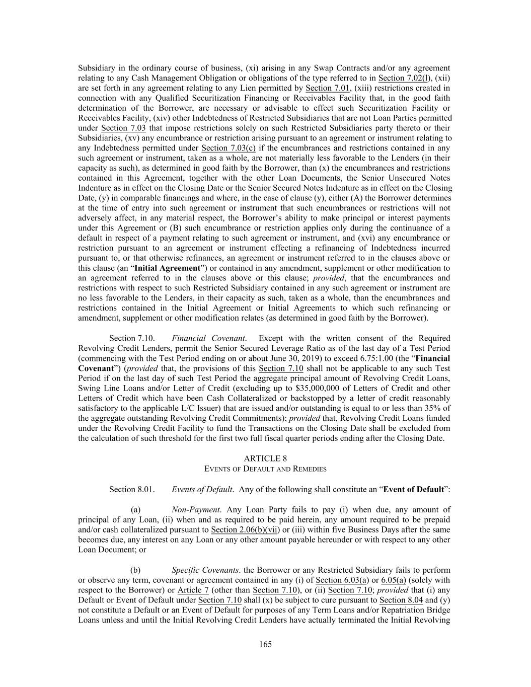 Subsidiary in the ordinary course of business, (xi) arising in any Swap Contracts and/or any agreement relating to any Cash Management Obligation or obligations of the type referred to in Section 7.02(l), (xii) are set forth in any agreement relating to any Lien permitted by Section 7.01, (xiii) restrictions created in connection with any Qualified Securitization Financing or Receivables Facility that, in the good faith determination of the Borrower, are necessary or advisable to effect such Securitization Facility or Receivables Facility, (xiv) other Indebtedness of Restricted Subsidiaries that are not Loan Parties permitted under Section 7.03 that impose restrictions solely on such Restricted Subsidiaries party thereto or their Subsidiaries, (xv) any encumbrance or restriction arising pursuant to an agreement or instrument relating to any Indebtedness permitted under Section 7.03(c) if the encumbrances and restrictions contained in any such agreement or instrument, taken as a whole, are not materially less favorable to the Lenders (in their capacity as such), as determined in good faith by the Borrower, than (x) the encumbrances and restrictions contained in this Agreement, together with the other Loan Documents, the Senior Unsecured Notes Indenture as in effect on the Closing Date or the Senior Secured Notes Indenture as in effect on the Closing Date, (y) in comparable financings and where, in the case of clause (y), either (A) the Borrower determines at the time of entry into such agreement or instrument that such encumbrances or restrictions will not adversely affect, in any material respect, the Borrower’s ability to make principal or interest payments under this Agreement or (B) such encumbrance or restriction applies only during the continuance of a default in respect of a payment relating to such agreement or instrument, and (xvi) any encumbrance or restriction pursuant to an agreement or instrument effecting a refinancing of Indebtedness incurred pursuant to, or that otherwise refinances, an agreement or instrument referred to in the clauses above or this clause (an “Initial Agreement”) or contained in any amendment, supplement or other modification to an agreement referred to in the clauses above or this clause; provided, that the encumbrances and restrictions with respect to such Restricted Subsidiary contained in any such agreement or instrument are no less favorable to the Lenders, in their capacity as such, taken as a whole, than the encumbrances and restrictions contained in the Initial Agreement or Initial Agreements to which such refinancing or amendment, supplement or other modification relates (as determined in good faith by the Borrower). Section 7.10. Financial Covenant. Except with the written consent of the Required Revolving Credit Lenders, permit the Senior Secured Leverage Ratio as of the last day of a Test Period (commencing with the Test Period ending on or about June 30, 2019) to exceed 6.75:1.00 (the “Financial Covenant”) (provided that, the provisions of this Section 7.10 shall not be applicable to any such Test Period if on the last day of such Test Period the aggregate principal amount of Revolving Credit Loans, Swing Line Loans and/or Letter of Credit (excluding up to $35,000,000 of Letters of Credit and other Letters of Credit which have been Cash Collateralized or backstopped by a letter of credit reasonably satisfactory to the applicable L/C Issuer) that are issued and/or outstanding is equal to or less than 35% of the aggregate outstanding Revolving Credit Commitments); provided that, Revolving Credit Loans funded under the Revolving Credit Facility to fund the Transactions on the Closing Date shall be excluded from the calculation of such threshold for the first two full fiscal quarter periods ending after the Closing Date. ARTICLE 8 EVENTS OF DEFAULT AND REMEDIES Section 8.01. Events of Default. Any of the following shall constitute an “Event of Default”: (a) Non-Payment. Any Loan Party fails to pay (i) when due, any amount of principal of any Loan, (ii) when and as required to be paid herein, any amount required to be prepaid and/or cash collateralized pursuant to Section 2.06(b)(vii) or (iii) within five Business Days after the same becomes due, any interest on any Loan or any other amount payable hereunder or with respect to any other Loan Document; or (b) Specific Covenants. the Borrower or any Restricted Subsidiary fails to perform or observe any term, covenant or agreement contained in any (i) of Section 6.03(a) or 6.05(a) (solely with respect to the Borrower) or Article 7 (other than Section 7.10), or (ii) Section 7.10; provided that (i) any Default or Event of Default under Section 7.10 shall (x) be subject to cure pursuant to Section 8.04 and (y) not constitute a Default or an Event of Default for purposes of any Term Loans and/or Repatriation Bridge Loans unless and until the Initial Revolving Credit Lenders have actually terminated the Initial Revolving 165