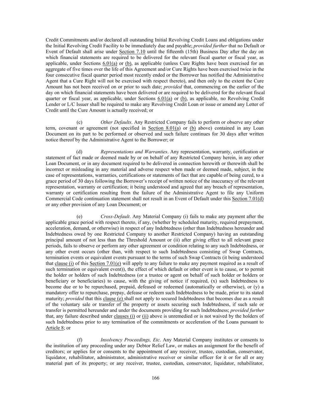 Credit Commitments and/or declared all outstanding Initial Revolving Credit Loans and obligations under the Initial Revolving Credit Facility to be immediately due and payable; provided further that no Default or Event of Default shall arise under Section 7.10 until the fifteenth (15th) Business Day after the day on which financial statements are required to be delivered for the relevant fiscal quarter or fiscal year, as applicable, under Sections 6.01(a) or (b), as applicable (unless Cure Rights have been exercised for an aggregate of five times over the life of this Agreement and/or Cure Rights have been exercised twice in the four consecutive fiscal quarter period most recently ended or the Borrower has notified the Administrative Agent that a Cure Right will not be exercised with respect thereto), and then only to the extent the Cure Amount has not been received on or prior to such date; provided that, commencing on the earlier of the day on which financial statements have been delivered or are required to be delivered for the relevant fiscal quarter or fiscal year, as applicable, under Sections 6.01(a) or (b), as applicable, no Revolving Credit Lender or L/C Issuer shall be required to make any Revolving Credit Loan or issue or amend any Letter of Credit until the Cure Amount is actually received; or (c) Other Defaults. Any Restricted Company fails to perform or observe any other term, covenant or agreement (not specified in Section 8.01(a) or (b) above) contained in any Loan Document on its part to be performed or observed and such failure continues for 30 days after written notice thereof by the Administrative Agent to the Borrower; or (d) Representations and Warranties. Any representation, warranty, certification or statement of fact made or deemed made by or on behalf of any Restricted Company herein, in any other Loan Document, or in any document required to be delivered in connection herewith or therewith shall be incorrect or misleading in any material and adverse respect when made or deemed made, subject, in the case of representations, warranties, certifications or statements of fact that are capable of being cured, to a grace period of 30 days following the Borrower’s receipt of written notice of the inaccuracy of the relevant representation, warranty or certification; it being understood and agreed that any breach of representation, warranty or certification resulting from the failure of the Administrative Agent to file any Uniform Commercial Code continuation statement shall not result in an Event of Default under this Section 7.01(d) or any other provision of any Loan Document; or (e) Cross-Default. Any Material Company (i) fails to make any payment after the applicable grace period with respect thereto, if any, (whether by scheduled maturity, required prepayment, acceleration, demand, or otherwise) in respect of any Indebtedness (other than Indebtedness hereunder and Indebtedness owed by one Restricted Company to another Restricted Company) having an outstanding principal amount of not less than the Threshold Amount or (ii) after giving effect to all relevant grace periods, fails to observe or perform any other agreement or condition relating to any such Indebtedness, or any other event occurs (other than, with respect to such Indebtedness consisting of Swap Contracts, termination events or equivalent events pursuant to the terms of such Swap Contracts (it being understood that clause (i) of this Section 7.01(e) will apply to any failure to make any payment required as a result of such termination or equivalent event)), the effect of which default or other event is to cause, or to permit the holder or holders of such Indebtedness (or a trustee or agent on behalf of such holder or holders or beneficiary or beneficiaries) to cause, with the giving of notice if required, (x) such Indebtedness to become due or to be repurchased, prepaid, defeased or redeemed (automatically or otherwise), or (y) a mandatory offer to repurchase, prepay, defease or redeem such Indebtedness to be made, prior to its stated maturity; provided that this clause (e) shall not apply to secured Indebtedness that becomes due as a result of the voluntary sale or transfer of the property or assets securing such Indebtedness, if such sale or transfer is permitted hereunder and under the documents providing for such Indebtedness; provided further that, any failure described under clauses (i) or (ii) above is unremedied or is not waived by the holders of such Indebtedness prior to any termination of the commitments or acceleration of the Loans pursuant to Article 8; or (f) Insolvency Proceedings, Etc. Any Material Company institutes or consents to the institution of any proceeding under any Debtor Relief Law, or makes an assignment for the benefit of creditors; or applies for or consents to the appointment of any receiver, trustee, custodian, conservator, liquidator, rehabilitator, administrator, administrative receiver or similar officer for it or for all or any material part of its property; or any receiver, trustee, custodian, conservator, liquidator, rehabilitator, 166