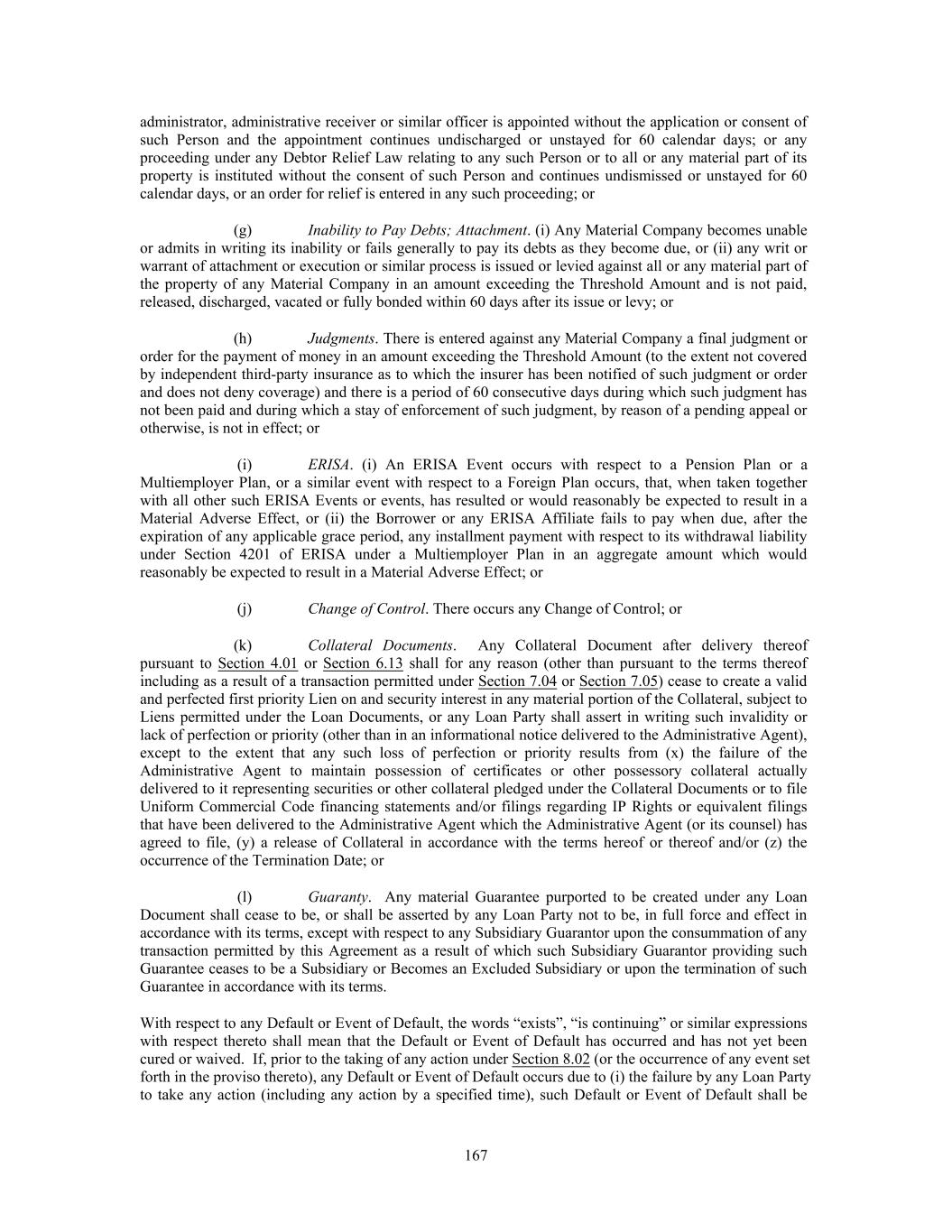 administrator, administrative receiver or similar officer is appointed without the application or consent of such Person and the appointment continues undischarged or unstayed for 60 calendar days; or any proceeding under any Debtor Relief Law relating to any such Person or to all or any material part of its property is instituted without the consent of such Person and continues undismissed or unstayed for 60 calendar days, or an order for relief is entered in any such proceeding; or (g) Inability to Pay Debts; Attachment. (i) Any Material Company becomes unable or admits in writing its inability or fails generally to pay its debts as they become due, or (ii) any writ or warrant of attachment or execution or similar process is issued or levied against all or any material part of the property of any Material Company in an amount exceeding the Threshold Amount and is not paid, released, discharged, vacated or fully bonded within 60 days after its issue or levy; or (h) Judgments. There is entered against any Material Company a final judgment or order for the payment of money in an amount exceeding the Threshold Amount (to the extent not covered by independent third-party insurance as to which the insurer has been notified of such judgment or order and does not deny coverage) and there is a period of 60 consecutive days during which such judgment has not been paid and during which a stay of enforcement of such judgment, by reason of a pending appeal or otherwise, is not in effect; or (i) ERISA. (i) An ERISA Event occurs with respect to a Pension Plan or a Multiemployer Plan, or a similar event with respect to a Foreign Plan occurs, that, when taken together with all other such ERISA Events or events, has resulted or would reasonably be expected to result in a Material Adverse Effect, or (ii) the Borrower or any ERISA Affiliate fails to pay when due, after the expiration of any applicable grace period, any installment payment with respect to its withdrawal liability under Section 4201 of ERISA under a Multiemployer Plan in an aggregate amount which would reasonably be expected to result in a Material Adverse Effect; or (j) Change of Control. There occurs any Change of Control; or (k) Collateral Documents. Any Collateral Document after delivery thereof pursuant to Section 4.01 or Section 6.13 shall for any reason (other than pursuant to the terms thereof including as a result of a transaction permitted under Section 7.04 or Section 7.05) cease to create a valid and perfected first priority Lien on and security interest in any material portion of the Collateral, subject to Liens permitted under the Loan Documents, or any Loan Party shall assert in writing such invalidity or lack of perfection or priority (other than in an informational notice delivered to the Administrative Agent), except to the extent that any such loss of perfection or priority results from (x) the failure of the Administrative Agent to maintain possession of certificates or other possessory collateral actually delivered to it representing securities or other collateral pledged under the Collateral Documents or to file Uniform Commercial Code financing statements and/or filings regarding IP Rights or equivalent filings that have been delivered to the Administrative Agent which the Administrative Agent (or its counsel) has agreed to file, (y) a release of Collateral in accordance with the terms hereof or thereof and/or (z) the occurrence of the Termination Date; or (l) Guaranty. Any material Guarantee purported to be created under any Loan Document shall cease to be, or shall be asserted by any Loan Party not to be, in full force and effect in accordance with its terms, except with respect to any Subsidiary Guarantor upon the consummation of any transaction permitted by this Agreement as a result of which such Subsidiary Guarantor providing such Guarantee ceases to be a Subsidiary or Becomes an Excluded Subsidiary or upon the termination of such Guarantee in accordance with its terms. With respect to any Default or Event of Default, the words “exists”, “is continuing” or similar expressions with respect thereto shall mean that the Default or Event of Default has occurred and has not yet been cured or waived. If, prior to the taking of any action under Section 8.02 (or the occurrence of any event set forth in the proviso thereto), any Default or Event of Default occurs due to (i) the failure by any Loan Party to take any action (including any action by a specified time), such Default or Event of Default shall be 167