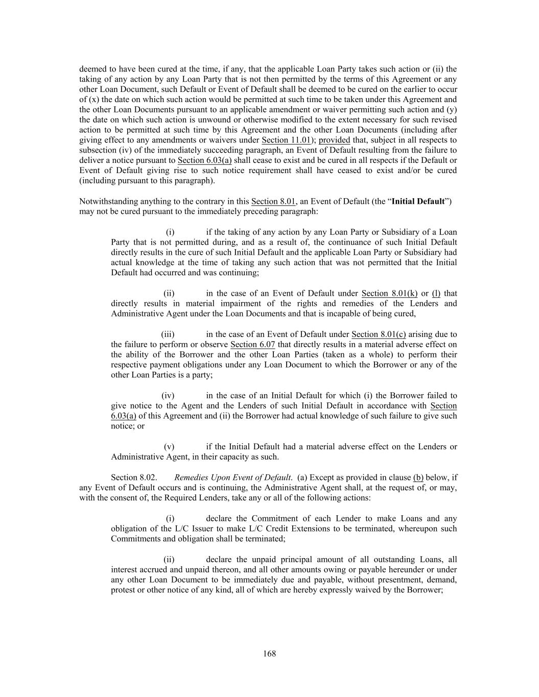 deemed to have been cured at the time, if any, that the applicable Loan Party takes such action or (ii) the taking of any action by any Loan Party that is not then permitted by the terms of this Agreement or any other Loan Document, such Default or Event of Default shall be deemed to be cured on the earlier to occur of (x) the date on which such action would be permitted at such time to be taken under this Agreement and the other Loan Documents pursuant to an applicable amendment or waiver permitting such action and (y) the date on which such action is unwound or otherwise modified to the extent necessary for such revised action to be permitted at such time by this Agreement and the other Loan Documents (including after giving effect to any amendments or waivers under Section 11.01); provided that, subject in all respects to subsection (iv) of the immediately succeeding paragraph, an Event of Default resulting from the failure to deliver a notice pursuant to Section 6.03(a) shall cease to exist and be cured in all respects if the Default or Event of Default giving rise to such notice requirement shall have ceased to exist and/or be cured (including pursuant to this paragraph). Notwithstanding anything to the contrary in this Section 8.01, an Event of Default (the “Initial Default”) may not be cured pursuant to the immediately preceding paragraph: (i) if the taking of any action by any Loan Party or Subsidiary of a Loan Party that is not permitted during, and as a result of, the continuance of such Initial Default directly results in the cure of such Initial Default and the applicable Loan Party or Subsidiary had actual knowledge at the time of taking any such action that was not permitted that the Initial Default had occurred and was continuing; (ii) in the case of an Event of Default under Section 8.01(k) or (l) that directly results in material impairment of the rights and remedies of the Lenders and Administrative Agent under the Loan Documents and that is incapable of being cured, (iii) in the case of an Event of Default under Section 8.01(c) arising due to the failure to perform or observe Section 6.07 that directly results in a material adverse effect on the ability of the Borrower and the other Loan Parties (taken as a whole) to perform their respective payment obligations under any Loan Document to which the Borrower or any of the other Loan Parties is a party; (iv) in the case of an Initial Default for which (i) the Borrower failed to give notice to the Agent and the Lenders of such Initial Default in accordance with Section 6.03(a) of this Agreement and (ii) the Borrower had actual knowledge of such failure to give such notice; or (v) if the Initial Default had a material adverse effect on the Lenders or Administrative Agent, in their capacity as such. Section 8.02. Remedies Upon Event of Default. (a) Except as provided in clause (b) below, if any Event of Default occurs and is continuing, the Administrative Agent shall, at the request of, or may, with the consent of, the Required Lenders, take any or all of the following actions: (i) declare the Commitment of each Lender to make Loans and any obligation of the L/C Issuer to make L/C Credit Extensions to be terminated, whereupon such Commitments and obligation shall be terminated; (ii) declare the unpaid principal amount of all outstanding Loans, all interest accrued and unpaid thereon, and all other amounts owing or payable hereunder or under any other Loan Document to be immediately due and payable, without presentment, demand, protest or other notice of any kind, all of which are hereby expressly waived by the Borrower; 168