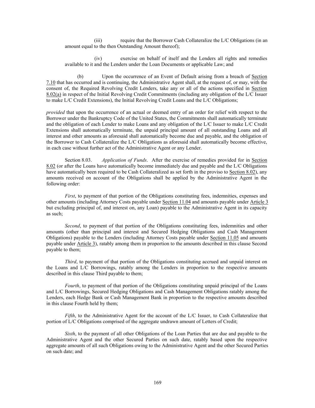 (iii) require that the Borrower Cash Collateralize the L/C Obligations (in an amount equal to the then Outstanding Amount thereof); (iv) exercise on behalf of itself and the Lenders all rights and remedies available to it and the Lenders under the Loan Documents or applicable Law; and (b) Upon the occurrence of an Event of Default arising from a breach of Section 7.10 that has occurred and is continuing, the Administrative Agent shall, at the request of, or may, with the consent of, the Required Revolving Credit Lenders, take any or all of the actions specified in Section 8.02(a) in respect of the Initial Revolving Credit Commitments (including any obligation of the L/C Issuer to make L/C Credit Extensions), the Initial Revolving Credit Loans and the L/C Obligations; provided that upon the occurrence of an actual or deemed entry of an order for relief with respect to the Borrower under the Bankruptcy Code of the United States, the Commitments shall automatically terminate and the obligation of each Lender to make Loans and any obligation of the L/C Issuer to make L/C Credit Extensions shall automatically terminate, the unpaid principal amount of all outstanding Loans and all interest and other amounts as aforesaid shall automatically become due and payable, and the obligation of the Borrower to Cash Collateralize the L/C Obligations as aforesaid shall automatically become effective, in each case without further act of the Administrative Agent or any Lender. Section 8.03. Application of Funds. After the exercise of remedies provided for in Section 8.02 (or after the Loans have automatically become immediately due and payable and the L/C Obligations have automatically been required to be Cash Collateralized as set forth in the proviso to Section 8.02), any amounts received on account of the Obligations shall be applied by the Administrative Agent in the following order: First, to payment of that portion of the Obligations constituting fees, indemnities, expenses and other amounts (including Attorney Costs payable under Section 11.04 and amounts payable under Article 3 but excluding principal of, and interest on, any Loan) payable to the Administrative Agent in its capacity as such; Second, to payment of that portion of the Obligations constituting fees, indemnities and other amounts (other than principal and interest and Secured Hedging Obligations and Cash Management Obligations) payable to the Lenders (including Attorney Costs payable under Section 11.05 and amounts payable under Article 3), ratably among them in proportion to the amounts described in this clause Second payable to them; Third, to payment of that portion of the Obligations constituting accrued and unpaid interest on the Loans and L/C Borrowings, ratably among the Lenders in proportion to the respective amounts described in this clause Third payable to them; Fourth, to payment of that portion of the Obligations constituting unpaid principal of the Loans and L/C Borrowings, Secured Hedging Obligations and Cash Management Obligations ratably among the Lenders, each Hedge Bank or Cash Management Bank in proportion to the respective amounts described in this clause Fourth held by them; Fifth, to the Administrative Agent for the account of the L/C Issuer, to Cash Collateralize that portion of L/C Obligations comprised of the aggregate undrawn amount of Letters of Credit; Sixth, to the payment of all other Obligations of the Loan Parties that are due and payable to the Administrative Agent and the other Secured Parties on such date, ratably based upon the respective aggregate amounts of all such Obligations owing to the Administrative Agent and the other Secured Parties on such date; and 169