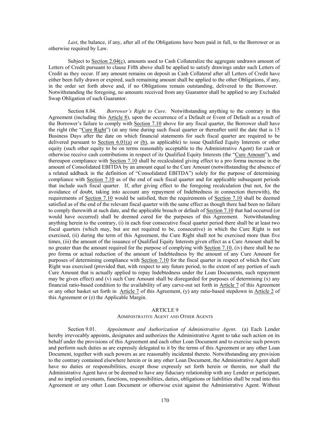 Last, the balance, if any, after all of the Obligations have been paid in full, to the Borrower or as otherwise required by Law. Subject to Section 2.04(c), amounts used to Cash Collateralize the aggregate undrawn amount of Letters of Credit pursuant to clause Fifth above shall be applied to satisfy drawings under such Letters of Credit as they occur. If any amount remains on deposit as Cash Collateral after all Letters of Credit have either been fully drawn or expired, such remaining amount shall be applied to the other Obligations, if any, in the order set forth above and, if no Obligations remain outstanding, delivered to the Borrower. Notwithstanding the foregoing, no amounts received from any Guarantor shall be applied to any Excluded Swap Obligation of such Guarantor. Section 8.04. Borrower’s Right to Cure. Notwithstanding anything to the contrary in this Agreement (including this Article 8), upon the occurrence of a Default or Event of Default as a result of the Borrower’s failure to comply with Section 7.10 above for any fiscal quarter, the Borrower shall have the right (the “Cure Right”) (at any time during such fiscal quarter or thereafter until the date that is 15 Business Days after the date on which financial statements for such fiscal quarter are required to be delivered pursuant to Section 6.01(a) or (b), as applicable) to issue Qualified Equity Interests or other equity (such other equity to be on terms reasonably acceptable to the Administrative Agent) for cash or otherwise receive cash contributions in respect of its Qualified Equity Interests (the “Cure Amount”), and thereupon compliance with Section 7.10 shall be recalculated giving effect to a pro forma increase in the amount of Consolidated EBITDA by an amount equal to the Cure Amount (notwithstanding the absence of a related addback in the definition of “Consolidated EBITDA”) solely for the purpose of determining compliance with Section 7.10 as of the end of such fiscal quarter and for applicable subsequent periods that include such fiscal quarter. If, after giving effect to the foregoing recalculation (but not, for the avoidance of doubt, taking into account any repayment of Indebtedness in connection therewith), the requirements of Section 7.10 would be satisfied, then the requirements of Section 7.10 shall be deemed satisfied as of the end of the relevant fiscal quarter with the same effect as though there had been no failure to comply therewith at such date, and the applicable breach or default of Section 7.10 that had occurred (or would have occurred) shall be deemed cured for the purposes of this Agreement. Notwithstanding anything herein to the contrary, (i) in each four consecutive fiscal quarter period there shall be at least two fiscal quarters (which may, but are not required to be, consecutive) in which the Cure Right is not exercised, (ii) during the term of this Agreement, the Cure Right shall not be exercised more than five times, (iii) the amount of the issuance of Qualified Equity Interests given effect as a Cure Amount shall be no greater than the amount required for the purpose of complying with Section 7.10, (iv) there shall be no pro forma or actual reduction of the amount of Indebtedness by the amount of any Cure Amount for purposes of determining compliance with Section 7.10 for the fiscal quarter in respect of which the Cure Right was exercised (provided that, with respect to any future period, to the extent of any portion of such Cure Amount that is actually applied to repay Indebtedness under the Loan Documents, such repayment may be given effect) and (v) such Cure Amount shall be disregarded for purposes of determining (x) any financial ratio-based condition to the availability of any carve-out set forth in Article 7 of this Agreement or any other basket set forth in Article 7 of this Agreement, (y) any ratio-based stepdown in Article 2 of this Agreement or (z) the Applicable Margin. ARTICLE 9 ADMINISTRATIVE AGENT AND OTHER AGENTS Section 9.01. Appointment and Authorization of Administrative Agent. (a) Each Lender hereby irrevocably appoints, designates and authorizes the Administrative Agent to take such action on its behalf under the provisions of this Agreement and each other Loan Document and to exercise such powers and perform such duties as are expressly delegated to it by the terms of this Agreement or any other Loan Document, together with such powers as are reasonably incidental thereto. Notwithstanding any provision to the contrary contained elsewhere herein or in any other Loan Document, the Administrative Agent shall have no duties or responsibilities, except those expressly set forth herein or therein, nor shall the Administrative Agent have or be deemed to have any fiduciary relationship with any Lender or participant, and no implied covenants, functions, responsibilities, duties, obligations or liabilities shall be read into this Agreement or any other Loan Document or otherwise exist against the Administrative Agent. Without 170