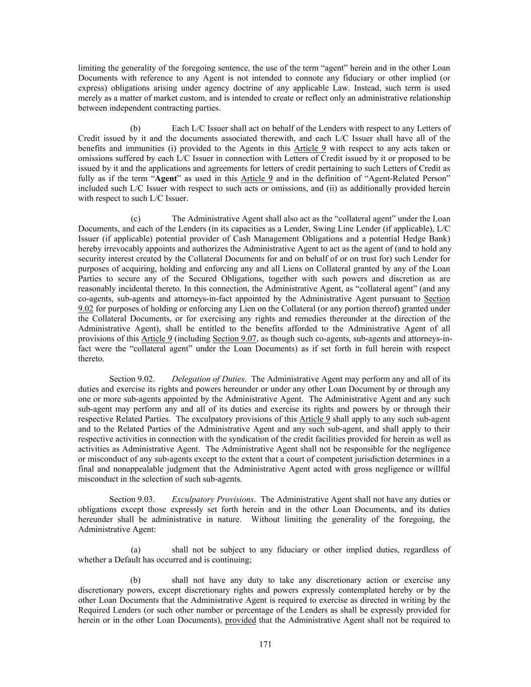 limiting the generality of the foregoing sentence, the use of the term “agent” herein and in the other Loan Documents with reference to any Agent is not intended to connote any fiduciary or other implied (or express) obligations arising under agency doctrine of any applicable Law. Instead, such term is used merely as a matter of market custom, and is intended to create or reflect only an administrative relationship between independent contracting parties. (b) Each L/C Issuer shall act on behalf of the Lenders with respect to any Letters of Credit issued by it and the documents associated therewith, and each L/C Issuer shall have all of the benefits and immunities (i) provided to the Agents in this Article 9 with respect to any acts taken or omissions suffered by each L/C Issuer in connection with Letters of Credit issued by it or proposed to be issued by it and the applications and agreements for letters of credit pertaining to such Letters of Credit as fully as if the term “Agent” as used in this Article 9 and in the definition of “Agent-Related Person” included such L/C Issuer with respect to such acts or omissions, and (ii) as additionally provided herein with respect to such L/C Issuer. (c) The Administrative Agent shall also act as the “collateral agent” under the Loan Documents, and each of the Lenders (in its capacities as a Lender, Swing Line Lender (if applicable), L/C Issuer (if applicable) potential provider of Cash Management Obligations and a potential Hedge Bank) hereby irrevocably appoints and authorizes the Administrative Agent to act as the agent of (and to hold any security interest created by the Collateral Documents for and on behalf of or on trust for) such Lender for purposes of acquiring, holding and enforcing any and all Liens on Collateral granted by any of the Loan Parties to secure any of the Secured Obligations, together with such powers and discretion as are reasonably incidental thereto. In this connection, the Administrative Agent, as “collateral agent” (and any co-agents, sub-agents and attorneys-in-fact appointed by the Administrative Agent pursuant to Section 9.02 for purposes of holding or enforcing any Lien on the Collateral (or any portion thereof) granted under the Collateral Documents, or for exercising any rights and remedies thereunder at the direction of the Administrative Agent), shall be entitled to the benefits afforded to the Administrative Agent of all provisions of this Article 9 (including Section 9.07, as though such co-agents, sub-agents and attorneys-in- fact were the “collateral agent” under the Loan Documents) as if set forth in full herein with respect thereto. Section 9.02. Delegation of Duties. The Administrative Agent may perform any and all of its duties and exercise its rights and powers hereunder or under any other Loan Document by or through any one or more sub-agents appointed by the Administrative Agent. The Administrative Agent and any such sub-agent may perform any and all of its duties and exercise its rights and powers by or through their respective Related Parties. The exculpatory provisions of this Article 9 shall apply to any such sub-agent and to the Related Parties of the Administrative Agent and any such sub-agent, and shall apply to their respective activities in connection with the syndication of the credit facilities provided for herein as well as activities as Administrative Agent. The Administrative Agent shall not be responsible for the negligence or misconduct of any sub-agents except to the extent that a court of competent jurisdiction determines in a final and nonappealable judgment that the Administrative Agent acted with gross negligence or willful misconduct in the selection of such sub-agents. Section 9.03. Exculpatory Provisions. The Administrative Agent shall not have any duties or obligations except those expressly set forth herein and in the other Loan Documents, and its duties hereunder shall be administrative in nature. Without limiting the generality of the foregoing, the Administrative Agent: (a) shall not be subject to any fiduciary or other implied duties, regardless of whether a Default has occurred and is continuing; (b) shall not have any duty to take any discretionary action or exercise any discretionary powers, except discretionary rights and powers expressly contemplated hereby or by the other Loan Documents that the Administrative Agent is required to exercise as directed in writing by the Required Lenders (or such other number or percentage of the Lenders as shall be expressly provided for herein or in the other Loan Documents), provided that the Administrative Agent shall not be required to 171