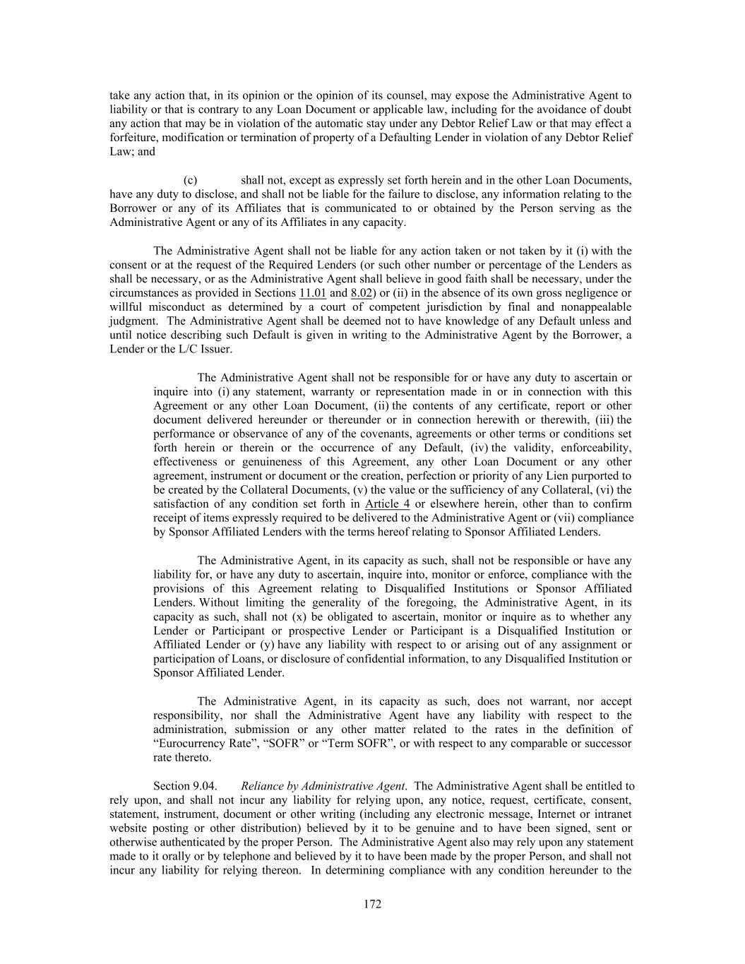 take any action that, in its opinion or the opinion of its counsel, may expose the Administrative Agent to liability or that is contrary to any Loan Document or applicable law, including for the avoidance of doubt any action that may be in violation of the automatic stay under any Debtor Relief Law or that may effect a forfeiture, modification or termination of property of a Defaulting Lender in violation of any Debtor Relief Law; and (c) shall not, except as expressly set forth herein and in the other Loan Documents, have any duty to disclose, and shall not be liable for the failure to disclose, any information relating to the Borrower or any of its Affiliates that is communicated to or obtained by the Person serving as the Administrative Agent or any of its Affiliates in any capacity. The Administrative Agent shall not be liable for any action taken or not taken by it (i) with the consent or at the request of the Required Lenders (or such other number or percentage of the Lenders as shall be necessary, or as the Administrative Agent shall believe in good faith shall be necessary, under the circumstances as provided in Sections 11.01 and 8.02) or (ii) in the absence of its own gross negligence or willful misconduct as determined by a court of competent jurisdiction by final and nonappealable judgment. The Administrative Agent shall be deemed not to have knowledge of any Default unless and until notice describing such Default is given in writing to the Administrative Agent by the Borrower, a Lender or the L/C Issuer. The Administrative Agent shall not be responsible for or have any duty to ascertain or inquire into (i) any statement, warranty or representation made in or in connection with this Agreement or any other Loan Document, (ii) the contents of any certificate, report or other document delivered hereunder or thereunder or in connection herewith or therewith, (iii) the performance or observance of any of the covenants, agreements or other terms or conditions set forth herein or therein or the occurrence of any Default, (iv) the validity, enforceability, effectiveness or genuineness of this Agreement, any other Loan Document or any other agreement, instrument or document or the creation, perfection or priority of any Lien purported to be created by the Collateral Documents, (v) the value or the sufficiency of any Collateral, (vi) the satisfaction of any condition set forth in Article 4 or elsewhere herein, other than to confirm receipt of items expressly required to be delivered to the Administrative Agent or (vii) compliance by Sponsor Affiliated Lenders with the terms hereof relating to Sponsor Affiliated Lenders. The Administrative Agent, in its capacity as such, shall not be responsible or have any liability for, or have any duty to ascertain, inquire into, monitor or enforce, compliance with the provisions of this Agreement relating to Disqualified Institutions or Sponsor Affiliated Lenders. Without limiting the generality of the foregoing, the Administrative Agent, in its capacity as such, shall not (x) be obligated to ascertain, monitor or inquire as to whether any Lender or Participant or prospective Lender or Participant is a Disqualified Institution or Affiliated Lender or (y) have any liability with respect to or arising out of any assignment or participation of Loans, or disclosure of confidential information, to any Disqualified Institution or Sponsor Affiliated Lender. The Administrative Agent, in its capacity as such, does not warrant, nor accept responsibility, nor shall the Administrative Agent have any liability with respect to the administration, submission or any other matter related to the rates in the definition of “Eurocurrency Rate”, “SOFR” or “Term SOFR”, or with respect to any comparable or successor rate thereto. Section 9.04. Reliance by Administrative Agent. The Administrative Agent shall be entitled to rely upon, and shall not incur any liability for relying upon, any notice, request, certificate, consent, statement, instrument, document or other writing (including any electronic message, Internet or intranet website posting or other distribution) believed by it to be genuine and to have been signed, sent or otherwise authenticated by the proper Person. The Administrative Agent also may rely upon any statement made to it orally or by telephone and believed by it to have been made by the proper Person, and shall not incur any liability for relying thereon. In determining compliance with any condition hereunder to the 172