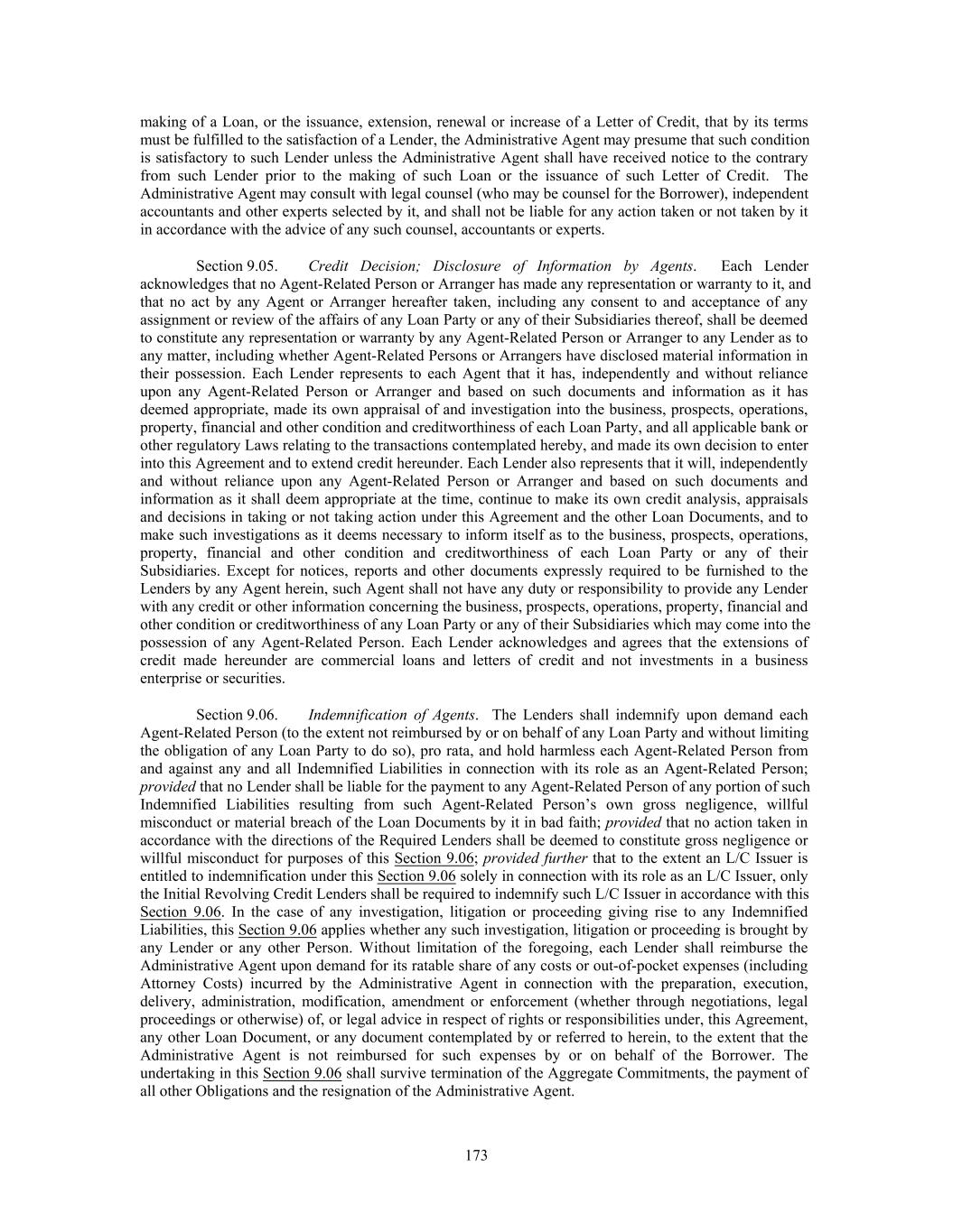 making of a Loan, or the issuance, extension, renewal or increase of a Letter of Credit, that by its terms must be fulfilled to the satisfaction of a Lender, the Administrative Agent may presume that such condition is satisfactory to such Lender unless the Administrative Agent shall have received notice to the contrary from such Lender prior to the making of such Loan or the issuance of such Letter of Credit. The Administrative Agent may consult with legal counsel (who may be counsel for the Borrower), independent accountants and other experts selected by it, and shall not be liable for any action taken or not taken by it in accordance with the advice of any such counsel, accountants or experts. Section 9.05. Credit Decision; Disclosure of Information by Agents. Each Lender acknowledges that no Agent-Related Person or Arranger has made any representation or warranty to it, and that no act by any Agent or Arranger hereafter taken, including any consent to and acceptance of any assignment or review of the affairs of any Loan Party or any of their Subsidiaries thereof, shall be deemed to constitute any representation or warranty by any Agent-Related Person or Arranger to any Lender as to any matter, including whether Agent-Related Persons or Arrangers have disclosed material information in their possession. Each Lender represents to each Agent that it has, independently and without reliance upon any Agent-Related Person or Arranger and based on such documents and information as it has deemed appropriate, made its own appraisal of and investigation into the business, prospects, operations, property, financial and other condition and creditworthiness of each Loan Party, and all applicable bank or other regulatory Laws relating to the transactions contemplated hereby, and made its own decision to enter into this Agreement and to extend credit hereunder. Each Lender also represents that it will, independently and without reliance upon any Agent-Related Person or Arranger and based on such documents and information as it shall deem appropriate at the time, continue to make its own credit analysis, appraisals and decisions in taking or not taking action under this Agreement and the other Loan Documents, and to make such investigations as it deems necessary to inform itself as to the business, prospects, operations, property, financial and other condition and creditworthiness of each Loan Party or any of their Subsidiaries. Except for notices, reports and other documents expressly required to be furnished to the Lenders by any Agent herein, such Agent shall not have any duty or responsibility to provide any Lender with any credit or other information concerning the business, prospects, operations, property, financial and other condition or creditworthiness of any Loan Party or any of their Subsidiaries which may come into the possession of any Agent-Related Person. Each Lender acknowledges and agrees that the extensions of credit made hereunder are commercial loans and letters of credit and not investments in a business enterprise or securities. Section 9.06. Indemnification of Agents. The Lenders shall indemnify upon demand each Agent-Related Person (to the extent not reimbursed by or on behalf of any Loan Party and without limiting the obligation of any Loan Party to do so), pro rata, and hold harmless each Agent-Related Person from and against any and all Indemnified Liabilities in connection with its role as an Agent-Related Person; provided that no Lender shall be liable for the payment to any Agent-Related Person of any portion of such Indemnified Liabilities resulting from such Agent-Related Person’s own gross negligence, willful misconduct or material breach of the Loan Documents by it in bad faith; provided that no action taken in accordance with the directions of the Required Lenders shall be deemed to constitute gross negligence or willful misconduct for purposes of this Section 9.06; provided further that to the extent an L/C Issuer is entitled to indemnification under this Section 9.06 solely in connection with its role as an L/C Issuer, only the Initial Revolving Credit Lenders shall be required to indemnify such L/C Issuer in accordance with this Section 9.06. In the case of any investigation, litigation or proceeding giving rise to any Indemnified Liabilities, this Section 9.06 applies whether any such investigation, litigation or proceeding is brought by any Lender or any other Person. Without limitation of the foregoing, each Lender shall reimburse the Administrative Agent upon demand for its ratable share of any costs or out-of-pocket expenses (including Attorney Costs) incurred by the Administrative Agent in connection with the preparation, execution, delivery, administration, modification, amendment or enforcement (whether through negotiations, legal proceedings or otherwise) of, or legal advice in respect of rights or responsibilities under, this Agreement, any other Loan Document, or any document contemplated by or referred to herein, to the extent that the Administrative Agent is not reimbursed for such expenses by or on behalf of the Borrower. The undertaking in this Section 9.06 shall survive termination of the Aggregate Commitments, the payment of all other Obligations and the resignation of the Administrative Agent. 173