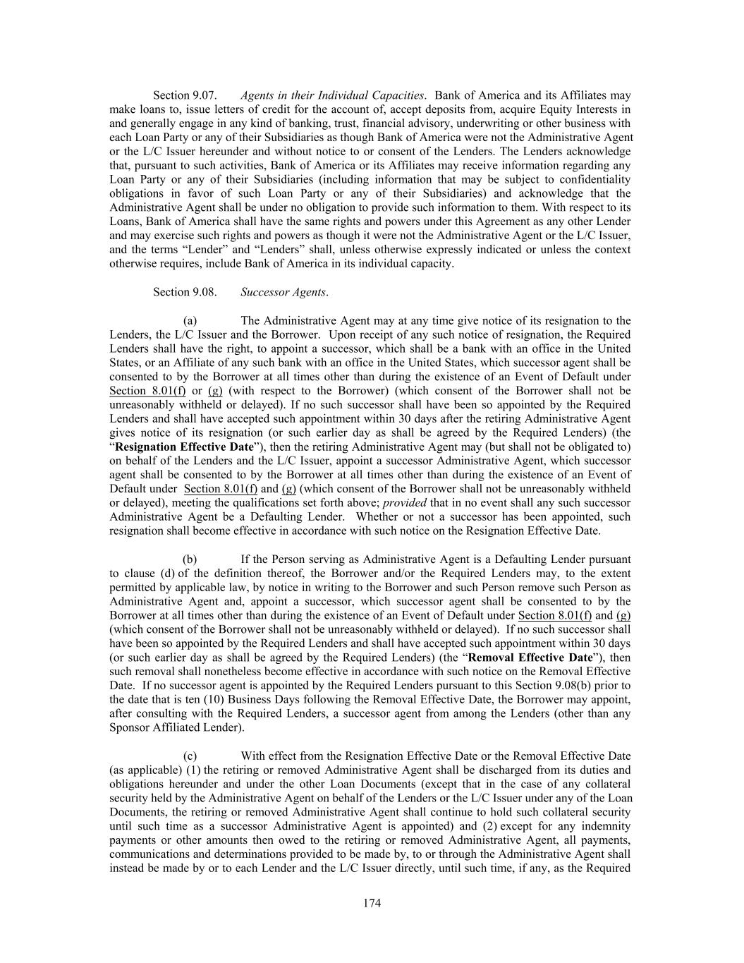 Section 9.07. Agents in their Individual Capacities. Bank of America and its Affiliates may make loans to, issue letters of credit for the account of, accept deposits from, acquire Equity Interests in and generally engage in any kind of banking, trust, financial advisory, underwriting or other business with each Loan Party or any of their Subsidiaries as though Bank of America were not the Administrative Agent or the L/C Issuer hereunder and without notice to or consent of the Lenders. The Lenders acknowledge that, pursuant to such activities, Bank of America or its Affiliates may receive information regarding any Loan Party or any of their Subsidiaries (including information that may be subject to confidentiality obligations in favor of such Loan Party or any of their Subsidiaries) and acknowledge that the Administrative Agent shall be under no obligation to provide such information to them. With respect to its Loans, Bank of America shall have the same rights and powers under this Agreement as any other Lender and may exercise such rights and powers as though it were not the Administrative Agent or the L/C Issuer, and the terms “Lender” and “Lenders” shall, unless otherwise expressly indicated or unless the context otherwise requires, include Bank of America in its individual capacity. Section 9.08. Successor Agents. (a) The Administrative Agent may at any time give notice of its resignation to the Lenders, the L/C Issuer and the Borrower. Upon receipt of any such notice of resignation, the Required Lenders shall have the right, to appoint a successor, which shall be a bank with an office in the United States, or an Affiliate of any such bank with an office in the United States, which successor agent shall be consented to by the Borrower at all times other than during the existence of an Event of Default under Section 8.01(f) or (g) (with respect to the Borrower) (which consent of the Borrower shall not be unreasonably withheld or delayed). If no such successor shall have been so appointed by the Required Lenders and shall have accepted such appointment within 30 days after the retiring Administrative Agent gives notice of its resignation (or such earlier day as shall be agreed by the Required Lenders) (the “Resignation Effective Date”), then the retiring Administrative Agent may (but shall not be obligated to) on behalf of the Lenders and the L/C Issuer, appoint a successor Administrative Agent, which successor agent shall be consented to by the Borrower at all times other than during the existence of an Event of Default under Section 8.01(f) and (g) (which consent of the Borrower shall not be unreasonably withheld or delayed), meeting the qualifications set forth above; provided that in no event shall any such successor Administrative Agent be a Defaulting Lender. Whether or not a successor has been appointed, such resignation shall become effective in accordance with such notice on the Resignation Effective Date. (b) If the Person serving as Administrative Agent is a Defaulting Lender pursuant to clause (d) of the definition thereof, the Borrower and/or the Required Lenders may, to the extent permitted by applicable law, by notice in writing to the Borrower and such Person remove such Person as Administrative Agent and, appoint a successor, which successor agent shall be consented to by the Borrower at all times other than during the existence of an Event of Default under Section 8.01(f) and (g) (which consent of the Borrower shall not be unreasonably withheld or delayed). If no such successor shall have been so appointed by the Required Lenders and shall have accepted such appointment within 30 days (or such earlier day as shall be agreed by the Required Lenders) (the “Removal Effective Date”), then such removal shall nonetheless become effective in accordance with such notice on the Removal Effective Date. If no successor agent is appointed by the Required Lenders pursuant to this Section 9.08(b) prior to the date that is ten (10) Business Days following the Removal Effective Date, the Borrower may appoint, after consulting with the Required Lenders, a successor agent from among the Lenders (other than any Sponsor Affiliated Lender). (c) With effect from the Resignation Effective Date or the Removal Effective Date (as applicable) (1) the retiring or removed Administrative Agent shall be discharged from its duties and obligations hereunder and under the other Loan Documents (except that in the case of any collateral security held by the Administrative Agent on behalf of the Lenders or the L/C Issuer under any of the Loan Documents, the retiring or removed Administrative Agent shall continue to hold such collateral security until such time as a successor Administrative Agent is appointed) and (2) except for any indemnity payments or other amounts then owed to the retiring or removed Administrative Agent, all payments, communications and determinations provided to be made by, to or through the Administrative Agent shall instead be made by or to each Lender and the L/C Issuer directly, until such time, if any, as the Required 174