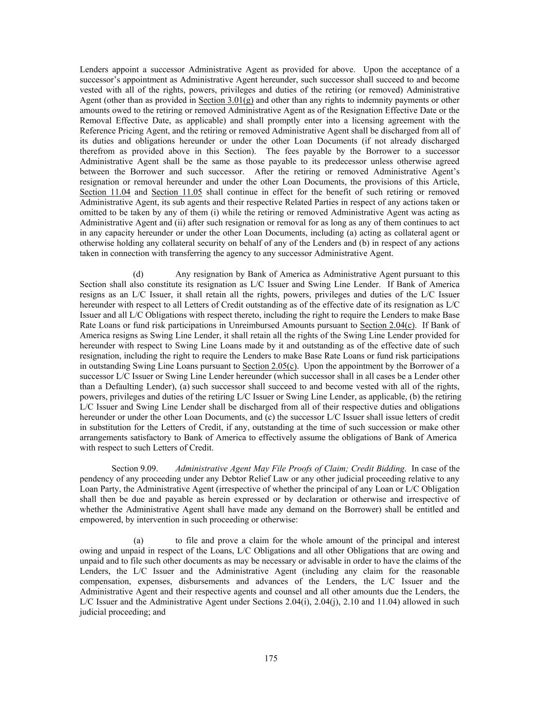 Lenders appoint a successor Administrative Agent as provided for above. Upon the acceptance of a successor’s appointment as Administrative Agent hereunder, such successor shall succeed to and become vested with all of the rights, powers, privileges and duties of the retiring (or removed) Administrative Agent (other than as provided in Section 3.01(g) and other than any rights to indemnity payments or other amounts owed to the retiring or removed Administrative Agent as of the Resignation Effective Date or the Removal Effective Date, as applicable) and shall promptly enter into a licensing agreement with the Reference Pricing Agent, and the retiring or removed Administrative Agent shall be discharged from all of its duties and obligations hereunder or under the other Loan Documents (if not already discharged therefrom as provided above in this Section). The fees payable by the Borrower to a successor Administrative Agent shall be the same as those payable to its predecessor unless otherwise agreed between the Borrower and such successor. After the retiring or removed Administrative Agent’s resignation or removal hereunder and under the other Loan Documents, the provisions of this Article, Section 11.04 and Section 11.05 shall continue in effect for the benefit of such retiring or removed Administrative Agent, its sub agents and their respective Related Parties in respect of any actions taken or omitted to be taken by any of them (i) while the retiring or removed Administrative Agent was acting as Administrative Agent and (ii) after such resignation or removal for as long as any of them continues to act in any capacity hereunder or under the other Loan Documents, including (a) acting as collateral agent or otherwise holding any collateral security on behalf of any of the Lenders and (b) in respect of any actions taken in connection with transferring the agency to any successor Administrative Agent. (d) Any resignation by Bank of America as Administrative Agent pursuant to this Section shall also constitute its resignation as L/C Issuer and Swing Line Lender. If Bank of America resigns as an L/C Issuer, it shall retain all the rights, powers, privileges and duties of the L/C Issuer hereunder with respect to all Letters of Credit outstanding as of the effective date of its resignation as L/C Issuer and all L/C Obligations with respect thereto, including the right to require the Lenders to make Base Rate Loans or fund risk participations in Unreimbursed Amounts pursuant to Section 2.04(c). If Bank of America resigns as Swing Line Lender, it shall retain all the rights of the Swing Line Lender provided for hereunder with respect to Swing Line Loans made by it and outstanding as of the effective date of such resignation, including the right to require the Lenders to make Base Rate Loans or fund risk participations in outstanding Swing Line Loans pursuant to Section 2.05(c). Upon the appointment by the Borrower of a successor L/C Issuer or Swing Line Lender hereunder (which successor shall in all cases be a Lender other than a Defaulting Lender), (a) such successor shall succeed to and become vested with all of the rights, powers, privileges and duties of the retiring L/C Issuer or Swing Line Lender, as applicable, (b) the retiring L/C Issuer and Swing Line Lender shall be discharged from all of their respective duties and obligations hereunder or under the other Loan Documents, and (c) the successor L/C Issuer shall issue letters of credit in substitution for the Letters of Credit, if any, outstanding at the time of such succession or make other arrangements satisfactory to Bank of America to effectively assume the obligations of Bank of America with respect to such Letters of Credit. Section 9.09. Administrative Agent May File Proofs of Claim; Credit Bidding. In case of the pendency of any proceeding under any Debtor Relief Law or any other judicial proceeding relative to any Loan Party, the Administrative Agent (irrespective of whether the principal of any Loan or L/C Obligation shall then be due and payable as herein expressed or by declaration or otherwise and irrespective of whether the Administrative Agent shall have made any demand on the Borrower) shall be entitled and empowered, by intervention in such proceeding or otherwise: (a) to file and prove a claim for the whole amount of the principal and interest owing and unpaid in respect of the Loans, L/C Obligations and all other Obligations that are owing and unpaid and to file such other documents as may be necessary or advisable in order to have the claims of the Lenders, the L/C Issuer and the Administrative Agent (including any claim for the reasonable compensation, expenses, disbursements and advances of the Lenders, the L/C Issuer and the Administrative Agent and their respective agents and counsel and all other amounts due the Lenders, the L/C Issuer and the Administrative Agent under Sections 2.04(i), 2.04(j), 2.10 and 11.04) allowed in such judicial proceeding; and 175