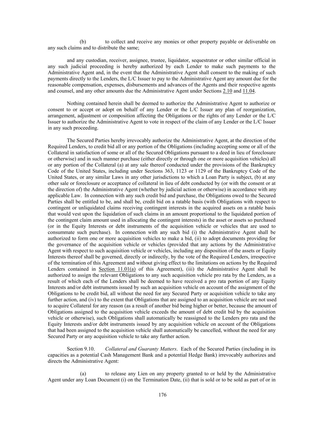 (b) to collect and receive any monies or other property payable or deliverable on any such claims and to distribute the same; and any custodian, receiver, assignee, trustee, liquidator, sequestrator or other similar official in any such judicial proceeding is hereby authorized by each Lender to make such payments to the Administrative Agent and, in the event that the Administrative Agent shall consent to the making of such payments directly to the Lenders, the L/C Issuer to pay to the Administrative Agent any amount due for the reasonable compensation, expenses, disbursements and advances of the Agents and their respective agents and counsel, and any other amounts due the Administrative Agent under Sections 2.10 and 11.04. Nothing contained herein shall be deemed to authorize the Administrative Agent to authorize or consent to or accept or adopt on behalf of any Lender or the L/C Issuer any plan of reorganization, arrangement, adjustment or composition affecting the Obligations or the rights of any Lender or the L/C Issuer to authorize the Administrative Agent to vote in respect of the claim of any Lender or the L/C Issuer in any such proceeding. The Secured Parties hereby irrevocably authorize the Administrative Agent, at the direction of the Required Lenders, to credit bid all or any portion of the Obligations (including accepting some or all of the Collateral in satisfaction of some or all of the Secured Obligations pursuant to a deed in lieu of foreclosure or otherwise) and in such manner purchase (either directly or through one or more acquisition vehicles) all or any portion of the Collateral (a) at any sale thereof conducted under the provisions of the Bankruptcy Code of the United States, including under Sections 363, 1123 or 1129 of the Bankruptcy Code of the United States, or any similar Laws in any other jurisdictions to which a Loan Party is subject, (b) at any other sale or foreclosure or acceptance of collateral in lieu of debt conducted by (or with the consent or at the direction of) the Administrative Agent (whether by judicial action or otherwise) in accordance with any applicable Law. In connection with any such credit bid and purchase, the Obligations owed to the Secured Parties shall be entitled to be, and shall be, credit bid on a ratable basis (with Obligations with respect to contingent or unliquidated claims receiving contingent interests in the acquired assets on a ratable basis that would vest upon the liquidation of such claims in an amount proportional to the liquidated portion of the contingent claim amount used in allocating the contingent interests) in the asset or assets so purchased (or in the Equity Interests or debt instruments of the acquisition vehicle or vehicles that are used to consummate such purchase). In connection with any such bid (i) the Administrative Agent shall be authorized to form one or more acquisition vehicles to make a bid, (ii) to adopt documents providing for the governance of the acquisition vehicle or vehicles (provided that any actions by the Administrative Agent with respect to such acquisition vehicle or vehicles, including any disposition of the assets or Equity Interests thereof shall be governed, directly or indirectly, by the vote of the Required Lenders, irrespective of the termination of this Agreement and without giving effect to the limitations on actions by the Required Lenders contained in Section 11.01(a) of this Agreement), (iii) the Administrative Agent shall be authorized to assign the relevant Obligations to any such acquisition vehicle pro rata by the Lenders, as a result of which each of the Lenders shall be deemed to have received a pro rata portion of any Equity Interests and/or debt instruments issued by such an acquisition vehicle on account of the assignment of the Obligations to be credit bid, all without the need for any Secured Party or acquisition vehicle to take any further action, and (iv) to the extent that Obligations that are assigned to an acquisition vehicle are not used to acquire Collateral for any reason (as a result of another bid being higher or better, because the amount of Obligations assigned to the acquisition vehicle exceeds the amount of debt credit bid by the acquisition vehicle or otherwise), such Obligations shall automatically be reassigned to the Lenders pro rata and the Equity Interests and/or debt instruments issued by any acquisition vehicle on account of the Obligations that had been assigned to the acquisition vehicle shall automatically be cancelled, without the need for any Secured Party or any acquisition vehicle to take any further action. Section 9.10. Collateral and Guaranty Matters. Each of the Secured Parties (including in its capacities as a potential Cash Management Bank and a potential Hedge Bank) irrevocably authorizes and directs the Administrative Agent: (a) to release any Lien on any property granted to or held by the Administrative Agent under any Loan Document (i) on the Termination Date, (ii) that is sold or to be sold as part of or in 176
