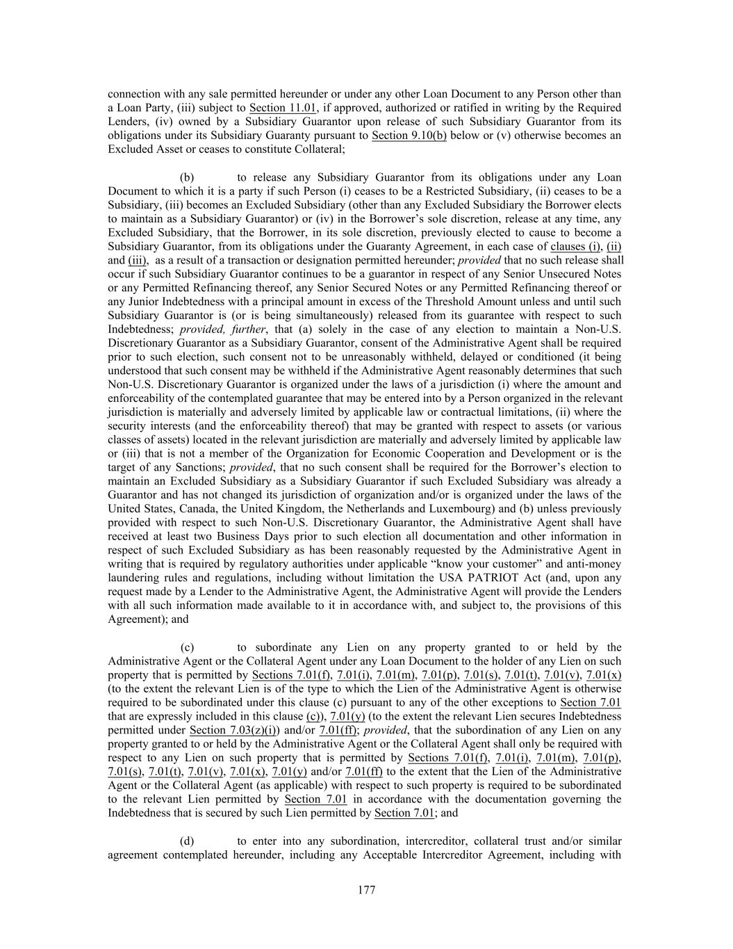 connection with any sale permitted hereunder or under any other Loan Document to any Person other than a Loan Party, (iii) subject to Section 11.01, if approved, authorized or ratified in writing by the Required Lenders, (iv) owned by a Subsidiary Guarantor upon release of such Subsidiary Guarantor from its obligations under its Subsidiary Guaranty pursuant to Section 9.10(b) below or (v) otherwise becomes an Excluded Asset or ceases to constitute Collateral; (b) to release any Subsidiary Guarantor from its obligations under any Loan Document to which it is a party if such Person (i) ceases to be a Restricted Subsidiary, (ii) ceases to be a Subsidiary, (iii) becomes an Excluded Subsidiary (other than any Excluded Subsidiary the Borrower elects to maintain as a Subsidiary Guarantor) or (iv) in the Borrower’s sole discretion, release at any time, any Excluded Subsidiary, that the Borrower, in its sole discretion, previously elected to cause to become a Subsidiary Guarantor, from its obligations under the Guaranty Agreement, in each case of clauses (i), (ii) and (iii), as a result of a transaction or designation permitted hereunder; provided that no such release shall occur if such Subsidiary Guarantor continues to be a guarantor in respect of any Senior Unsecured Notes or any Permitted Refinancing thereof, any Senior Secured Notes or any Permitted Refinancing thereof or any Junior Indebtedness with a principal amount in excess of the Threshold Amount unless and until such Subsidiary Guarantor is (or is being simultaneously) released from its guarantee with respect to such Indebtedness; provided, further, that (a) solely in the case of any election to maintain a Non-U.S. Discretionary Guarantor as a Subsidiary Guarantor, consent of the Administrative Agent shall be required prior to such election, such consent not to be unreasonably withheld, delayed or conditioned (it being understood that such consent may be withheld if the Administrative Agent reasonably determines that such Non-U.S. Discretionary Guarantor is organized under the laws of a jurisdiction (i) where the amount and enforceability of the contemplated guarantee that may be entered into by a Person organized in the relevant jurisdiction is materially and adversely limited by applicable law or contractual limitations, (ii) where the security interests (and the enforceability thereof) that may be granted with respect to assets (or various classes of assets) located in the relevant jurisdiction are materially and adversely limited by applicable law or (iii) that is not a member of the Organization for Economic Cooperation and Development or is the target of any Sanctions; provided, that no such consent shall be required for the Borrower’s election to maintain an Excluded Subsidiary as a Subsidiary Guarantor if such Excluded Subsidiary was already a Guarantor and has not changed its jurisdiction of organization and/or is organized under the laws of the United States, Canada, the United Kingdom, the Netherlands and Luxembourg) and (b) unless previously provided with respect to such Non-U.S. Discretionary Guarantor, the Administrative Agent shall have received at least two Business Days prior to such election all documentation and other information in respect of such Excluded Subsidiary as has been reasonably requested by the Administrative Agent in writing that is required by regulatory authorities under applicable “know your customer” and anti-money laundering rules and regulations, including without limitation the USA PATRIOT Act (and, upon any request made by a Lender to the Administrative Agent, the Administrative Agent will provide the Lenders with all such information made available to it in accordance with, and subject to, the provisions of this Agreement); and (c) to subordinate any Lien on any property granted to or held by the Administrative Agent or the Collateral Agent under any Loan Document to the holder of any Lien on such property that is permitted by Sections 7.01(f), 7.01(i), 7.01(m), 7.01(p), 7.01(s), 7.01(t), 7.01(v), 7.01(x) (to the extent the relevant Lien is of the type to which the Lien of the Administrative Agent is otherwise required to be subordinated under this clause (c) pursuant to any of the other exceptions to Section 7.01 that are expressly included in this clause (c)), 7.01(y) (to the extent the relevant Lien secures Indebtedness permitted under Section 7.03(z)(i)) and/or 7.01(ff); provided, that the subordination of any Lien on any property granted to or held by the Administrative Agent or the Collateral Agent shall only be required with respect to any Lien on such property that is permitted by Sections 7.01(f), 7.01(i), 7.01(m), 7.01(p), 7.01(s), 7.01(t), 7.01(v), 7.01(x), 7.01(y) and/or 7.01(ff) to the extent that the Lien of the Administrative Agent or the Collateral Agent (as applicable) with respect to such property is required to be subordinated to the relevant Lien permitted by Section 7.01 in accordance with the documentation governing the Indebtedness that is secured by such Lien permitted by Section 7.01; and (d) to enter into any subordination, intercreditor, collateral trust and/or similar agreement contemplated hereunder, including any Acceptable Intercreditor Agreement, including with 177