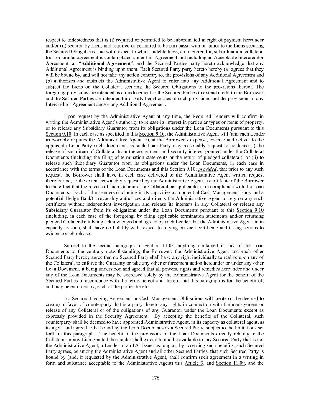 respect to Indebtedness that is (i) required or permitted to be subordinated in right of payment hereunder and/or (ii) secured by Liens and required or permitted to be pari passu with or junior to the Liens securing the Secured Obligations, and with respect to which Indebtedness, an intercreditor, subordination, collateral trust or similar agreement is contemplated under this Agreement and including an Acceptable Intercreditor Agreement, an “Additional Agreement”, and the Secured Parties party hereto acknowledge that any Additional Agreement is binding upon them. Each Secured Party party hereto hereby (a) agrees that they will be bound by, and will not take any action contrary to, the provisions of any Additional Agreement and (b) authorizes and instructs the Administrative Agent to enter into any Additional Agreement and to subject the Liens on the Collateral securing the Secured Obligations to the provisions thereof. The foregoing provisions are intended as an inducement to the Secured Parties to extend credit to the Borrower, and the Secured Parties are intended third-party beneficiaries of such provisions and the provisions of any Intercreditor Agreement and/or any Additional Agreement. Upon request by the Administrative Agent at any time, the Required Lenders will confirm in writing the Administrative Agent’s authority to release its interest in particular types or items of property, or to release any Subsidiary Guarantor from its obligations under the Loan Documents pursuant to this Section 9.10. In each case as specified in this Section 9.10, the Administrative Agent will (and each Lender irrevocably requires the Administrative Agent to), at the Borrower’s expense, execute and deliver to the applicable Loan Party such documents as such Loan Party may reasonably request to evidence (i) the release of such item of Collateral from the assignment and security interest granted under the Collateral Documents (including the filing of termination statements or the return of pledged collateral), or (ii) to release such Subsidiary Guarantor from its obligations under the Loan Documents, in each case in accordance with the terms of the Loan Documents and this Section 9.10; provided, that prior to any such request, the Borrower shall have in each case delivered to the Administrative Agent written request therefor and, to the extent reasonably requested by the Administrative Agent, a certificate of the Borrower to the effect that the release of such Guarantor or Collateral, as applicable, is in compliance with the Loan Documents. Each of the Lenders (including in its capacities as a potential Cash Management Bank and a potential Hedge Bank) irrevocably authorizes and directs the Administrative Agent to rely on any such certificate without independent investigation and release its interests in any Collateral or release any Subsidiary Guarantor from its obligations under the Loan Documents pursuant to this Section 9.10 (including, in each case of the foregoing, by filing applicable termination statements and/or returning pledged Collateral); it being acknowledged and agreed by each Lender that the Administrative Agent, in its capacity as such, shall have no liability with respect to relying on such certificate and taking actions to evidence such release. Subject to the second paragraph of Section 11.03, anything contained in any of the Loan Documents to the contrary notwithstanding, the Borrower, the Administrative Agent and each other Secured Party hereby agree that no Secured Party shall have any right individually to realize upon any of the Collateral, to enforce the Guaranty or take any other enforcement action hereunder or under any other Loan Document, it being understood and agreed that all powers, rights and remedies hereunder and under any of the Loan Documents may be exercised solely by the Administrative Agent for the benefit of the Secured Parties in accordance with the terms hereof and thereof and this paragraph is for the benefit of, and may be enforced by, each of the parties hereto. No Secured Hedging Agreement or Cash Management Obligations will create (or be deemed to create) in favor of counterparty that is a party thereto any rights in connection with the management or release of any Collateral or of the obligations of any Guarantor under the Loan Documents except as expressly provided in the Security Agreement. By accepting the benefits of the Collateral, such counterparty shall be deemed to have appointed Administrative Agent, in its capacity as collateral agent, as its agent and agreed to be bound by the Loan Documents as a Secured Party, subject to the limitations set forth in this paragraph. The benefit of the provisions of the Loan Documents directly relating to the Collateral or any Lien granted thereunder shall extend to and be available to any Secured Party that is not the Administrative Agent, a Lender or an L/C Issuer as long as, by accepting such benefits, such Secured Party agrees, as among the Administrative Agent and all other Secured Parties, that such Secured Party is bound by (and, if requested by the Administrative Agent, shall confirm such agreement in a writing in form and substance acceptable to the Administrative Agent) this Article 9, and Section 11.09, and the 178
