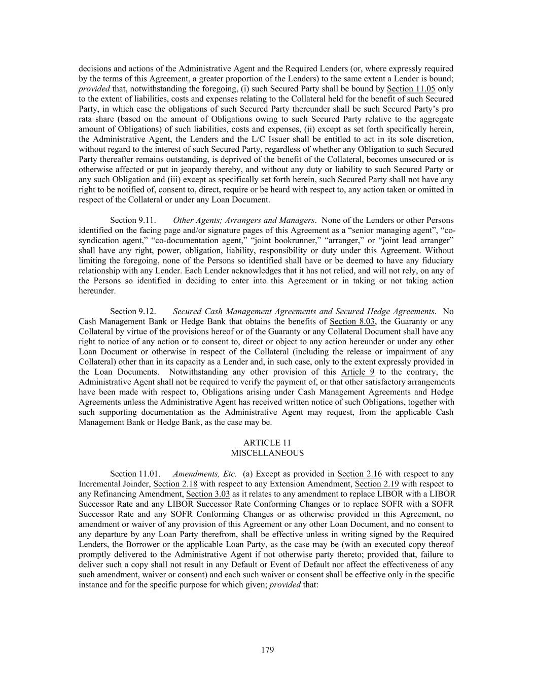 decisions and actions of the Administrative Agent and the Required Lenders (or, where expressly required by the terms of this Agreement, a greater proportion of the Lenders) to the same extent a Lender is bound; provided that, notwithstanding the foregoing, (i) such Secured Party shall be bound by Section 11.05 only to the extent of liabilities, costs and expenses relating to the Collateral held for the benefit of such Secured Party, in which case the obligations of such Secured Party thereunder shall be such Secured Party’s pro rata share (based on the amount of Obligations owing to such Secured Party relative to the aggregate amount of Obligations) of such liabilities, costs and expenses, (ii) except as set forth specifically herein, the Administrative Agent, the Lenders and the L/C Issuer shall be entitled to act in its sole discretion, without regard to the interest of such Secured Party, regardless of whether any Obligation to such Secured Party thereafter remains outstanding, is deprived of the benefit of the Collateral, becomes unsecured or is otherwise affected or put in jeopardy thereby, and without any duty or liability to such Secured Party or any such Obligation and (iii) except as specifically set forth herein, such Secured Party shall not have any right to be notified of, consent to, direct, require or be heard with respect to, any action taken or omitted in respect of the Collateral or under any Loan Document. Section 9.11. Other Agents; Arrangers and Managers. None of the Lenders or other Persons identified on the facing page and/or signature pages of this Agreement as a “senior managing agent”, “co- syndication agent,” “co-documentation agent,” “joint bookrunner,” “arranger,” or “joint lead arranger” shall have any right, power, obligation, liability, responsibility or duty under this Agreement. Without limiting the foregoing, none of the Persons so identified shall have or be deemed to have any fiduciary relationship with any Lender. Each Lender acknowledges that it has not relied, and will not rely, on any of the Persons so identified in deciding to enter into this Agreement or in taking or not taking action hereunder. Section 9.12. Secured Cash Management Agreements and Secured Hedge Agreements. No Cash Management Bank or Hedge Bank that obtains the benefits of Section 8.03, the Guaranty or any Collateral by virtue of the provisions hereof or of the Guaranty or any Collateral Document shall have any right to notice of any action or to consent to, direct or object to any action hereunder or under any other Loan Document or otherwise in respect of the Collateral (including the release or impairment of any Collateral) other than in its capacity as a Lender and, in such case, only to the extent expressly provided in the Loan Documents. Notwithstanding any other provision of this Article 9 to the contrary, the Administrative Agent shall not be required to verify the payment of, or that other satisfactory arrangements have been made with respect to, Obligations arising under Cash Management Agreements and Hedge Agreements unless the Administrative Agent has received written notice of such Obligations, together with such supporting documentation as the Administrative Agent may request, from the applicable Cash Management Bank or Hedge Bank, as the case may be. ARTICLE 11 MISCELLANEOUS Section 11.01. Amendments, Etc. (a) Except as provided in Section 2.16 with respect to any Incremental Joinder, Section 2.18 with respect to any Extension Amendment, Section 2.19 with respect to any Refinancing Amendment, Section 3.03 as it relates to any amendment to replace LIBOR with a LIBOR Successor Rate and any LIBOR Successor Rate Conforming Changes or to replace SOFR with a SOFR Successor Rate and any SOFR Conforming Changes or as otherwise provided in this Agreement, no amendment or waiver of any provision of this Agreement or any other Loan Document, and no consent to any departure by any Loan Party therefrom, shall be effective unless in writing signed by the Required Lenders, the Borrower or the applicable Loan Party, as the case may be (with an executed copy thereof promptly delivered to the Administrative Agent if not otherwise party thereto; provided that, failure to deliver such a copy shall not result in any Default or Event of Default nor affect the effectiveness of any such amendment, waiver or consent) and each such waiver or consent shall be effective only in the specific instance and for the specific purpose for which given; provided that: 179
