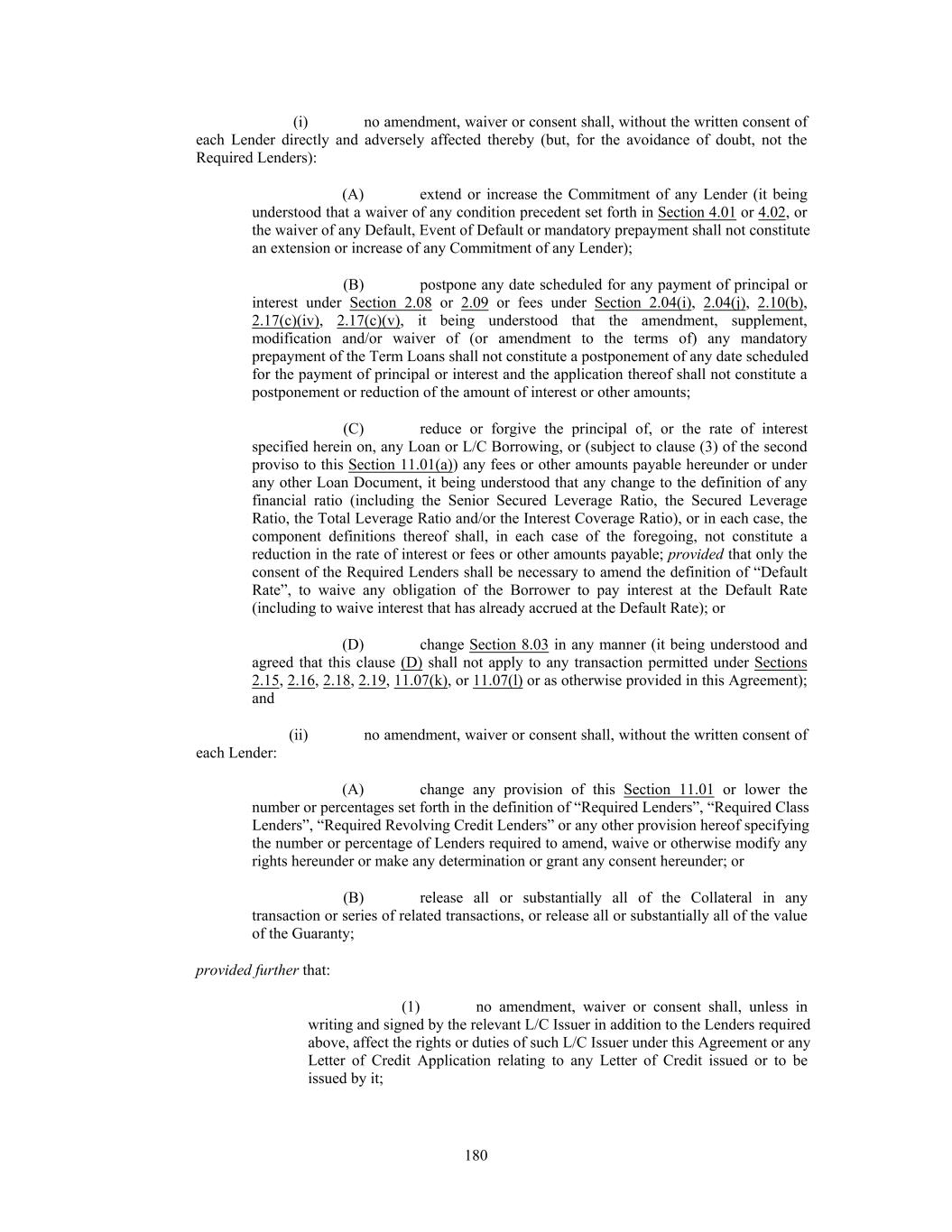 (i) no amendment, waiver or consent shall, without the written consent of each Lender directly and adversely affected thereby (but, for the avoidance of doubt, not the Required Lenders): (A) extend or increase the Commitment of any Lender (it being understood that a waiver of any condition precedent set forth in Section 4.01 or 4.02, or the waiver of any Default, Event of Default or mandatory prepayment shall not constitute an extension or increase of any Commitment of any Lender); (B) postpone any date scheduled for any payment of principal or interest under Section 2.08 or 2.09 or fees under Section 2.04(i), 2.04(j), 2.10(b), 2.17(c)(iv), 2.17(c)(v), it being understood that the amendment, supplement, modification and/or waiver of (or amendment to the terms of) any mandatory prepayment of the Term Loans shall not constitute a postponement of any date scheduled for the payment of principal or interest and the application thereof shall not constitute a postponement or reduction of the amount of interest or other amounts; (C) reduce or forgive the principal of, or the rate of interest specified herein on, any Loan or L/C Borrowing, or (subject to clause (3) of the second proviso to this Section 11.01(a)) any fees or other amounts payable hereunder or under any other Loan Document, it being understood that any change to the definition of any financial ratio (including the Senior Secured Leverage Ratio, the Secured Leverage Ratio, the Total Leverage Ratio and/or the Interest Coverage Ratio), or in each case, the component definitions thereof shall, in each case of the foregoing, not constitute a reduction in the rate of interest or fees or other amounts payable; provided that only the consent of the Required Lenders shall be necessary to amend the definition of “Default Rate”, to waive any obligation of the Borrower to pay interest at the Default Rate (including to waive interest that has already accrued at the Default Rate); or (D) change Section 8.03 in any manner (it being understood and agreed that this clause (D) shall not apply to any transaction permitted under Sections 2.15, 2.16, 2.18, 2.19, 11.07(k), or 11.07(l) or as otherwise provided in this Agreement); and (ii) no amendment, waiver or consent shall, without the written consent of each Lender: (A) change any provision of this Section 11.01 or lower the number or percentages set forth in the definition of “Required Lenders”, “Required Class Lenders”, “Required Revolving Credit Lenders” or any other provision hereof specifying the number or percentage of Lenders required to amend, waive or otherwise modify any rights hereunder or make any determination or grant any consent hereunder; or (B) release all or substantially all of the Collateral in any transaction or series of related transactions, or release all or substantially all of the value of the Guaranty; provided further that: (1) no amendment, waiver or consent shall, unless in writing and signed by the relevant L/C Issuer in addition to the Lenders required above, affect the rights or duties of such L/C Issuer under this Agreement or any Letter of Credit Application relating to any Letter of Credit issued or to be issued by it; 180