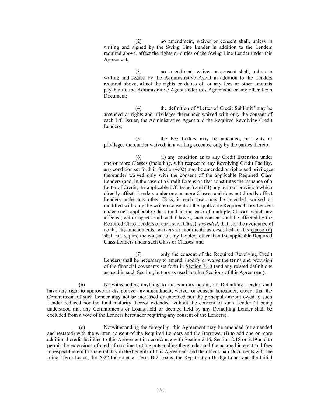 (2) no amendment, waiver or consent shall, unless in writing and signed by the Swing Line Lender in addition to the Lenders required above, affect the rights or duties of the Swing Line Lender under this Agreement; (3) no amendment, waiver or consent shall, unless in writing and signed by the Administrative Agent in addition to the Lenders required above, affect the rights or duties of, or any fees or other amounts payable to, the Administrative Agent under this Agreement or any other Loan Document; (4) the definition of “Letter of Credit Sublimit” may be amended or rights and privileges thereunder waived with only the consent of each L/C Issuer, the Administrative Agent and the Required Revolving Credit Lenders; (5) the Fee Letters may be amended, or rights or privileges thereunder waived, in a writing executed only by the parties thereto; (6) (I) any condition as to any Credit Extension under one or more Classes (including, with respect to any Revolving Credit Facility, any condition set forth in Section 4.02) may be amended or rights and privileges thereunder waived only with the consent of the applicable Required Class Lenders (and, in the case of a Credit Extension that constitutes the issuance of a Letter of Credit, the applicable L/C Issuer) and (II) any term or provision which directly affects Lenders under one or more Classes and does not directly affect Lenders under any other Class, in each case, may be amended, waived or modified with only the written consent of the applicable Required Class Lenders under such applicable Class (and in the case of multiple Classes which are affected, with respect to all such Classes, such consent shall be effected by the Required Class Lenders of each such Class); provided, that, for the avoidance of doubt, the amendments, waivers or modifications described in this clause (6) shall not require the consent of any Lenders other than the applicable Required Class Lenders under such Class or Classes; and (7) only the consent of the Required Revolving Credit Lenders shall be necessary to amend, modify or waive the terms and provision of the financial covenants set forth in Section 7.10 (and any related definitions as used in such Section, but not as used in other Sections of this Agreement). (b) Notwithstanding anything to the contrary herein, no Defaulting Lender shall have any right to approve or disapprove any amendment, waiver or consent hereunder, except that the Commitment of such Lender may not be increased or extended nor the principal amount owed to such Lender reduced nor the final maturity thereof extended without the consent of such Lender (it being understood that any Commitments or Loans held or deemed held by any Defaulting Lender shall be excluded from a vote of the Lenders hereunder requiring any consent of the Lenders). (c) Notwithstanding the foregoing, this Agreement may be amended (or amended and restated) with the written consent of the Required Lenders and the Borrower (i) to add one or more additional credit facilities to this Agreement in accordance with Section 2.16, Section 2.18 or 2.19 and to permit the extensions of credit from time to time outstanding thereunder and the accrued interest and fees in respect thereof to share ratably in the benefits of this Agreement and the other Loan Documents with the Initial Term Loans, the 2022 Incremental Term B-2 Loans, the Repatriation Bridge Loans and the Initial 181
