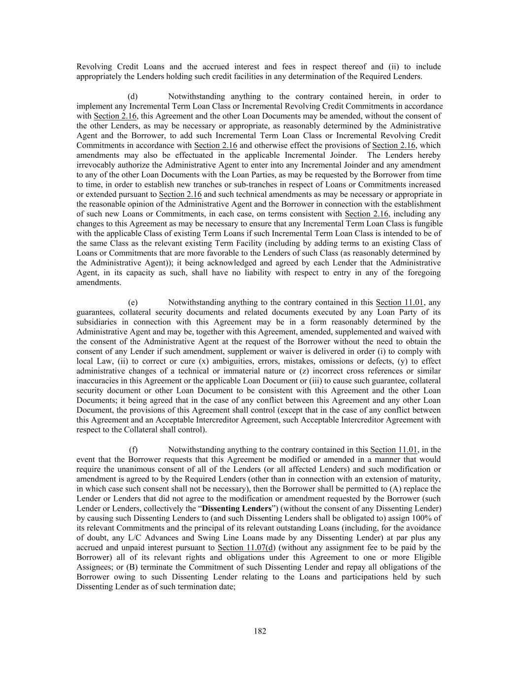 Revolving Credit Loans and the accrued interest and fees in respect thereof and (ii) to include appropriately the Lenders holding such credit facilities in any determination of the Required Lenders. (d) Notwithstanding anything to the contrary contained herein, in order to implement any Incremental Term Loan Class or Incremental Revolving Credit Commitments in accordance with Section 2.16, this Agreement and the other Loan Documents may be amended, without the consent of the other Lenders, as may be necessary or appropriate, as reasonably determined by the Administrative Agent and the Borrower, to add such Incremental Term Loan Class or Incremental Revolving Credit Commitments in accordance with Section 2.16 and otherwise effect the provisions of Section 2.16, which amendments may also be effectuated in the applicable Incremental Joinder. The Lenders hereby irrevocably authorize the Administrative Agent to enter into any Incremental Joinder and any amendment to any of the other Loan Documents with the Loan Parties, as may be requested by the Borrower from time to time, in order to establish new tranches or sub-tranches in respect of Loans or Commitments increased or extended pursuant to Section 2.16 and such technical amendments as may be necessary or appropriate in the reasonable opinion of the Administrative Agent and the Borrower in connection with the establishment of such new Loans or Commitments, in each case, on terms consistent with Section 2.16, including any changes to this Agreement as may be necessary to ensure that any Incremental Term Loan Class is fungible with the applicable Class of existing Term Loans if such Incremental Term Loan Class is intended to be of the same Class as the relevant existing Term Facility (including by adding terms to an existing Class of Loans or Commitments that are more favorable to the Lenders of such Class (as reasonably determined by the Administrative Agent)); it being acknowledged and agreed by each Lender that the Administrative Agent, in its capacity as such, shall have no liability with respect to entry in any of the foregoing amendments. (e) Notwithstanding anything to the contrary contained in this Section 11.01, any guarantees, collateral security documents and related documents executed by any Loan Party of its subsidiaries in connection with this Agreement may be in a form reasonably determined by the Administrative Agent and may be, together with this Agreement, amended, supplemented and waived with the consent of the Administrative Agent at the request of the Borrower without the need to obtain the consent of any Lender if such amendment, supplement or waiver is delivered in order (i) to comply with local Law, (ii) to correct or cure (x) ambiguities, errors, mistakes, omissions or defects, (y) to effect administrative changes of a technical or immaterial nature or (z) incorrect cross references or similar inaccuracies in this Agreement or the applicable Loan Document or (iii) to cause such guarantee, collateral security document or other Loan Document to be consistent with this Agreement and the other Loan Documents; it being agreed that in the case of any conflict between this Agreement and any other Loan Document, the provisions of this Agreement shall control (except that in the case of any conflict between this Agreement and an Acceptable Intercreditor Agreement, such Acceptable Intercreditor Agreement with respect to the Collateral shall control). (f) Notwithstanding anything to the contrary contained in this Section 11.01, in the event that the Borrower requests that this Agreement be modified or amended in a manner that would require the unanimous consent of all of the Lenders (or all affected Lenders) and such modification or amendment is agreed to by the Required Lenders (other than in connection with an extension of maturity, in which case such consent shall not be necessary), then the Borrower shall be permitted to (A) replace the Lender or Lenders that did not agree to the modification or amendment requested by the Borrower (such Lender or Lenders, collectively the “Dissenting Lenders”) (without the consent of any Dissenting Lender) by causing such Dissenting Lenders to (and such Dissenting Lenders shall be obligated to) assign 100% of its relevant Commitments and the principal of its relevant outstanding Loans (including, for the avoidance of doubt, any L/C Advances and Swing Line Loans made by any Dissenting Lender) at par plus any accrued and unpaid interest pursuant to Section 11.07(d) (without any assignment fee to be paid by the Borrower) all of its relevant rights and obligations under this Agreement to one or more Eligible Assignees; or (B) terminate the Commitment of such Dissenting Lender and repay all obligations of the Borrower owing to such Dissenting Lender relating to the Loans and participations held by such Dissenting Lender as of such termination date; 182