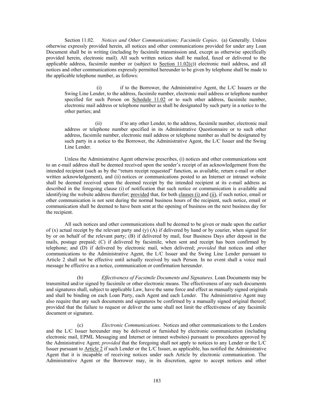 Section 11.02. Notices and Other Communications; Facsimile Copies. (a) Generally. Unless otherwise expressly provided herein, all notices and other communications provided for under any Loan Document shall be in writing (including by facsimile transmission and, except as otherwise specifically provided herein, electronic mail). All such written notices shall be mailed, faxed or delivered to the applicable address, facsimile number or (subject to Section 11.02(c)) electronic mail address, and all notices and other communications expressly permitted hereunder to be given by telephone shall be made to the applicable telephone number, as follows: (i) if to the Borrower, the Administrative Agent, the L/C Issuers or the Swing Line Lender, to the address, facsimile number, electronic mail address or telephone number specified for such Person on Schedule 11.02 or to such other address, facsimile number, electronic mail address or telephone number as shall be designated by such party in a notice to the other parties; and (ii) if to any other Lender, to the address, facsimile number, electronic mail address or telephone number specified in its Administrative Questionnaire or to such other address, facsimile number, electronic mail address or telephone number as shall be designated by such party in a notice to the Borrower, the Administrative Agent, the L/C Issuer and the Swing Line Lender. Unless the Administrative Agent otherwise prescribes, (i) notices and other communications sent to an e-mail address shall be deemed received upon the sender’s receipt of an acknowledgement from the intended recipient (such as by the “return receipt requested” function, as available, return e-mail or other written acknowledgement), and (ii) notices or communications posted to an Internet or intranet website shall be deemed received upon the deemed receipt by the intended recipient at its e-mail address as described in the foregoing clause (i) of notification that such notice or communication is available and identifying the website address therefor; provided that, for both clauses (i) and (ii), if such notice, email or other communication is not sent during the normal business hours of the recipient, such notice, email or communication shall be deemed to have been sent at the opening of business on the next business day for the recipient. All such notices and other communications shall be deemed to be given or made upon the earlier of (x) actual receipt by the relevant party and (y) (A) if delivered by hand or by courier, when signed for by or on behalf of the relevant party; (B) if delivered by mail, four Business Days after deposit in the mails, postage prepaid; (C) if delivered by facsimile, when sent and receipt has been confirmed by telephone; and (D) if delivered by electronic mail, when delivered; provided that notices and other communications to the Administrative Agent, the L/C Issuer and the Swing Line Lender pursuant to Article 2 shall not be effective until actually received by such Person. In no event shall a voice mail message be effective as a notice, communication or confirmation hereunder. (b) Effectiveness of Facsimile Documents and Signatures. Loan Documents may be transmitted and/or signed by facsimile or other electronic means. The effectiveness of any such documents and signatures shall, subject to applicable Law, have the same force and effect as manually signed originals and shall be binding on each Loan Party, each Agent and each Lender. The Administrative Agent may also require that any such documents and signatures be confirmed by a manually signed original thereof; provided that the failure to request or deliver the same shall not limit the effectiveness of any facsimile document or signature. (c) Electronic Communications. Notices and other communications to the Lenders and the L/C Issuer hereunder may be delivered or furnished by electronic communication (including electronic mail, EPML Messaging and Internet or intranet websites) pursuant to procedures approved by the Administrative Agent; provided that the foregoing shall not apply to notices to any Lender or the L/C Issuer pursuant to Article 2 if such Lender or the L/C Issuer, as applicable, has notified the Administrative Agent that it is incapable of receiving notices under such Article by electronic communication. The Administrative Agent or the Borrower may, in its discretion, agree to accept notices and other 183