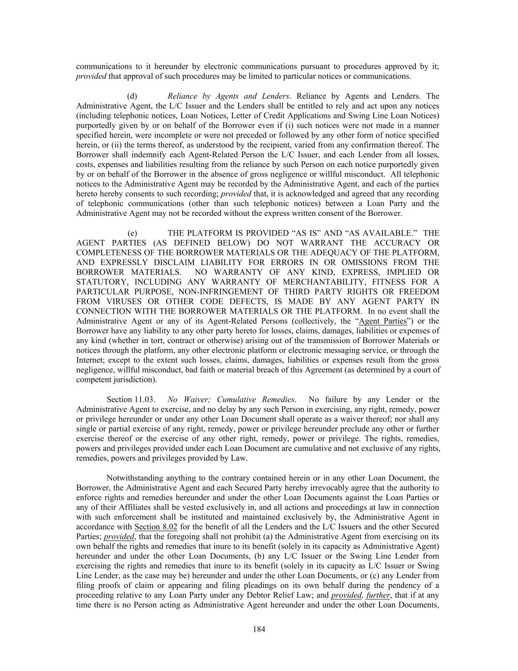 communications to it hereunder by electronic communications pursuant to procedures approved by it; provided that approval of such procedures may be limited to particular notices or communications. (d) Reliance by Agents and Lenders. Reliance by Agents and Lenders. The Administrative Agent, the L/C Issuer and the Lenders shall be entitled to rely and act upon any notices (including telephonic notices, Loan Notices, Letter of Credit Applications and Swing Line Loan Notices) purportedly given by or on behalf of the Borrower even if (i) such notices were not made in a manner specified herein, were incomplete or were not preceded or followed by any other form of notice specified herein, or (ii) the terms thereof, as understood by the recipient, varied from any confirmation thereof. The Borrower shall indemnify each Agent-Related Person the L/C Issuer, and each Lender from all losses, costs, expenses and liabilities resulting from the reliance by such Person on each notice purportedly given by or on behalf of the Borrower in the absence of gross negligence or willful misconduct. All telephonic notices to the Administrative Agent may be recorded by the Administrative Agent, and each of the parties hereto hereby consents to such recording; provided that, it is acknowledged and agreed that any recording of telephonic communications (other than such telephonic notices) between a Loan Party and the Administrative Agent may not be recorded without the express written consent of the Borrower. (e) THE PLATFORM IS PROVIDED “AS IS” AND “AS AVAILABLE.” THE AGENT PARTIES (AS DEFINED BELOW) DO NOT WARRANT THE ACCURACY OR COMPLETENESS OF THE BORROWER MATERIALS OR THE ADEQUACY OF THE PLATFORM, AND EXPRESSLY DISCLAIM LIABILITY FOR ERRORS IN OR OMISSIONS FROM THE BORROWER MATERIALS. NO WARRANTY OF ANY KIND, EXPRESS, IMPLIED OR STATUTORY, INCLUDING ANY WARRANTY OF MERCHANTABILITY, FITNESS FOR A PARTICULAR PURPOSE, NON-INFRINGEMENT OF THIRD PARTY RIGHTS OR FREEDOM FROM VIRUSES OR OTHER CODE DEFECTS, IS MADE BY ANY AGENT PARTY IN CONNECTION WITH THE BORROWER MATERIALS OR THE PLATFORM. In no event shall the Administrative Agent or any of its Agent-Related Persons (collectively, the “Agent Parties”) or the Borrower have any liability to any other party hereto for losses, claims, damages, liabilities or expenses of any kind (whether in tort, contract or otherwise) arising out of the transmission of Borrower Materials or notices through the platform, any other electronic platform or electronic messaging service, or through the Internet; except to the extent such losses, claims, damages, liabilities or expenses result from the gross negligence, willful misconduct, bad faith or material breach of this Agreement (as determined by a court of competent jurisdiction). Section 11.03. No Waiver; Cumulative Remedies. No failure by any Lender or the Administrative Agent to exercise, and no delay by any such Person in exercising, any right, remedy, power or privilege hereunder or under any other Loan Document shall operate as a waiver thereof; nor shall any single or partial exercise of any right, remedy, power or privilege hereunder preclude any other or further exercise thereof or the exercise of any other right, remedy, power or privilege. The rights, remedies, powers and privileges provided under each Loan Document are cumulative and not exclusive of any rights, remedies, powers and privileges provided by Law. Notwithstanding anything to the contrary contained herein or in any other Loan Document, the Borrower, the Administrative Agent and each Secured Party hereby irrevocably agree that the authority to enforce rights and remedies hereunder and under the other Loan Documents against the Loan Parties or any of their Affiliates shall be vested exclusively in, and all actions and proceedings at law in connection with such enforcement shall be instituted and maintained exclusively by, the Administrative Agent in accordance with Section 8.02 for the benefit of all the Lenders and the L/C Issuers and the other Secured Parties; provided, that the foregoing shall not prohibit (a) the Administrative Agent from exercising on its own behalf the rights and remedies that inure to its benefit (solely in its capacity as Administrative Agent) hereunder and under the other Loan Documents, (b) any L/C Issuer or the Swing Line Lender from exercising the rights and remedies that inure to its benefit (solely in its capacity as L/C Issuer or Swing Line Lender, as the case may be) hereunder and under the other Loan Documents, or (c) any Lender from filing proofs of claim or appearing and filing pleadings on its own behalf during the pendency of a proceeding relative to any Loan Party under any Debtor Relief Law; and provided, further, that if at any time there is no Person acting as Administrative Agent hereunder and under the other Loan Documents, 184