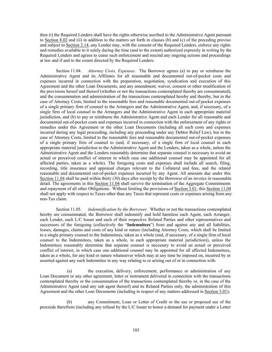 then (i) the Required Lenders shall have the rights otherwise ascribed to the Administrative Agent pursuant to Section 8.02 and (ii) in addition to the matters set forth in clauses (b) and (c) of the preceding proviso and subject to Section 2.14, any Lender may, with the consent of the Required Lenders, enforce any rights and remedies available to it solely during the time (and to the extent) authorized expressly in writing by the Required Lenders and agrees to cease such enforcement and rescind any ongoing actions and proceedings at law and if and to the extent directed by the Required Lenders. Section 11.04. Attorney Costs, Expenses. The Borrower agrees (a) to pay or reimburse the Administrative Agent and its Affiliates for all reasonable and documented out-of-pocket costs and expenses incurred in connection with the preparation, negotiation, syndication and execution of this Agreement and the other Loan Documents, and any amendment, waiver, consent or other modification of the provisions hereof and thereof (whether or not the transactions contemplated thereby are consummated), and the consummation and administration of the transactions contemplated hereby and thereby, but in the case of Attorney Costs, limited to the reasonable fees and reasonable documented out-of-pocket expenses of a single primary firm of counsel to the Arrangers and the Administrative Agent, and, if necessary, of a single firm of local counsel to the Arrangers and the Administrative Agent in each appropriate material jurisdiction, and (b) to pay or reimburse the Administrative Agent and each Lender for all reasonable and documented out-of-pocket costs and expenses incurred in connection with the enforcement of any rights or remedies under this Agreement or the other Loan Documents (including all such costs and expenses incurred during any legal proceeding, including any proceeding under any Debtor Relief Law), but in the case of Attorney Costs, limited to the reasonable fees and reasonable documented out-of-pocket expenses of a single primary firm of counsel to (and, if necessary, of a single firm of local counsel in each appropriate material jurisdiction to the Administrative Agent and the Lenders, taken as a whole, unless the Administrative Agent and the Lenders reasonably determine that separate counsel is necessary to avoid an actual or perceived conflict of interest in which case one additional counsel may be appointed for all affected parties, taken as a whole). The foregoing costs and expenses shall include all search, filing, recording, title insurance and appraisal charges relevant to the Collateral and fees, and the related reasonable and documented out-of-pocket expenses incurred by any Agent. All amounts due under this Section 11.04 shall be paid within thirty (30) days after receipt by the Borrower of an invoice in reasonable detail. The agreements in this Section 11.04 shall survive the termination of the Aggregate Commitments and repayment of all other Obligations. Without limiting the provisions of Section 3.01, this Section 11.04 shall not apply with respect to Taxes other than any Taxes that represent costs or expenses arising from any non-Tax claim. Section 11.05. Indemnification by the Borrower. Whether or not the transactions contemplated hereby are consummated, the Borrower shall indemnify and hold harmless each Agent, each Arranger, each Lender, each L/C Issuer and each of their respective Related Parties and other representatives and successors of the foregoing (collectively the “Indemnitees”) from and against any and all liabilities, losses, damages, claims and costs of any kind or nature (including Attorney Costs, which shall be limited to a single primary counsel to the Indemnitees, taken as a whole (and, if necessary, of a single firm of local counsel to the Indemnitees, taken as a whole, in each appropriate material jurisdiction)), unless the Indemnitees reasonably determine that separate counsel is necessary to avoid an actual or perceived conflict of interest, in which case one additional counsel may be appointed for all affected Indemnitees, taken as a whole, for any kind or nature whatsoever which may at any time be imposed on, incurred by or asserted against any such Indemnitee in any way relating to or arising out of or in connection with: (a) the execution, delivery, enforcement, performance or administration of any Loan Document or any other agreement, letter or instrument delivered in connection with the transactions contemplated thereby or the consummation of the transactions contemplated thereby or, in the case of the Administrative Agent (and any sub agent thereof) and its Related Parties only, the administration of this Agreement and the other Loan Documents (including in respect of any matters addressed in Section 3.01); (b) any Commitment, Loan or Letter of Credit or the use or proposed use of the proceeds therefrom (including any refusal by the L/C Issuer to honor a demand for payment under a Letter 185