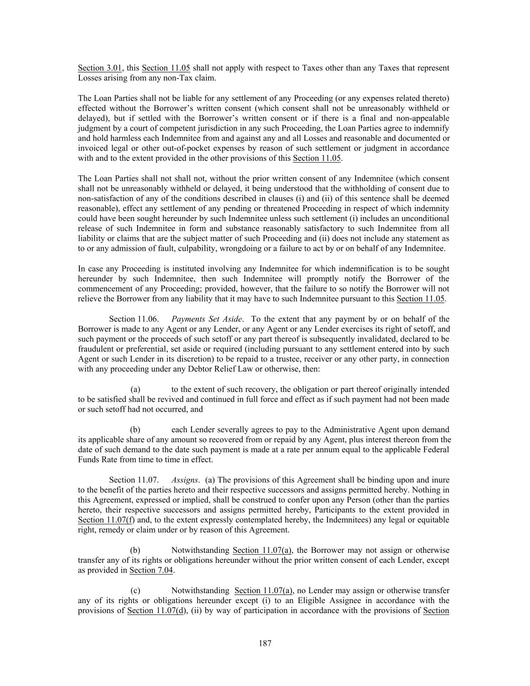 Section 3.01, this Section 11.05 shall not apply with respect to Taxes other than any Taxes that represent Losses arising from any non-Tax claim. The Loan Parties shall not be liable for any settlement of any Proceeding (or any expenses related thereto) effected without the Borrower’s written consent (which consent shall not be unreasonably withheld or delayed), but if settled with the Borrower’s written consent or if there is a final and non-appealable judgment by a court of competent jurisdiction in any such Proceeding, the Loan Parties agree to indemnify and hold harmless each Indemnitee from and against any and all Losses and reasonable and documented or invoiced legal or other out-of-pocket expenses by reason of such settlement or judgment in accordance with and to the extent provided in the other provisions of this Section 11.05. The Loan Parties shall not shall not, without the prior written consent of any Indemnitee (which consent shall not be unreasonably withheld or delayed, it being understood that the withholding of consent due to non-satisfaction of any of the conditions described in clauses (i) and (ii) of this sentence shall be deemed reasonable), effect any settlement of any pending or threatened Proceeding in respect of which indemnity could have been sought hereunder by such Indemnitee unless such settlement (i) includes an unconditional release of such Indemnitee in form and substance reasonably satisfactory to such Indemnitee from all liability or claims that are the subject matter of such Proceeding and (ii) does not include any statement as to or any admission of fault, culpability, wrongdoing or a failure to act by or on behalf of any Indemnitee. In case any Proceeding is instituted involving any Indemnitee for which indemnification is to be sought hereunder by such Indemnitee, then such Indemnitee will promptly notify the Borrower of the commencement of any Proceeding; provided, however, that the failure to so notify the Borrower will not relieve the Borrower from any liability that it may have to such Indemnitee pursuant to this Section 11.05. Section 11.06. Payments Set Aside. To the extent that any payment by or on behalf of the Borrower is made to any Agent or any Lender, or any Agent or any Lender exercises its right of setoff, and such payment or the proceeds of such setoff or any part thereof is subsequently invalidated, declared to be fraudulent or preferential, set aside or required (including pursuant to any settlement entered into by such Agent or such Lender in its discretion) to be repaid to a trustee, receiver or any other party, in connection with any proceeding under any Debtor Relief Law or otherwise, then: (a) to the extent of such recovery, the obligation or part thereof originally intended to be satisfied shall be revived and continued in full force and effect as if such payment had not been made or such setoff had not occurred, and (b) each Lender severally agrees to pay to the Administrative Agent upon demand its applicable share of any amount so recovered from or repaid by any Agent, plus interest thereon from the date of such demand to the date such payment is made at a rate per annum equal to the applicable Federal Funds Rate from time to time in effect. Section 11.07. Assigns. (a) The provisions of this Agreement shall be binding upon and inure to the benefit of the parties hereto and their respective successors and assigns permitted hereby. Nothing in this Agreement, expressed or implied, shall be construed to confer upon any Person (other than the parties hereto, their respective successors and assigns permitted hereby, Participants to the extent provided in Section 11.07(f) and, to the extent expressly contemplated hereby, the Indemnitees) any legal or equitable right, remedy or claim under or by reason of this Agreement. (b) Notwithstanding Section 11.07(a), the Borrower may not assign or otherwise transfer any of its rights or obligations hereunder without the prior written consent of each Lender, except as provided in Section 7.04. (c) Notwithstanding Section 11.07(a), no Lender may assign or otherwise transfer any of its rights or obligations hereunder except (i) to an Eligible Assignee in accordance with the provisions of Section 11.07(d), (ii) by way of participation in accordance with the provisions of Section 187