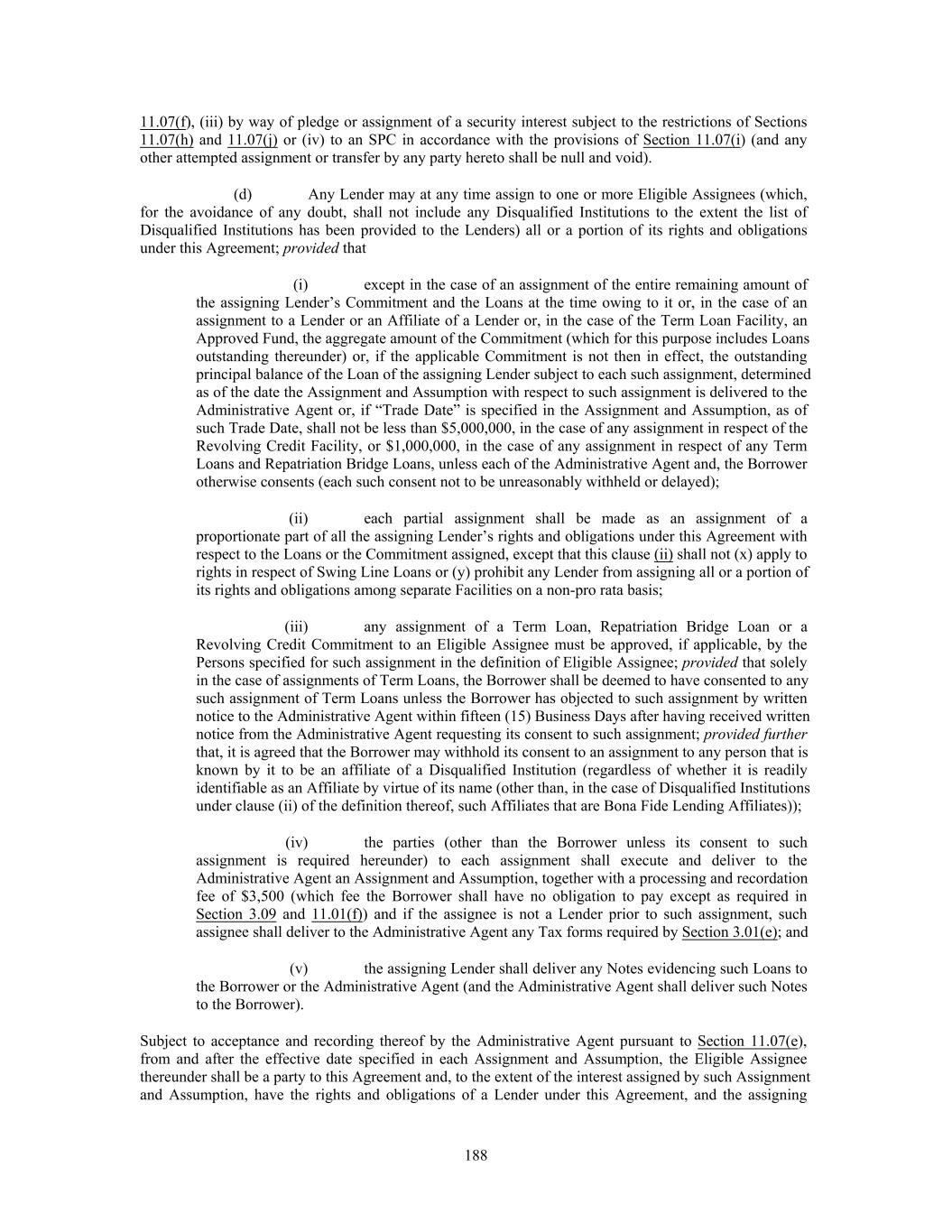 11.07(f), (iii) by way of pledge or assignment of a security interest subject to the restrictions of Sections 11.07(h) and 11.07(j) or (iv) to an SPC in accordance with the provisions of Section 11.07(i) (and any other attempted assignment or transfer by any party hereto shall be null and void). (d) Any Lender may at any time assign to one or more Eligible Assignees (which, for the avoidance of any doubt, shall not include any Disqualified Institutions to the extent the list of Disqualified Institutions has been provided to the Lenders) all or a portion of its rights and obligations under this Agreement; provided that (i) except in the case of an assignment of the entire remaining amount of the assigning Lender’s Commitment and the Loans at the time owing to it or, in the case of an assignment to a Lender or an Affiliate of a Lender or, in the case of the Term Loan Facility, an Approved Fund, the aggregate amount of the Commitment (which for this purpose includes Loans outstanding thereunder) or, if the applicable Commitment is not then in effect, the outstanding principal balance of the Loan of the assigning Lender subject to each such assignment, determined as of the date the Assignment and Assumption with respect to such assignment is delivered to the Administrative Agent or, if “Trade Date” is specified in the Assignment and Assumption, as of such Trade Date, shall not be less than $5,000,000, in the case of any assignment in respect of the Revolving Credit Facility, or $1,000,000, in the case of any assignment in respect of any Term Loans and Repatriation Bridge Loans, unless each of the Administrative Agent and, the Borrower otherwise consents (each such consent not to be unreasonably withheld or delayed); (ii) each partial assignment shall be made as an assignment of a proportionate part of all the assigning Lender’s rights and obligations under this Agreement with respect to the Loans or the Commitment assigned, except that this clause (ii) shall not (x) apply to rights in respect of Swing Line Loans or (y) prohibit any Lender from assigning all or a portion of its rights and obligations among separate Facilities on a non-pro rata basis; (iii) any assignment of a Term Loan, Repatriation Bridge Loan or a Revolving Credit Commitment to an Eligible Assignee must be approved, if applicable, by the Persons specified for such assignment in the definition of Eligible Assignee; provided that solely in the case of assignments of Term Loans, the Borrower shall be deemed to have consented to any such assignment of Term Loans unless the Borrower has objected to such assignment by written notice to the Administrative Agent within fifteen (15) Business Days after having received written notice from the Administrative Agent requesting its consent to such assignment; provided further that, it is agreed that the Borrower may withhold its consent to an assignment to any person that is known by it to be an affiliate of a Disqualified Institution (regardless of whether it is readily identifiable as an Affiliate by virtue of its name (other than, in the case of Disqualified Institutions under clause (ii) of the definition thereof, such Affiliates that are Bona Fide Lending Affiliates)); (iv) the parties (other than the Borrower unless its consent to such assignment is required hereunder) to each assignment shall execute and deliver to the Administrative Agent an Assignment and Assumption, together with a processing and recordation fee of $3,500 (which fee the Borrower shall have no obligation to pay except as required in Section 3.09 and 11.01(f)) and if the assignee is not a Lender prior to such assignment, such assignee shall deliver to the Administrative Agent any Tax forms required by Section 3.01(e); and (v) the assigning Lender shall deliver any Notes evidencing such Loans to the Borrower or the Administrative Agent (and the Administrative Agent shall deliver such Notes to the Borrower). Subject to acceptance and recording thereof by the Administrative Agent pursuant to Section 11.07(e), from and after the effective date specified in each Assignment and Assumption, the Eligible Assignee thereunder shall be a party to this Agreement and, to the extent of the interest assigned by such Assignment and Assumption, have the rights and obligations of a Lender under this Agreement, and the assigning 188