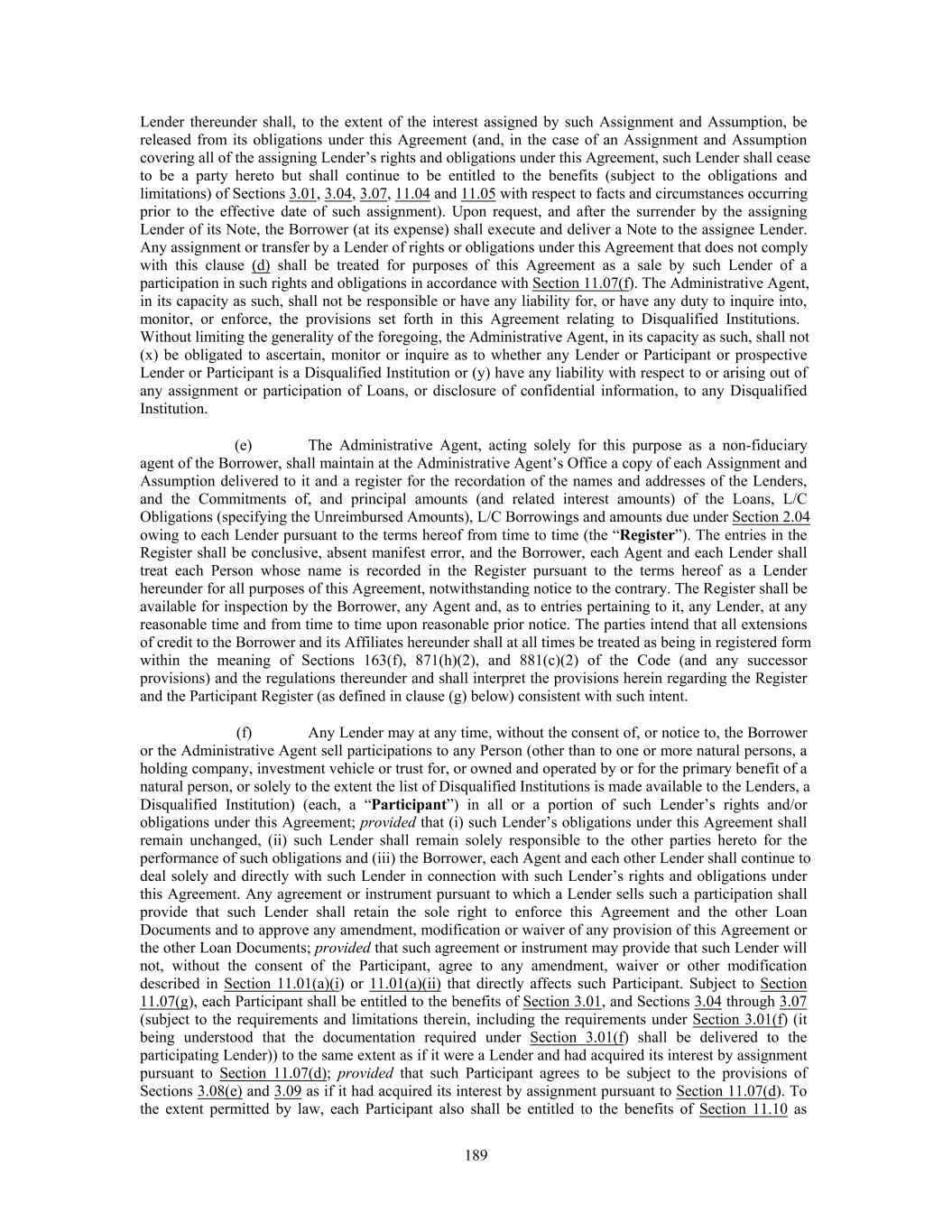 Lender thereunder shall, to the extent of the interest assigned by such Assignment and Assumption, be released from its obligations under this Agreement (and, in the case of an Assignment and Assumption covering all of the assigning Lender’s rights and obligations under this Agreement, such Lender shall cease to be a party hereto but shall continue to be entitled to the benefits (subject to the obligations and limitations) of Sections 3.01, 3.04, 3.07, 11.04 and 11.05 with respect to facts and circumstances occurring prior to the effective date of such assignment). Upon request, and after the surrender by the assigning Lender of its Note, the Borrower (at its expense) shall execute and deliver a Note to the assignee Lender. Any assignment or transfer by a Lender of rights or obligations under this Agreement that does not comply with this clause (d) shall be treated for purposes of this Agreement as a sale by such Lender of a participation in such rights and obligations in accordance with Section 11.07(f). The Administrative Agent, in its capacity as such, shall not be responsible or have any liability for, or have any duty to inquire into, monitor, or enforce, the provisions set forth in this Agreement relating to Disqualified Institutions. Without limiting the generality of the foregoing, the Administrative Agent, in its capacity as such, shall not (x) be obligated to ascertain, monitor or inquire as to whether any Lender or Participant or prospective Lender or Participant is a Disqualified Institution or (y) have any liability with respect to or arising out of any assignment or participation of Loans, or disclosure of confidential information, to any Disqualified Institution. (e) The Administrative Agent, acting solely for this purpose as a non-fiduciary agent of the Borrower, shall maintain at the Administrative Agent’s Office a copy of each Assignment and Assumption delivered to it and a register for the recordation of the names and addresses of the Lenders, and the Commitments of, and principal amounts (and related interest amounts) of the Loans, L/C Obligations (specifying the Unreimbursed Amounts), L/C Borrowings and amounts due under Section 2.04 owing to each Lender pursuant to the terms hereof from time to time (the “Register”). The entries in the Register shall be conclusive, absent manifest error, and the Borrower, each Agent and each Lender shall treat each Person whose name is recorded in the Register pursuant to the terms hereof as a Lender hereunder for all purposes of this Agreement, notwithstanding notice to the contrary. The Register shall be available for inspection by the Borrower, any Agent and, as to entries pertaining to it, any Lender, at any reasonable time and from time to time upon reasonable prior notice. The parties intend that all extensions of credit to the Borrower and its Affiliates hereunder shall at all times be treated as being in registered form within the meaning of Sections 163(f), 871(h)(2), and 881(c)(2) of the Code (and any successor provisions) and the regulations thereunder and shall interpret the provisions herein regarding the Register and the Participant Register (as defined in clause (g) below) consistent with such intent. (f) Any Lender may at any time, without the consent of, or notice to, the Borrower or the Administrative Agent sell participations to any Person (other than to one or more natural persons, a holding company, investment vehicle or trust for, or owned and operated by or for the primary benefit of a natural person, or solely to the extent the list of Disqualified Institutions is made available to the Lenders, a Disqualified Institution) (each, a “Participant”) in all or a portion of such Lender’s rights and/or obligations under this Agreement; provided that (i) such Lender’s obligations under this Agreement shall remain unchanged, (ii) such Lender shall remain solely responsible to the other parties hereto for the performance of such obligations and (iii) the Borrower, each Agent and each other Lender shall continue to deal solely and directly with such Lender in connection with such Lender’s rights and obligations under this Agreement. Any agreement or instrument pursuant to which a Lender sells such a participation shall provide that such Lender shall retain the sole right to enforce this Agreement and the other Loan Documents and to approve any amendment, modification or waiver of any provision of this Agreement or the other Loan Documents; provided that such agreement or instrument may provide that such Lender will not, without the consent of the Participant, agree to any amendment, waiver or other modification described in Section 11.01(a)(i) or 11.01(a)(ii) that directly affects such Participant. Subject to Section 11.07(g), each Participant shall be entitled to the benefits of Section 3.01, and Sections 3.04 through 3.07 (subject to the requirements and limitations therein, including the requirements under Section 3.01(f) (it being understood that the documentation required under Section 3.01(f) shall be delivered to the participating Lender)) to the same extent as if it were a Lender and had acquired its interest by assignment pursuant to Section 11.07(d); provided that such Participant agrees to be subject to the provisions of Sections 3.08(e) and 3.09 as if it had acquired its interest by assignment pursuant to Section 11.07(d). To the extent permitted by law, each Participant also shall be entitled to the benefits of Section 11.10 as 189