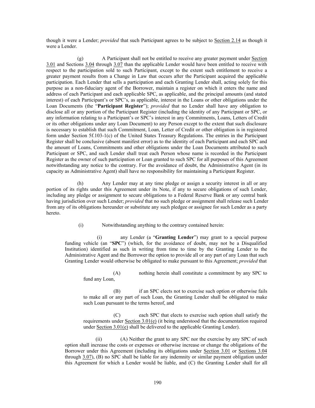 though it were a Lender; provided that such Participant agrees to be subject to Section 2.14 as though it were a Lender. (g) A Participant shall not be entitled to receive any greater payment under Section 3.01 and Sections 3.04 through 3.07 than the applicable Lender would have been entitled to receive with respect to the participation sold to such Participant, except to the extent such entitlement to receive a greater payment results from a Change in Law that occurs after the Participant acquired the applicable participation. Each Lender that sells a participation and each Granting Lender shall, acting solely for this purpose as a non-fiduciary agent of the Borrower, maintain a register on which it enters the name and address of each Participant and each applicable SPC, as applicable, and the principal amounts (and stated interest) of each Participant’s or SPC’s, as applicable, interest in the Loans or other obligations under the Loan Documents (the “Participant Register”); provided that no Lender shall have any obligation to disclose all or any portion of the Participant Register (including the identity of any Participant or SPC, or any information relating to a Participant’s or SPC’s interest in any Commitments, Loans, Letters of Credit or its other obligations under any Loan Document) to any Person except to the extent that such disclosure is necessary to establish that such Commitment, Loan, Letter of Credit or other obligation is in registered form under Section 5f.103-1(c) of the United States Treasury Regulations. The entries in the Participant Register shall be conclusive (absent manifest error) as to the identity of each Participant and each SPC and the amount of Loans, Commitments and other obligations under the Loan Documents attributed to such Participant or SPC, and such Lender shall treat each Person whose name is recorded in the Participant Register as the owner of such participation or Loan granted to such SPC for all purposes of this Agreement notwithstanding any notice to the contrary. For the avoidance of doubt, the Administrative Agent (in its capacity as Administrative Agent) shall have no responsibility for maintaining a Participant Register. (h) Any Lender may at any time pledge or assign a security interest in all or any portion of its rights under this Agreement under its Note, if any to secure obligations of such Lender, including any pledge or assignment to secure obligations to a Federal Reserve Bank or any central bank having jurisdiction over such Lender; provided that no such pledge or assignment shall release such Lender from any of its obligations hereunder or substitute any such pledgee or assignee for such Lender as a party hereto. (i) Notwithstanding anything to the contrary contained herein: (i) any Lender (a “Granting Lender”) may grant to a special purpose funding vehicle (an “SPC”) (which, for the avoidance of doubt, may not be a Disqualified Institution) identified as such in writing from time to time by the Granting Lender to the Administrative Agent and the Borrower the option to provide all or any part of any Loan that such Granting Lender would otherwise be obligated to make pursuant to this Agreement; provided that (A) nothing herein shall constitute a commitment by any SPC to fund any Loan, (B) if an SPC elects not to exercise such option or otherwise fails to make all or any part of such Loan, the Granting Lender shall be obligated to make such Loan pursuant to the terms hereof, and (C) each SPC that elects to exercise such option shall satisfy the requirements under Section 3.01(e) (it being understood that the documentation required under Section 3.01(e) shall be delivered to the applicable Granting Lender). (ii) (A) Neither the grant to any SPC nor the exercise by any SPC of such option shall increase the costs or expenses or otherwise increase or change the obligations of the Borrower under this Agreement (including its obligations under Section 3.01 or Sections 3.04 through 3.07), (B) no SPC shall be liable for any indemnity or similar payment obligation under this Agreement for which a Lender would be liable, and (C) the Granting Lender shall for all 190