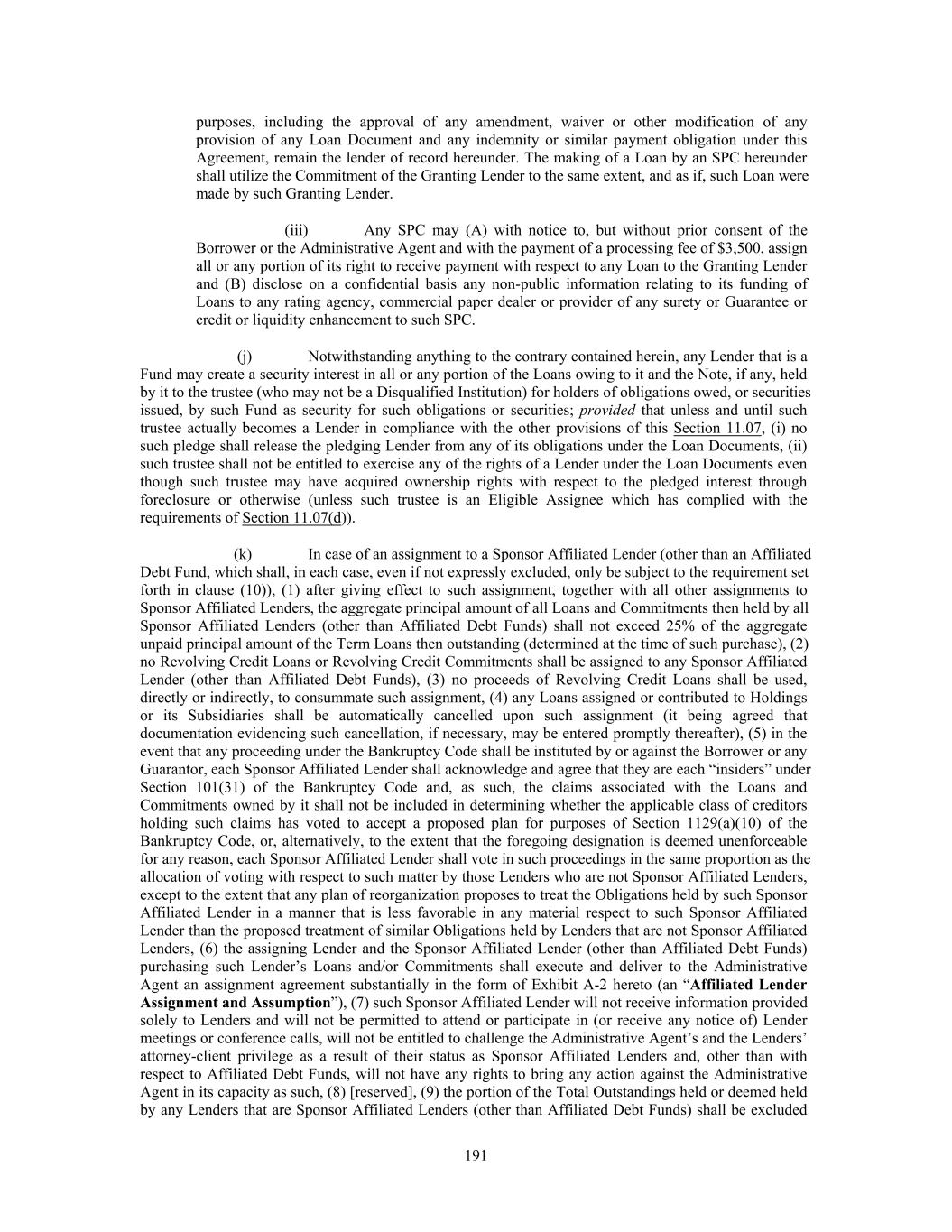 purposes, including the approval of any amendment, waiver or other modification of any provision of any Loan Document and any indemnity or similar payment obligation under this Agreement, remain the lender of record hereunder. The making of a Loan by an SPC hereunder shall utilize the Commitment of the Granting Lender to the same extent, and as if, such Loan were made by such Granting Lender. (iii) Any SPC may (A) with notice to, but without prior consent of the Borrower or the Administrative Agent and with the payment of a processing fee of $3,500, assign all or any portion of its right to receive payment with respect to any Loan to the Granting Lender and (B) disclose on a confidential basis any non-public information relating to its funding of Loans to any rating agency, commercial paper dealer or provider of any surety or Guarantee or credit or liquidity enhancement to such SPC. (j) Notwithstanding anything to the contrary contained herein, any Lender that is a Fund may create a security interest in all or any portion of the Loans owing to it and the Note, if any, held by it to the trustee (who may not be a Disqualified Institution) for holders of obligations owed, or securities issued, by such Fund as security for such obligations or securities; provided that unless and until such trustee actually becomes a Lender in compliance with the other provisions of this Section 11.07, (i) no such pledge shall release the pledging Lender from any of its obligations under the Loan Documents, (ii) such trustee shall not be entitled to exercise any of the rights of a Lender under the Loan Documents even though such trustee may have acquired ownership rights with respect to the pledged interest through foreclosure or otherwise (unless such trustee is an Eligible Assignee which has complied with the requirements of Section 11.07(d)). (k) In case of an assignment to a Sponsor Affiliated Lender (other than an Affiliated Debt Fund, which shall, in each case, even if not expressly excluded, only be subject to the requirement set forth in clause (10)), (1) after giving effect to such assignment, together with all other assignments to Sponsor Affiliated Lenders, the aggregate principal amount of all Loans and Commitments then held by all Sponsor Affiliated Lenders (other than Affiliated Debt Funds) shall not exceed 25% of the aggregate unpaid principal amount of the Term Loans then outstanding (determined at the time of such purchase), (2) no Revolving Credit Loans or Revolving Credit Commitments shall be assigned to any Sponsor Affiliated Lender (other than Affiliated Debt Funds), (3) no proceeds of Revolving Credit Loans shall be used, directly or indirectly, to consummate such assignment, (4) any Loans assigned or contributed to Holdings or its Subsidiaries shall be automatically cancelled upon such assignment (it being agreed that documentation evidencing such cancellation, if necessary, may be entered promptly thereafter), (5) in the event that any proceeding under the Bankruptcy Code shall be instituted by or against the Borrower or any Guarantor, each Sponsor Affiliated Lender shall acknowledge and agree that they are each “insiders” under Section 101(31) of the Bankruptcy Code and, as such, the claims associated with the Loans and Commitments owned by it shall not be included in determining whether the applicable class of creditors holding such claims has voted to accept a proposed plan for purposes of Section 1129(a)(10) of the Bankruptcy Code, or, alternatively, to the extent that the foregoing designation is deemed unenforceable for any reason, each Sponsor Affiliated Lender shall vote in such proceedings in the same proportion as the allocation of voting with respect to such matter by those Lenders who are not Sponsor Affiliated Lenders, except to the extent that any plan of reorganization proposes to treat the Obligations held by such Sponsor Affiliated Lender in a manner that is less favorable in any material respect to such Sponsor Affiliated Lender than the proposed treatment of similar Obligations held by Lenders that are not Sponsor Affiliated Lenders, (6) the assigning Lender and the Sponsor Affiliated Lender (other than Affiliated Debt Funds) purchasing such Lender’s Loans and/or Commitments shall execute and deliver to the Administrative Agent an assignment agreement substantially in the form of Exhibit A-2 hereto (an “Affiliated Lender Assignment and Assumption”), (7) such Sponsor Affiliated Lender will not receive information provided solely to Lenders and will not be permitted to attend or participate in (or receive any notice of) Lender meetings or conference calls, will not be entitled to challenge the Administrative Agent’s and the Lenders’ attorney-client privilege as a result of their status as Sponsor Affiliated Lenders and, other than with respect to Affiliated Debt Funds, will not have any rights to bring any action against the Administrative Agent in its capacity as such, (8) [reserved], (9) the portion of the Total Outstandings held or deemed held by any Lenders that are Sponsor Affiliated Lenders (other than Affiliated Debt Funds) shall be excluded 191