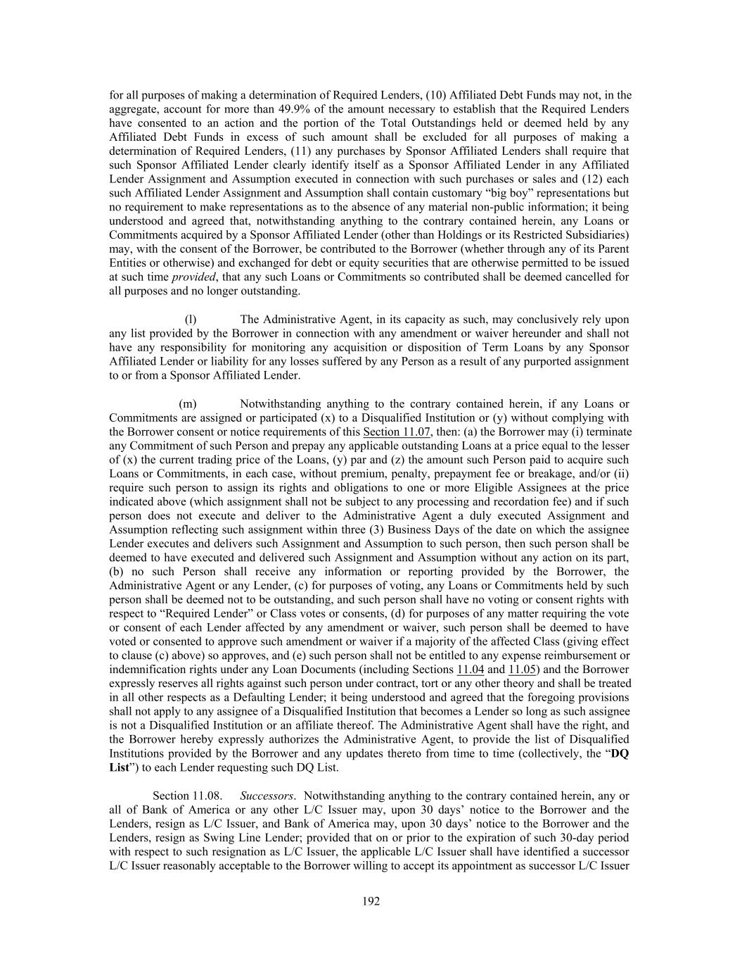 for all purposes of making a determination of Required Lenders, (10) Affiliated Debt Funds may not, in the aggregate, account for more than 49.9% of the amount necessary to establish that the Required Lenders have consented to an action and the portion of the Total Outstandings held or deemed held by any Affiliated Debt Funds in excess of such amount shall be excluded for all purposes of making a determination of Required Lenders, (11) any purchases by Sponsor Affiliated Lenders shall require that such Sponsor Affiliated Lender clearly identify itself as a Sponsor Affiliated Lender in any Affiliated Lender Assignment and Assumption executed in connection with such purchases or sales and (12) each such Affiliated Lender Assignment and Assumption shall contain customary “big boy” representations but no requirement to make representations as to the absence of any material non-public information; it being understood and agreed that, notwithstanding anything to the contrary contained herein, any Loans or Commitments acquired by a Sponsor Affiliated Lender (other than Holdings or its Restricted Subsidiaries) may, with the consent of the Borrower, be contributed to the Borrower (whether through any of its Parent Entities or otherwise) and exchanged for debt or equity securities that are otherwise permitted to be issued at such time provided, that any such Loans or Commitments so contributed shall be deemed cancelled for all purposes and no longer outstanding. (l) The Administrative Agent, in its capacity as such, may conclusively rely upon any list provided by the Borrower in connection with any amendment or waiver hereunder and shall not have any responsibility for monitoring any acquisition or disposition of Term Loans by any Sponsor Affiliated Lender or liability for any losses suffered by any Person as a result of any purported assignment to or from a Sponsor Affiliated Lender. (m) Notwithstanding anything to the contrary contained herein, if any Loans or Commitments are assigned or participated (x) to a Disqualified Institution or (y) without complying with the Borrower consent or notice requirements of this Section 11.07, then: (a) the Borrower may (i) terminate any Commitment of such Person and prepay any applicable outstanding Loans at a price equal to the lesser of (x) the current trading price of the Loans, (y) par and (z) the amount such Person paid to acquire such Loans or Commitments, in each case, without premium, penalty, prepayment fee or breakage, and/or (ii) require such person to assign its rights and obligations to one or more Eligible Assignees at the price indicated above (which assignment shall not be subject to any processing and recordation fee) and if such person does not execute and deliver to the Administrative Agent a duly executed Assignment and Assumption reflecting such assignment within three (3) Business Days of the date on which the assignee Lender executes and delivers such Assignment and Assumption to such person, then such person shall be deemed to have executed and delivered such Assignment and Assumption without any action on its part, (b) no such Person shall receive any information or reporting provided by the Borrower, the Administrative Agent or any Lender, (c) for purposes of voting, any Loans or Commitments held by such person shall be deemed not to be outstanding, and such person shall have no voting or consent rights with respect to “Required Lender” or Class votes or consents, (d) for purposes of any matter requiring the vote or consent of each Lender affected by any amendment or waiver, such person shall be deemed to have voted or consented to approve such amendment or waiver if a majority of the affected Class (giving effect to clause (c) above) so approves, and (e) such person shall not be entitled to any expense reimbursement or indemnification rights under any Loan Documents (including Sections 11.04 and 11.05) and the Borrower expressly reserves all rights against such person under contract, tort or any other theory and shall be treated in all other respects as a Defaulting Lender; it being understood and agreed that the foregoing provisions shall not apply to any assignee of a Disqualified Institution that becomes a Lender so long as such assignee is not a Disqualified Institution or an affiliate thereof. The Administrative Agent shall have the right, and the Borrower hereby expressly authorizes the Administrative Agent, to provide the list of Disqualified Institutions provided by the Borrower and any updates thereto from time to time (collectively, the “DQ List”) to each Lender requesting such DQ List. Section 11.08. Successors. Notwithstanding anything to the contrary contained herein, any or all of Bank of America or any other L/C Issuer may, upon 30 days’ notice to the Borrower and the Lenders, resign as L/C Issuer, and Bank of America may, upon 30 days’ notice to the Borrower and the Lenders, resign as Swing Line Lender; provided that on or prior to the expiration of such 30-day period with respect to such resignation as L/C Issuer, the applicable L/C Issuer shall have identified a successor L/C Issuer reasonably acceptable to the Borrower willing to accept its appointment as successor L/C Issuer 192