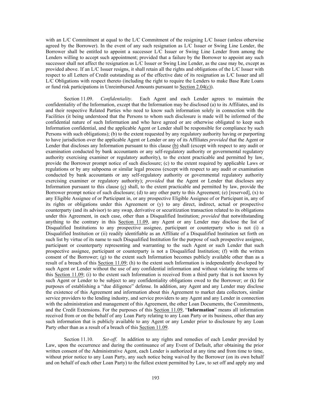 with an L/C Commitment at equal to the L/C Commitment of the resigning L/C Issuer (unless otherwise agreed by the Borrower). In the event of any such resignation as L/C Issuer or Swing Line Lender, the Borrower shall be entitled to appoint a successor L/C Issuer or Swing Line Lender from among the Lenders willing to accept such appointment; provided that a failure by the Borrower to appoint any such successor shall not affect the resignation as L/C Issuer or Swing Line Lender, as the case may be, except as provided above. If an L/C Issuer resigns, it shall retain all the rights and obligations of the L/C Issuer with respect to all Letters of Credit outstanding as of the effective date of its resignation as L/C Issuer and all L/C Obligations with respect thereto (including the right to require the Lenders to make Base Rate Loans or fund risk participations in Unreimbursed Amounts pursuant to Section 2.04(c)). Section 11.09. Confidentiality. Each Agent and each Lender agrees to maintain the confidentiality of the Information, except that the Information may be disclosed (a) to its Affiliates, and its and their respective Related Parties who need to know such information solely in connection with the Facilities (it being understood that the Persons to whom such disclosure is made will be informed of the confidential nature of such Information and who have agreed or are otherwise obligated to keep such Information confidential, and the applicable Agent or Lender shall be responsible for compliance by such Persons with such obligations); (b) to the extent requested by any regulatory authority having or purporting to have jurisdiction over the applicable Agent or Lender or any of its Affiliates provided that the Agent or Lender that discloses any Information pursuant to this clause (b) shall (except with respect to any audit or examination conducted by bank accountants or any self-regulatory authority or governmental regulatory authority exercising examiner or regulatory authority), to the extent practicable and permitted by law, provide the Borrower prompt notice of such disclosure; (c) to the extent required by applicable Laws or regulations or by any subpoena or similar legal process (except with respect to any audit or examination conducted by bank accountants or any self-regulatory authority or governmental regulatory authority exercising examiner or regulatory authority); provided that the Agent or Lender that discloses any Information pursuant to this clause (c) shall, to the extent practicable and permitted by law, provide the Borrower prompt notice of such disclosure; (d) to any other party to this Agreement; (e) [reserved], (x) to any Eligible Assignee of or Participant in, or any prospective Eligible Assignee of or Participant in, any of its rights or obligations under this Agreement or (y) to any direct, indirect, actual or prospective counterparty (and its advisor) to any swap, derivative or securitization transaction related to its obligations under this Agreement, in each case, other than a Disqualified Institution; provided that notwithstanding anything to the contrary in this Section 11.09, any Agent or any Lender may disclose the list of Disqualified Institutions to any prospective assignee, participant or counterparty who is not (i) a Disqualified Institution or (ii) readily identifiable as an Affiliate of a Disqualified Institution set forth on such list by virtue of its name to such Disqualified Institution for the purpose of such prospective assignee, participant or counterparty representing and warranting to the such Agent or such Lender that such prospective assignee, participant or counterparty is not a Disqualified Institution; (f) with the written consent of the Borrower; (g) to the extent such Information becomes publicly available other than as a result of a breach of this Section 11.09; (h) to the extent such Information is independently developed by such Agent or Lender without the use of any confidential information and without violating the terms of this Section 11.09; (i) to the extent such Information is received from a third party that is not known by such Agent or Lender to be subject to any confidentiality obligations owed to the Borrower; or (k) for purposes of establishing a “due diligence” defense. In addition, any Agent and any Lender may disclose the existence of this Agreement and information about this Agreement to market data collectors, similar service providers to the lending industry, and service providers to any Agent and any Lender in connection with the administration and management of this Agreement, the other Loan Documents, the Commitments, and the Credit Extensions. For the purposes of this Section 11.09, “Information” means all information received from or on the behalf of any Loan Party relating to any Loan Party or its business, other than any such information that is publicly available to any Agent or any Lender prior to disclosure by any Loan Party other than as a result of a breach of this Section 11.09. Section 11.10. Set-off. In addition to any rights and remedies of each Lender provided by Law, upon the occurrence and during the continuance of any Event of Default, after obtaining the prior written consent of the Administrative Agent, each Lender is authorized at any time and from time to time, without prior notice to any Loan Party, any such notice being waived by the Borrower (on its own behalf and on behalf of each other Loan Party) to the fullest extent permitted by Law, to set off and apply any and 193