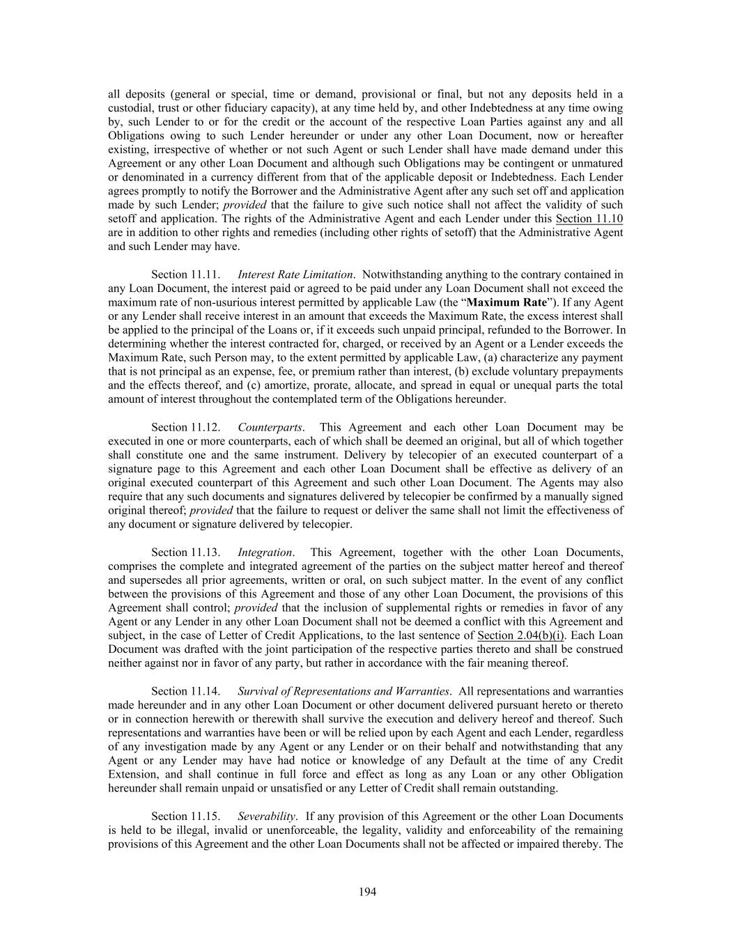 all deposits (general or special, time or demand, provisional or final, but not any deposits held in a custodial, trust or other fiduciary capacity), at any time held by, and other Indebtedness at any time owing by, such Lender to or for the credit or the account of the respective Loan Parties against any and all Obligations owing to such Lender hereunder or under any other Loan Document, now or hereafter existing, irrespective of whether or not such Agent or such Lender shall have made demand under this Agreement or any other Loan Document and although such Obligations may be contingent or unmatured or denominated in a currency different from that of the applicable deposit or Indebtedness. Each Lender agrees promptly to notify the Borrower and the Administrative Agent after any such set off and application made by such Lender; provided that the failure to give such notice shall not affect the validity of such setoff and application. The rights of the Administrative Agent and each Lender under this Section 11.10 are in addition to other rights and remedies (including other rights of setoff) that the Administrative Agent and such Lender may have. Section 11.11. Interest Rate Limitation. Notwithstanding anything to the contrary contained in any Loan Document, the interest paid or agreed to be paid under any Loan Document shall not exceed the maximum rate of non-usurious interest permitted by applicable Law (the “Maximum Rate”). If any Agent or any Lender shall receive interest in an amount that exceeds the Maximum Rate, the excess interest shall be applied to the principal of the Loans or, if it exceeds such unpaid principal, refunded to the Borrower. In determining whether the interest contracted for, charged, or received by an Agent or a Lender exceeds the Maximum Rate, such Person may, to the extent permitted by applicable Law, (a) characterize any payment that is not principal as an expense, fee, or premium rather than interest, (b) exclude voluntary prepayments and the effects thereof, and (c) amortize, prorate, allocate, and spread in equal or unequal parts the total amount of interest throughout the contemplated term of the Obligations hereunder. Section 11.12. Counterparts. This Agreement and each other Loan Document may be executed in one or more counterparts, each of which shall be deemed an original, but all of which together shall constitute one and the same instrument. Delivery by telecopier of an executed counterpart of a signature page to this Agreement and each other Loan Document shall be effective as delivery of an original executed counterpart of this Agreement and such other Loan Document. The Agents may also require that any such documents and signatures delivered by telecopier be confirmed by a manually signed original thereof; provided that the failure to request or deliver the same shall not limit the effectiveness of any document or signature delivered by telecopier. Section 11.13. Integration. This Agreement, together with the other Loan Documents, comprises the complete and integrated agreement of the parties on the subject matter hereof and thereof and supersedes all prior agreements, written or oral, on such subject matter. In the event of any conflict between the provisions of this Agreement and those of any other Loan Document, the provisions of this Agreement shall control; provided that the inclusion of supplemental rights or remedies in favor of any Agent or any Lender in any other Loan Document shall not be deemed a conflict with this Agreement and subject, in the case of Letter of Credit Applications, to the last sentence of Section 2.04(b)(i). Each Loan Document was drafted with the joint participation of the respective parties thereto and shall be construed neither against nor in favor of any party, but rather in accordance with the fair meaning thereof. Section 11.14. Survival of Representations and Warranties. All representations and warranties made hereunder and in any other Loan Document or other document delivered pursuant hereto or thereto or in connection herewith or therewith shall survive the execution and delivery hereof and thereof. Such representations and warranties have been or will be relied upon by each Agent and each Lender, regardless of any investigation made by any Agent or any Lender or on their behalf and notwithstanding that any Agent or any Lender may have had notice or knowledge of any Default at the time of any Credit Extension, and shall continue in full force and effect as long as any Loan or any other Obligation hereunder shall remain unpaid or unsatisfied or any Letter of Credit shall remain outstanding. Section 11.15. Severability. If any provision of this Agreement or the other Loan Documents is held to be illegal, invalid or unenforceable, the legality, validity and enforceability of the remaining provisions of this Agreement and the other Loan Documents shall not be affected or impaired thereby. The 194