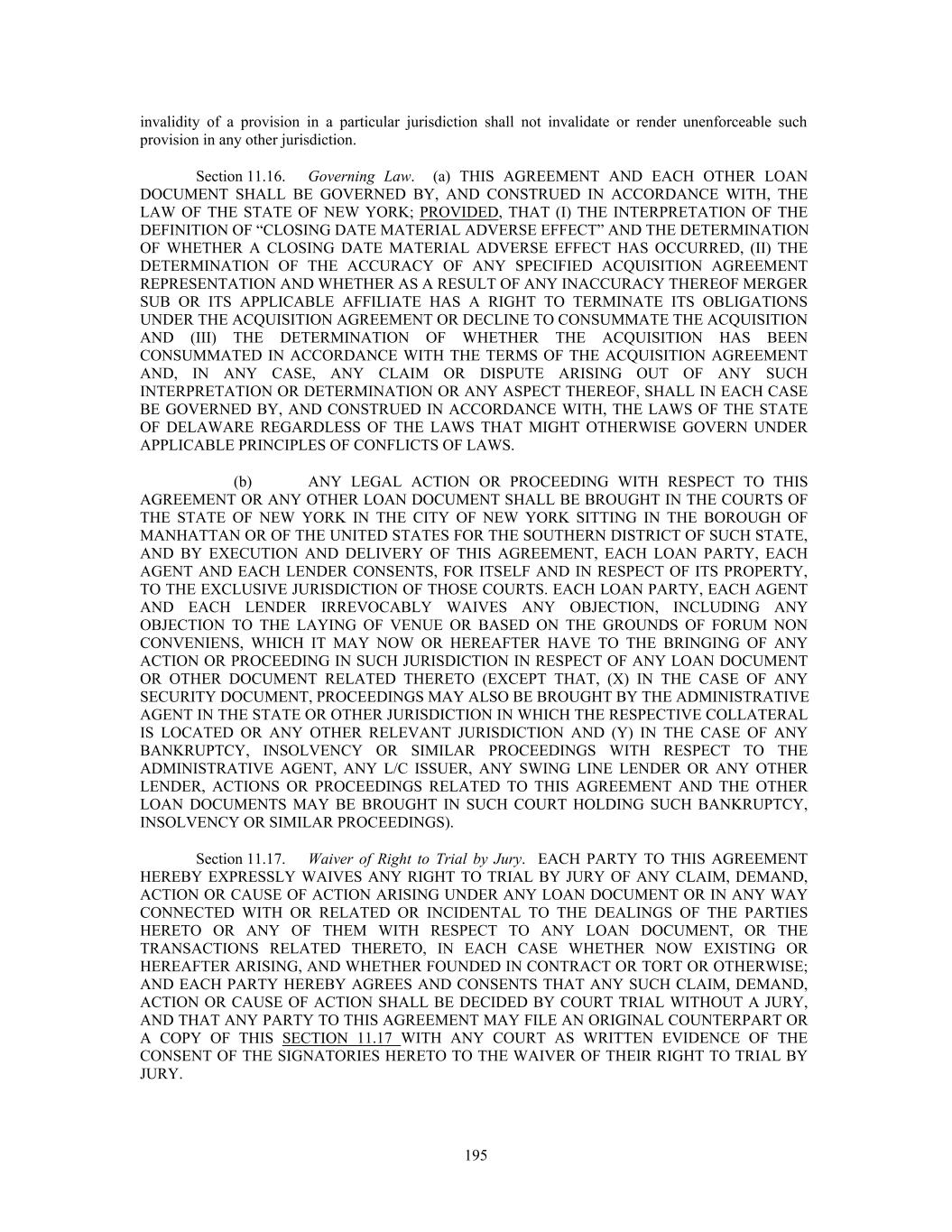 invalidity of a provision in a particular jurisdiction shall not invalidate or render unenforceable such provision in any other jurisdiction. Section 11.16. Governing Law. (a) THIS AGREEMENT AND EACH OTHER LOAN DOCUMENT SHALL BE GOVERNED BY, AND CONSTRUED IN ACCORDANCE WITH, THE LAW OF THE STATE OF NEW YORK; PROVIDED, THAT (I) THE INTERPRETATION OF THE DEFINITION OF “CLOSING DATE MATERIAL ADVERSE EFFECT” AND THE DETERMINATION OF WHETHER A CLOSING DATE MATERIAL ADVERSE EFFECT HAS OCCURRED, (II) THE DETERMINATION OF THE ACCURACY OF ANY SPECIFIED ACQUISITION AGREEMENT REPRESENTATION AND WHETHER AS A RESULT OF ANY INACCURACY THEREOF MERGER SUB OR ITS APPLICABLE AFFILIATE HAS A RIGHT TO TERMINATE ITS OBLIGATIONS UNDER THE ACQUISITION AGREEMENT OR DECLINE TO CONSUMMATE THE ACQUISITION AND (III) THE DETERMINATION OF WHETHER THE ACQUISITION HAS BEEN CONSUMMATED IN ACCORDANCE WITH THE TERMS OF THE ACQUISITION AGREEMENT AND, IN ANY CASE, ANY CLAIM OR DISPUTE ARISING OUT OF ANY SUCH INTERPRETATION OR DETERMINATION OR ANY ASPECT THEREOF, SHALL IN EACH CASE BE GOVERNED BY, AND CONSTRUED IN ACCORDANCE WITH, THE LAWS OF THE STATE OF DELAWARE REGARDLESS OF THE LAWS THAT MIGHT OTHERWISE GOVERN UNDER APPLICABLE PRINCIPLES OF CONFLICTS OF LAWS. (b) ANY LEGAL ACTION OR PROCEEDING WITH RESPECT TO THIS AGREEMENT OR ANY OTHER LOAN DOCUMENT SHALL BE BROUGHT IN THE COURTS OF THE STATE OF NEW YORK IN THE CITY OF NEW YORK SITTING IN THE BOROUGH OF MANHATTAN OR OF THE UNITED STATES FOR THE SOUTHERN DISTRICT OF SUCH STATE, AND BY EXECUTION AND DELIVERY OF THIS AGREEMENT, EACH LOAN PARTY, EACH AGENT AND EACH LENDER CONSENTS, FOR ITSELF AND IN RESPECT OF ITS PROPERTY, TO THE EXCLUSIVE JURISDICTION OF THOSE COURTS. EACH LOAN PARTY, EACH AGENT AND EACH LENDER IRREVOCABLY WAIVES ANY OBJECTION, INCLUDING ANY OBJECTION TO THE LAYING OF VENUE OR BASED ON THE GROUNDS OF FORUM NON CONVENIENS, WHICH IT MAY NOW OR HEREAFTER HAVE TO THE BRINGING OF ANY ACTION OR PROCEEDING IN SUCH JURISDICTION IN RESPECT OF ANY LOAN DOCUMENT OR OTHER DOCUMENT RELATED THERETO (EXCEPT THAT, (X) IN THE CASE OF ANY SECURITY DOCUMENT, PROCEEDINGS MAY ALSO BE BROUGHT BY THE ADMINISTRATIVE AGENT IN THE STATE OR OTHER JURISDICTION IN WHICH THE RESPECTIVE COLLATERAL IS LOCATED OR ANY OTHER RELEVANT JURISDICTION AND (Y) IN THE CASE OF ANY BANKRUPTCY, INSOLVENCY OR SIMILAR PROCEEDINGS WITH RESPECT TO THE ADMINISTRATIVE AGENT, ANY L/C ISSUER, ANY SWING LINE LENDER OR ANY OTHER LENDER, ACTIONS OR PROCEEDINGS RELATED TO THIS AGREEMENT AND THE OTHER LOAN DOCUMENTS MAY BE BROUGHT IN SUCH COURT HOLDING SUCH BANKRUPTCY, INSOLVENCY OR SIMILAR PROCEEDINGS). Section 11.17. Waiver of Right to Trial by Jury. EACH PARTY TO THIS AGREEMENT HEREBY EXPRESSLY WAIVES ANY RIGHT TO TRIAL BY JURY OF ANY CLAIM, DEMAND, ACTION OR CAUSE OF ACTION ARISING UNDER ANY LOAN DOCUMENT OR IN ANY WAY CONNECTED WITH OR RELATED OR INCIDENTAL TO THE DEALINGS OF THE PARTIES HERETO OR ANY OF THEM WITH RESPECT TO ANY LOAN DOCUMENT, OR THE TRANSACTIONS RELATED THERETO, IN EACH CASE WHETHER NOW EXISTING OR HEREAFTER ARISING, AND WHETHER FOUNDED IN CONTRACT OR TORT OR OTHERWISE; AND EACH PARTY HEREBY AGREES AND CONSENTS THAT ANY SUCH CLAIM, DEMAND, ACTION OR CAUSE OF ACTION SHALL BE DECIDED BY COURT TRIAL WITHOUT A JURY, AND THAT ANY PARTY TO THIS AGREEMENT MAY FILE AN ORIGINAL COUNTERPART OR A COPY OF THIS SECTION 11.17 WITH ANY COURT AS WRITTEN EVIDENCE OF THE CONSENT OF THE SIGNATORIES HERETO TO THE WAIVER OF THEIR RIGHT TO TRIAL BY JURY. 195