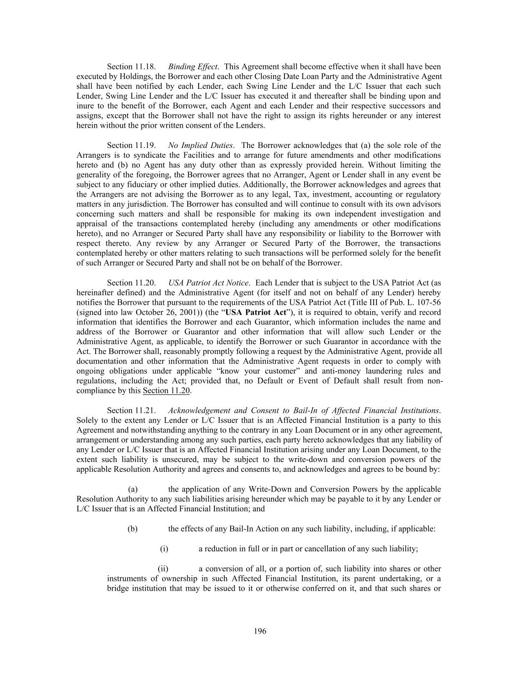 Section 11.18. Binding Effect. This Agreement shall become effective when it shall have been executed by Holdings, the Borrower and each other Closing Date Loan Party and the Administrative Agent shall have been notified by each Lender, each Swing Line Lender and the L/C Issuer that each such Lender, Swing Line Lender and the L/C Issuer has executed it and thereafter shall be binding upon and inure to the benefit of the Borrower, each Agent and each Lender and their respective successors and assigns, except that the Borrower shall not have the right to assign its rights hereunder or any interest herein without the prior written consent of the Lenders. Section 11.19. No Implied Duties. The Borrower acknowledges that (a) the sole role of the Arrangers is to syndicate the Facilities and to arrange for future amendments and other modifications hereto and (b) no Agent has any duty other than as expressly provided herein. Without limiting the generality of the foregoing, the Borrower agrees that no Arranger, Agent or Lender shall in any event be subject to any fiduciary or other implied duties. Additionally, the Borrower acknowledges and agrees that the Arrangers are not advising the Borrower as to any legal, Tax, investment, accounting or regulatory matters in any jurisdiction. The Borrower has consulted and will continue to consult with its own advisors concerning such matters and shall be responsible for making its own independent investigation and appraisal of the transactions contemplated hereby (including any amendments or other modifications hereto), and no Arranger or Secured Party shall have any responsibility or liability to the Borrower with respect thereto. Any review by any Arranger or Secured Party of the Borrower, the transactions contemplated hereby or other matters relating to such transactions will be performed solely for the benefit of such Arranger or Secured Party and shall not be on behalf of the Borrower. Section 11.20. USA Patriot Act Notice. Each Lender that is subject to the USA Patriot Act (as hereinafter defined) and the Administrative Agent (for itself and not on behalf of any Lender) hereby notifies the Borrower that pursuant to the requirements of the USA Patriot Act (Title III of Pub. L. 107-56 (signed into law October 26, 2001)) (the “USA Patriot Act”), it is required to obtain, verify and record information that identifies the Borrower and each Guarantor, which information includes the name and address of the Borrower or Guarantor and other information that will allow such Lender or the Administrative Agent, as applicable, to identify the Borrower or such Guarantor in accordance with the Act. The Borrower shall, reasonably promptly following a request by the Administrative Agent, provide all documentation and other information that the Administrative Agent requests in order to comply with ongoing obligations under applicable “know your customer” and anti-money laundering rules and regulations, including the Act; provided that, no Default or Event of Default shall result from non- compliance by this Section 11.20. Section 11.21. Acknowledgement and Consent to Bail-In of Affected Financial Institutions. Solely to the extent any Lender or L/C Issuer that is an Affected Financial Institution is a party to this Agreement and notwithstanding anything to the contrary in any Loan Document or in any other agreement, arrangement or understanding among any such parties, each party hereto acknowledges that any liability of any Lender or L/C Issuer that is an Affected Financial Institution arising under any Loan Document, to the extent such liability is unsecured, may be subject to the write-down and conversion powers of the applicable Resolution Authority and agrees and consents to, and acknowledges and agrees to be bound by: (a) the application of any Write-Down and Conversion Powers by the applicable Resolution Authority to any such liabilities arising hereunder which may be payable to it by any Lender or L/C Issuer that is an Affected Financial Institution; and (b) the effects of any Bail-In Action on any such liability, including, if applicable: (i) a reduction in full or in part or cancellation of any such liability; (ii) a conversion of all, or a portion of, such liability into shares or other instruments of ownership in such Affected Financial Institution, its parent undertaking, or a bridge institution that may be issued to it or otherwise conferred on it, and that such shares or 196