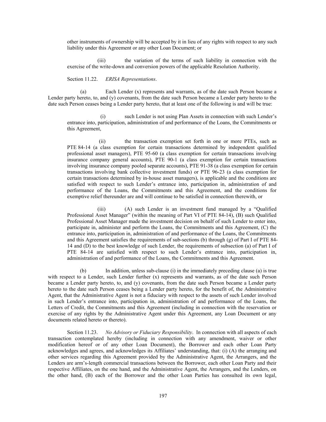 other instruments of ownership will be accepted by it in lieu of any rights with respect to any such liability under this Agreement or any other Loan Document; or (iii) the variation of the terms of such liability in connection with the exercise of the write-down and conversion powers of the applicable Resolution Authority. Section 11.22. ERISA Representations. (a) Each Lender (x) represents and warrants, as of the date such Person became a Lender party hereto, to, and (y) covenants, from the date such Person became a Lender party hereto to the date such Person ceases being a Lender party hereto, that at least one of the following is and will be true: (i) such Lender is not using Plan Assets in connection with such Lender’s entrance into, participation, administration of and performance of the Loans, the Commitments or this Agreement, (ii) the transaction exemption set forth in one or more PTEs, such as PTE 84-14 (a class exemption for certain transactions determined by independent qualified professional asset managers), PTE 95-60 (a class exemption for certain transactions involving insurance company general accounts), PTE 90-1 (a class exemption for certain transactions involving insurance company pooled separate accounts), PTE 91-38 (a class exemption for certain transactions involving bank collective investment funds) or PTE 96-23 (a class exemption for certain transactions determined by in-house asset managers), is applicable and the conditions are satisfied with respect to such Lender’s entrance into, participation in, administration of and performance of the Loans, the Commitments and this Agreement, and the conditions for exemptive relief thereunder are and will continue to be satisfied in connection therewith, or (iii) (A) such Lender is an investment fund managed by a “Qualified Professional Asset Manager” (within the meaning of Part VI of PTE 84-14), (B) such Qualified Professional Asset Manager made the investment decision on behalf of such Lender to enter into, participate in, administer and perform the Loans, the Commitments and this Agreement, (C) the entrance into, participation in, administration of and performance of the Loans, the Commitments and this Agreement satisfies the requirements of sub-sections (b) through (g) of Part I of PTE 84- 14 and (D) to the best knowledge of such Lender, the requirements of subsection (a) of Part I of PTE 84-14 are satisfied with respect to such Lender’s entrance into, participation in, administration of and performance of the Loans, the Commitments and this Agreement. (b) In addition, unless sub-clause (i) in the immediately preceding clause (a) is true with respect to a Lender, such Lender further (x) represents and warrants, as of the date such Person became a Lender party hereto, to, and (y) covenants, from the date such Person became a Lender party hereto to the date such Person ceases being a Lender party hereto, for the benefit of, the Administrative Agent, that the Administrative Agent is not a fiduciary with respect to the assets of such Lender involved in such Lender’s entrance into, participation in, administration of and performance of the Loans, the Letters of Credit, the Commitments and this Agreement (including in connection with the reservation or exercise of any rights by the Administrative Agent under this Agreement, any Loan Document or any documents related hereto or thereto). Section 11.23. No Advisory or Fiduciary Responsibility. In connection with all aspects of each transaction contemplated hereby (including in connection with any amendment, waiver or other modification hereof or of any other Loan Document), the Borrower and each other Loan Party acknowledges and agrees, and acknowledges its Affiliates’ understanding, that: (i) (A) the arranging and other services regarding this Agreement provided by the Administrative Agent, the Arrangers, and the Lenders are arm’s-length commercial transactions between the Borrower, each other Loan Party and their respective Affiliates, on the one hand, and the Administrative Agent, the Arrangers, and the Lenders, on the other hand, (B) each of the Borrower and the other Loan Parties has consulted its own legal, 197