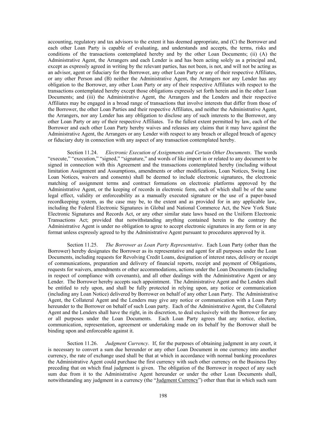 accounting, regulatory and tax advisors to the extent it has deemed appropriate, and (C) the Borrower and each other Loan Party is capable of evaluating, and understands and accepts, the terms, risks and conditions of the transactions contemplated hereby and by the other Loan Documents; (ii) (A) the Administrative Agent, the Arrangers and each Lender is and has been acting solely as a principal and, except as expressly agreed in writing by the relevant parties, has not been, is not, and will not be acting as an advisor, agent or fiduciary for the Borrower, any other Loan Party or any of their respective Affiliates, or any other Person and (B) neither the Administrative Agent, the Arrangers nor any Lender has any obligation to the Borrower, any other Loan Party or any of their respective Affiliates with respect to the transactions contemplated hereby except those obligations expressly set forth herein and in the other Loan Documents; and (iii) the Administrative Agent, the Arrangers and the Lenders and their respective Affiliates may be engaged in a broad range of transactions that involve interests that differ from those of the Borrower, the other Loan Parties and their respective Affiliates, and neither the Administrative Agent, the Arrangers, nor any Lender has any obligation to disclose any of such interests to the Borrower, any other Loan Party or any of their respective Affiliates. To the fullest extent permitted by law, each of the Borrower and each other Loan Party hereby waives and releases any claims that it may have against the Administrative Agent, the Arrangers or any Lender with respect to any breach or alleged breach of agency or fiduciary duty in connection with any aspect of any transaction contemplated hereby. Section 11.24. Electronic Execution of Assignments and Certain Other Documents. The words “execute,” “execution,” “signed,” “signature,” and words of like import in or related to any document to be signed in connection with this Agreement and the transactions contemplated hereby (including without limitation Assignment and Assumptions, amendments or other modifications, Loan Notices, Swing Line Loan Notices, waivers and consents) shall be deemed to include electronic signatures, the electronic matching of assignment terms and contract formations on electronic platforms approved by the Administrative Agent, or the keeping of records in electronic form, each of which shall be of the same legal effect, validity or enforceability as a manually executed signature or the use of a paper-based recordkeeping system, as the case may be, to the extent and as provided for in any applicable law, including the Federal Electronic Signatures in Global and National Commerce Act, the New York State Electronic Signatures and Records Act, or any other similar state laws based on the Uniform Electronic Transactions Act; provided that notwithstanding anything contained herein to the contrary the Administrative Agent is under no obligation to agree to accept electronic signatures in any form or in any format unless expressly agreed to by the Administrative Agent pursuant to procedures approved by it. Section 11.25. The Borrower as Loan Party Representative. Each Loan Party (other than the Borrower) hereby designates the Borrower as its representative and agent for all purposes under the Loan Documents, including requests for Revolving Credit Loans, designation of interest rates, delivery or receipt of communications, preparation and delivery of financial reports, receipt and payment of Obligations, requests for waivers, amendments or other accommodations, actions under the Loan Documents (including in respect of compliance with covenants), and all other dealings with the Administrative Agent or any Lender. The Borrower hereby accepts such appointment. The Administrative Agent and the Lenders shall be entitled to rely upon, and shall be fully protected in relying upon, any notice or communication (including any Loan Notice) delivered by Borrower on behalf of any other Loan Party. The Administrative Agent, the Collateral Agent and the Lenders may give any notice or communication with a Loan Party hereunder to the Borrower on behalf of such Loan party. Each of the Administrative Agent, the Collateral Agent and the Lenders shall have the right, in its discretion, to deal exclusively with the Borrower for any or all purposes under the Loan Documents. Each Loan Party agrees that any notice, election, communication, representation, agreement or undertaking made on its behalf by the Borrower shall be binding upon and enforceable against it. Section 11.26. Judgment Currency. If, for the purposes of obtaining judgment in any court, it is necessary to convert a sum due hereunder or any other Loan Document in one currency into another currency, the rate of exchange used shall be that at which in accordance with normal banking procedures the Administrative Agent could purchase the first currency with such other currency on the Business Day preceding that on which final judgment is given. The obligation of the Borrower in respect of any such sum due from it to the Administrative Agent hereunder or under the other Loan Documents shall, notwithstanding any judgment in a currency (the “Judgment Currency”) other than that in which such sum 198