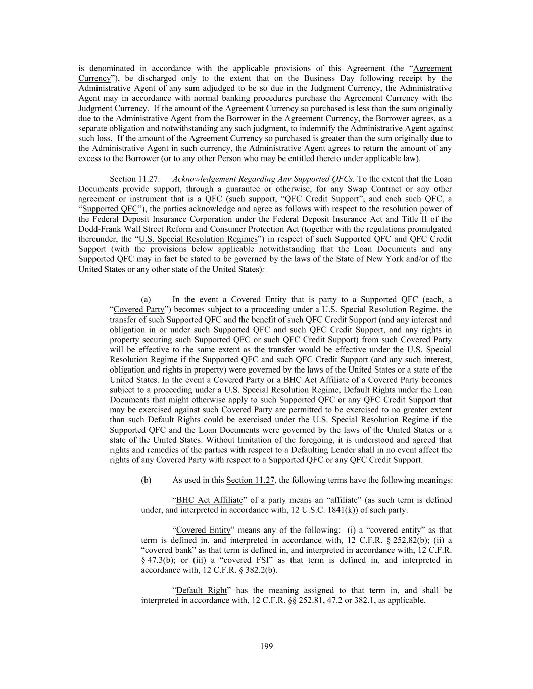 is denominated in accordance with the applicable provisions of this Agreement (the “Agreement Currency”), be discharged only to the extent that on the Business Day following receipt by the Administrative Agent of any sum adjudged to be so due in the Judgment Currency, the Administrative Agent may in accordance with normal banking procedures purchase the Agreement Currency with the Judgment Currency. If the amount of the Agreement Currency so purchased is less than the sum originally due to the Administrative Agent from the Borrower in the Agreement Currency, the Borrower agrees, as a separate obligation and notwithstanding any such judgment, to indemnify the Administrative Agent against such loss. If the amount of the Agreement Currency so purchased is greater than the sum originally due to the Administrative Agent in such currency, the Administrative Agent agrees to return the amount of any excess to the Borrower (or to any other Person who may be entitled thereto under applicable law). Section 11.27. Acknowledgement Regarding Any Supported QFCs. To the extent that the Loan Documents provide support, through a guarantee or otherwise, for any Swap Contract or any other agreement or instrument that is a QFC (such support, “QFC Credit Support”, and each such QFC, a “Supported QFC”), the parties acknowledge and agree as follows with respect to the resolution power of the Federal Deposit Insurance Corporation under the Federal Deposit Insurance Act and Title II of the Dodd-Frank Wall Street Reform and Consumer Protection Act (together with the regulations promulgated thereunder, the “U.S. Special Resolution Regimes”) in respect of such Supported QFC and QFC Credit Support (with the provisions below applicable notwithstanding that the Loan Documents and any Supported QFC may in fact be stated to be governed by the laws of the State of New York and/or of the United States or any other state of the United States): (a) In the event a Covered Entity that is party to a Supported QFC (each, a “Covered Party”) becomes subject to a proceeding under a U.S. Special Resolution Regime, the transfer of such Supported QFC and the benefit of such QFC Credit Support (and any interest and obligation in or under such Supported QFC and such QFC Credit Support, and any rights in property securing such Supported QFC or such QFC Credit Support) from such Covered Party will be effective to the same extent as the transfer would be effective under the U.S. Special Resolution Regime if the Supported QFC and such QFC Credit Support (and any such interest, obligation and rights in property) were governed by the laws of the United States or a state of the United States. In the event a Covered Party or a BHC Act Affiliate of a Covered Party becomes subject to a proceeding under a U.S. Special Resolution Regime, Default Rights under the Loan Documents that might otherwise apply to such Supported QFC or any QFC Credit Support that may be exercised against such Covered Party are permitted to be exercised to no greater extent than such Default Rights could be exercised under the U.S. Special Resolution Regime if the Supported QFC and the Loan Documents were governed by the laws of the United States or a state of the United States. Without limitation of the foregoing, it is understood and agreed that rights and remedies of the parties with respect to a Defaulting Lender shall in no event affect the rights of any Covered Party with respect to a Supported QFC or any QFC Credit Support. (b) As used in this Section 11.27, the following terms have the following meanings: “BHC Act Affiliate” of a party means an “affiliate” (as such term is defined under, and interpreted in accordance with, 12 U.S.C. 1841(k)) of such party. “Covered Entity” means any of the following: (i) a “covered entity” as that term is defined in, and interpreted in accordance with, 12 C.F.R. § 252.82(b); (ii) a “covered bank” as that term is defined in, and interpreted in accordance with, 12 C.F.R. § 47.3(b); or (iii) a “covered FSI” as that term is defined in, and interpreted in accordance with, 12 C.F.R. § 382.2(b). “Default Right” has the meaning assigned to that term in, and shall be interpreted in accordance with, 12 C.F.R. §§ 252.81, 47.2 or 382.1, as applicable. 199