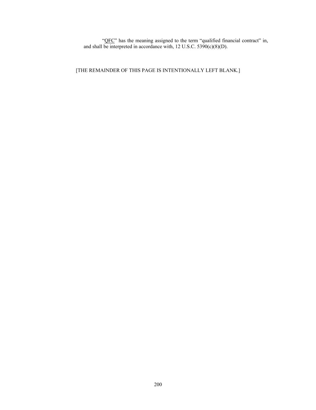 “QFC” has the meaning assigned to the term “qualified financial contract” in, and shall be interpreted in accordance with, 12 U.S.C. 5390(c)(8)(D). [THE REMAINDER OF THIS PAGE IS INTENTIONALLY LEFT BLANK.] 200